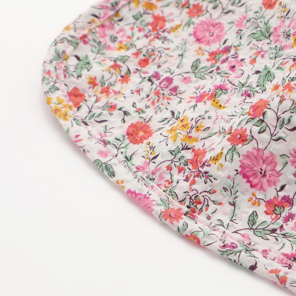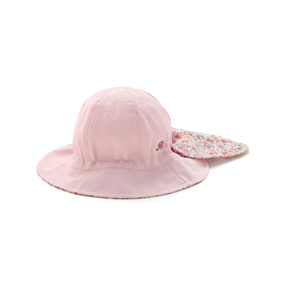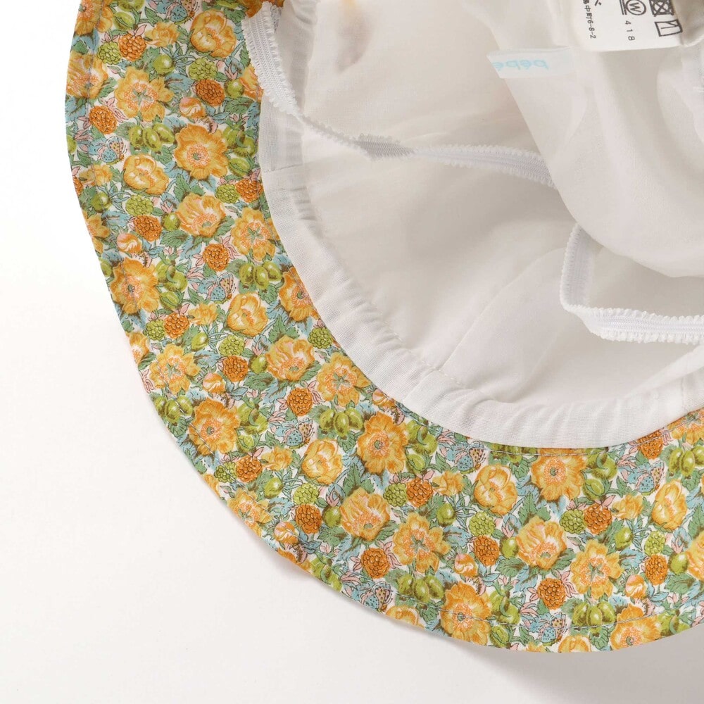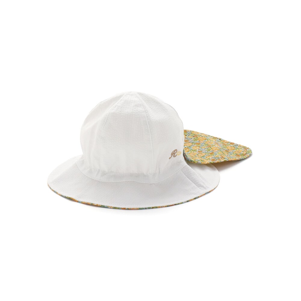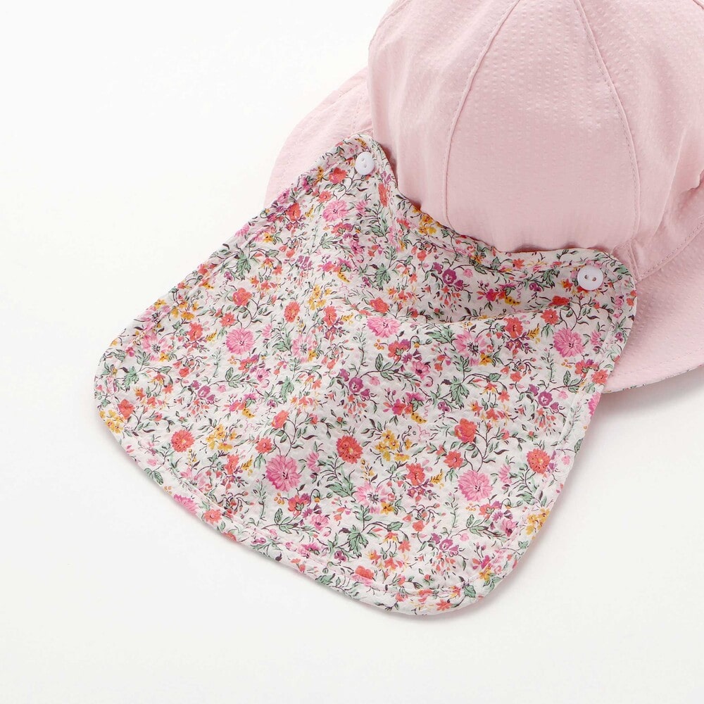 リバティプリントの可愛い花柄を部分使いした日よけ付きの女の子用ハットです。
