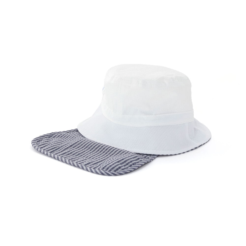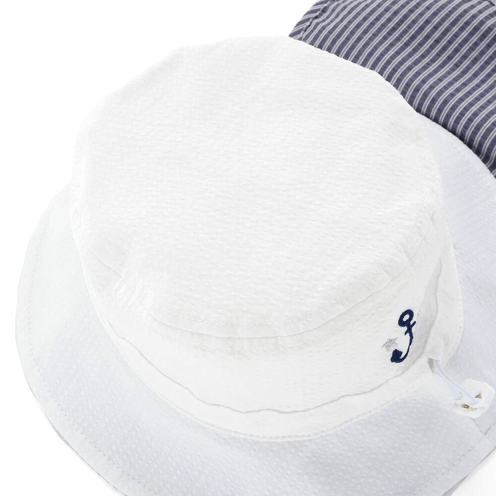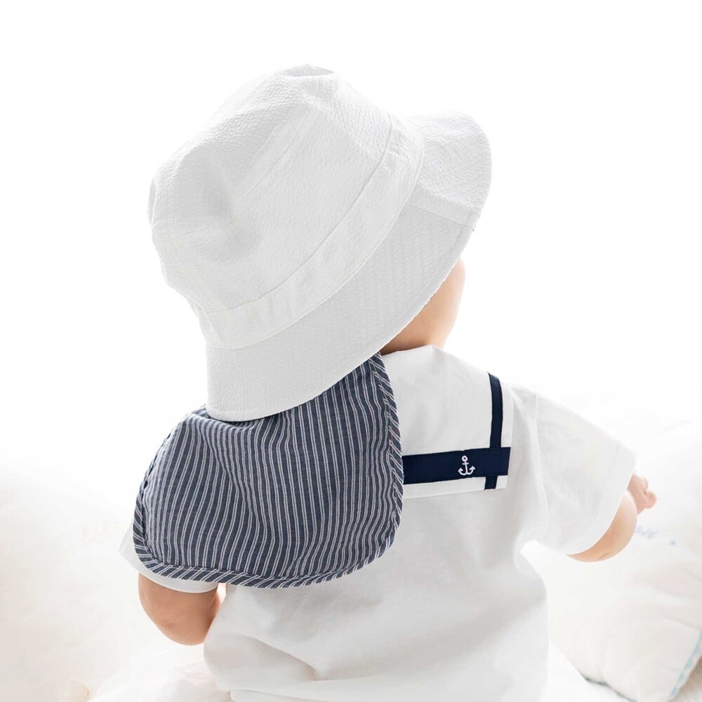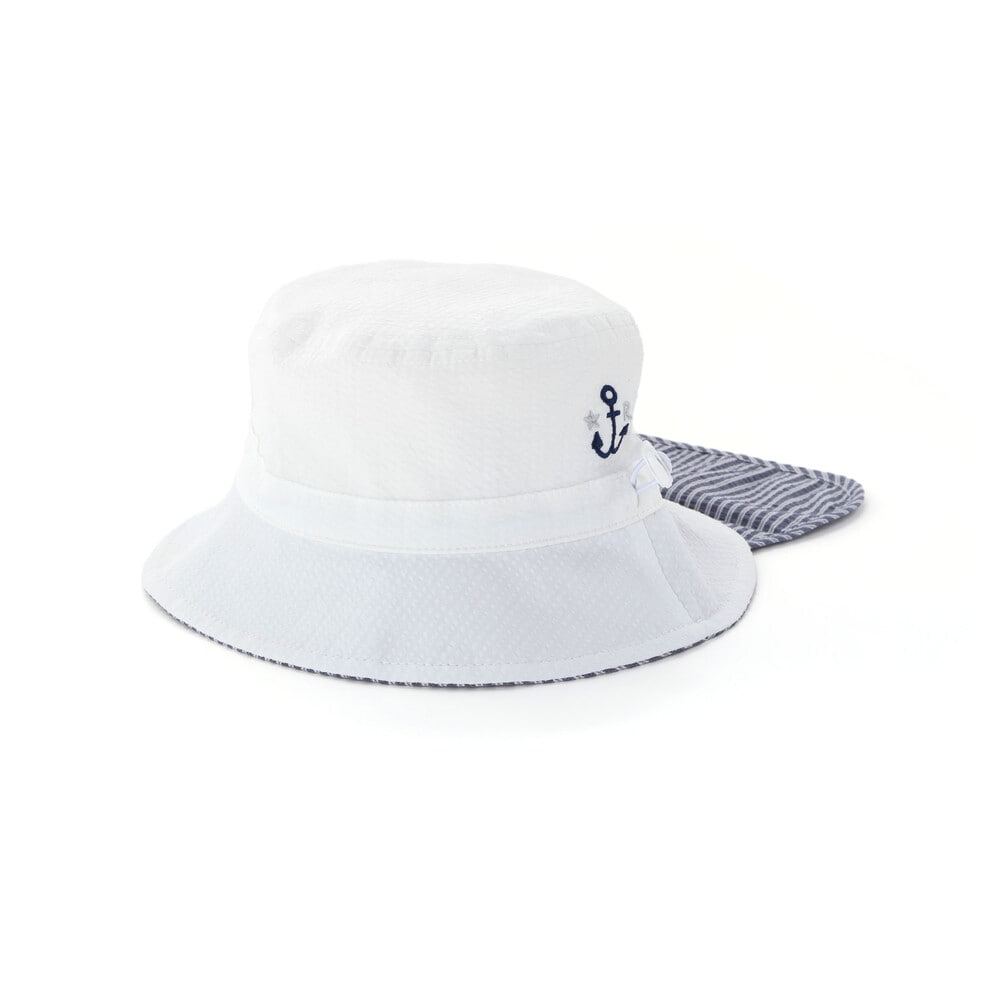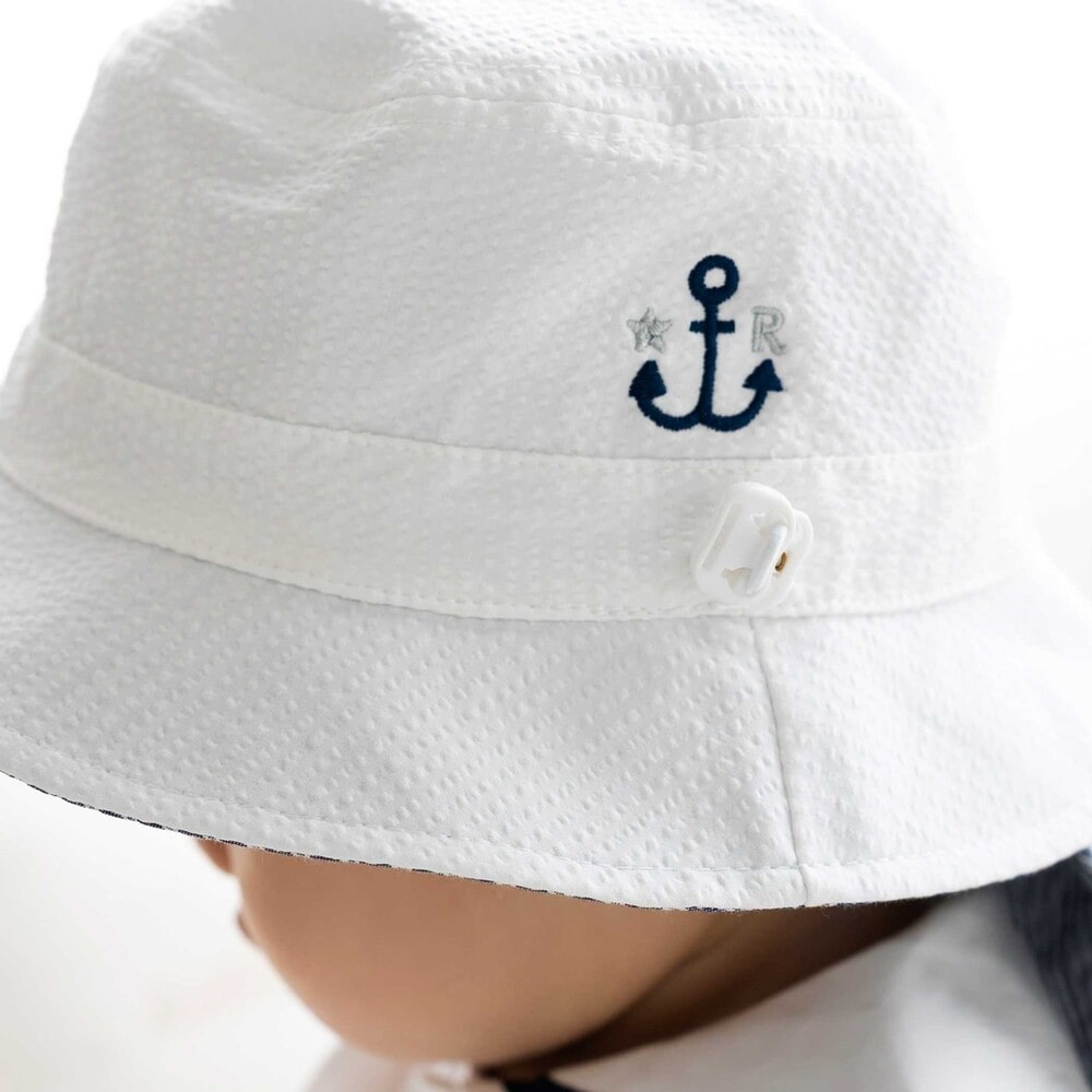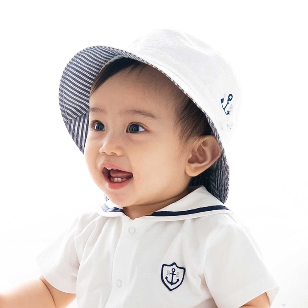 UVカット加工のサッカー素材を使用した、通気性が良く機能的な男女兼用ベビー用マリンハットです。