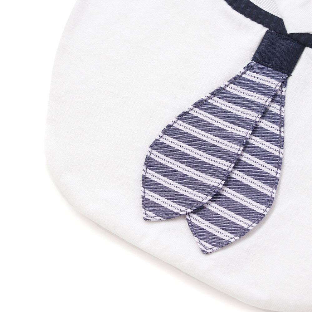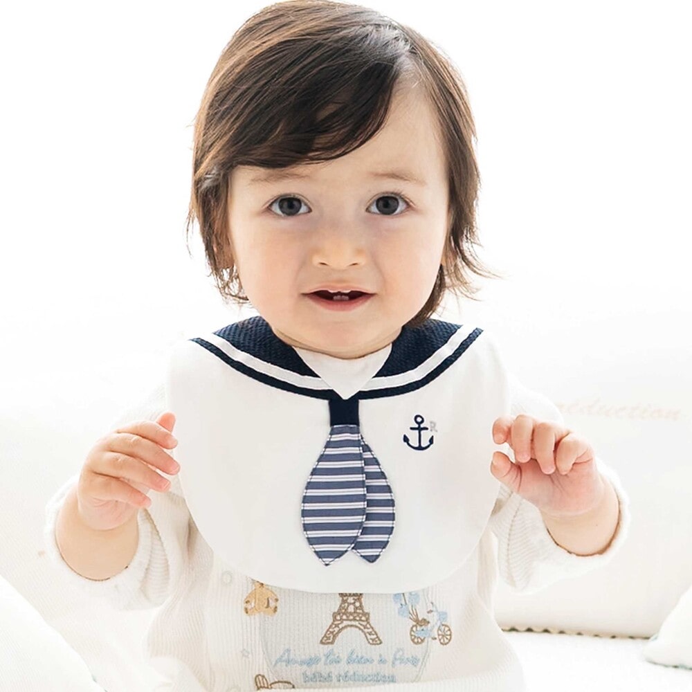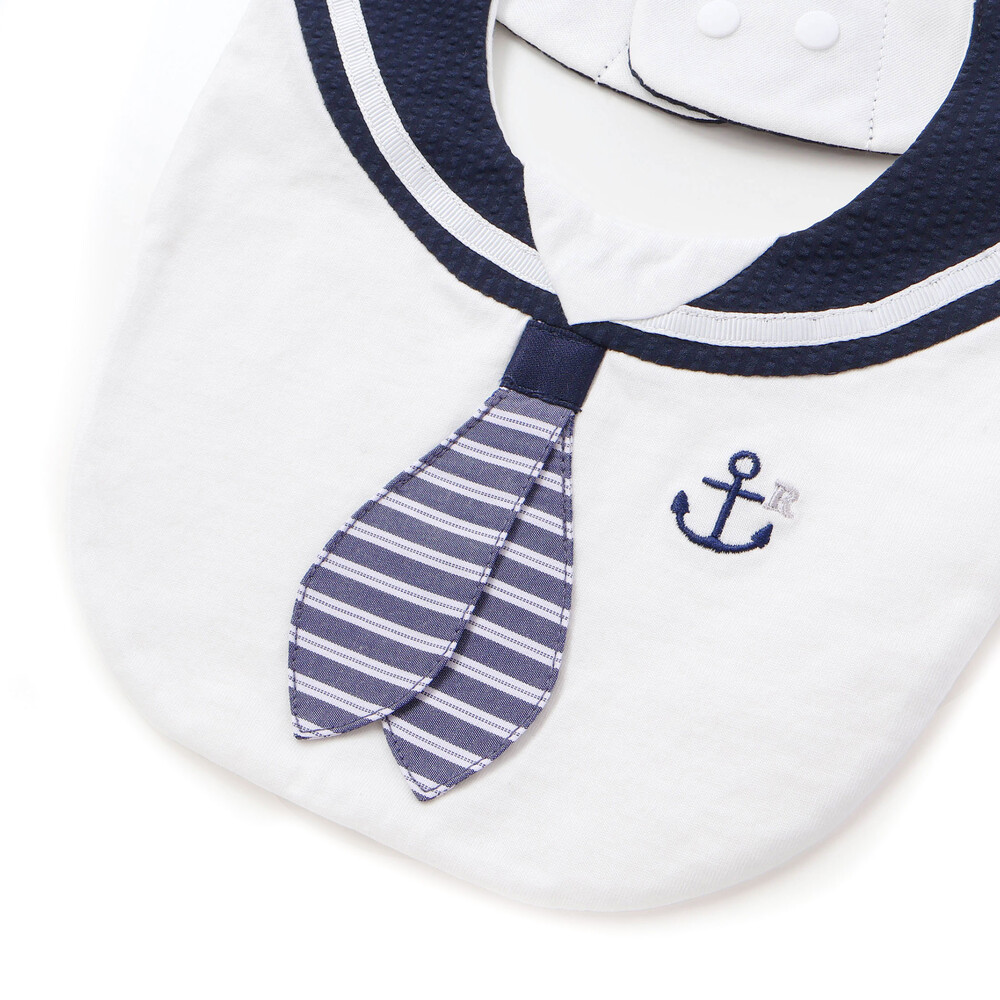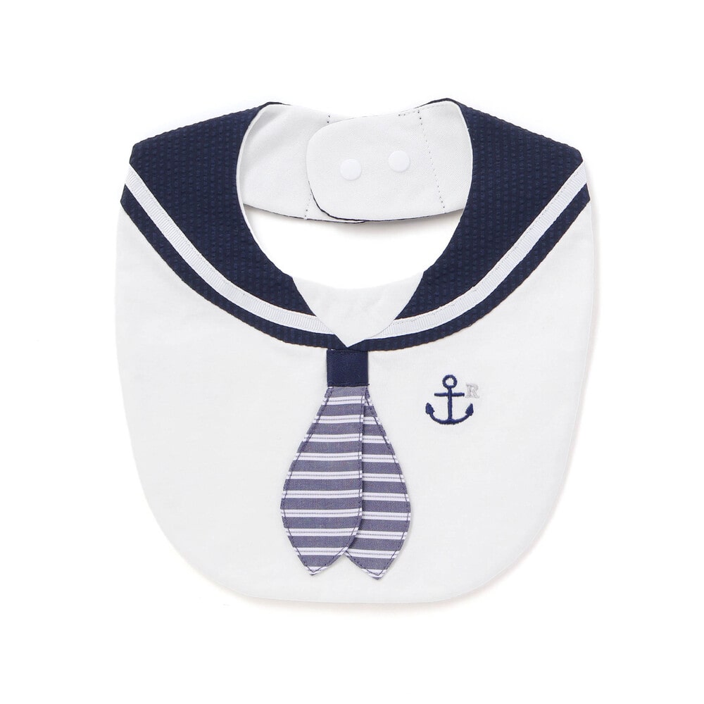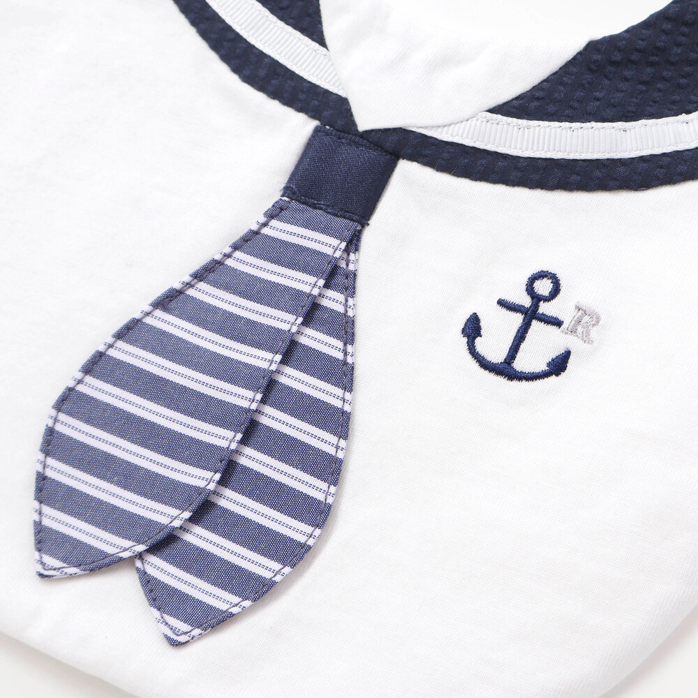 セーラー襟とチェックのタイが目を引く、洗練されたホワイトの男の子ベビー用マリンスタイです。