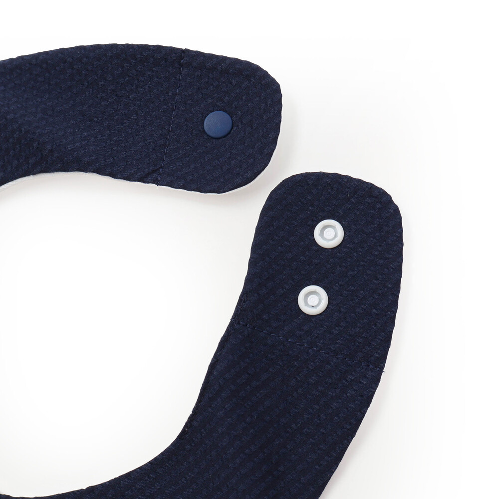 着脱は首元のホックで行うことができ、お子様の成長に合わせて2段階のサイズ調節が可能な機能性も備えています。