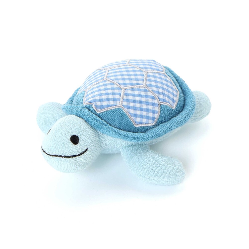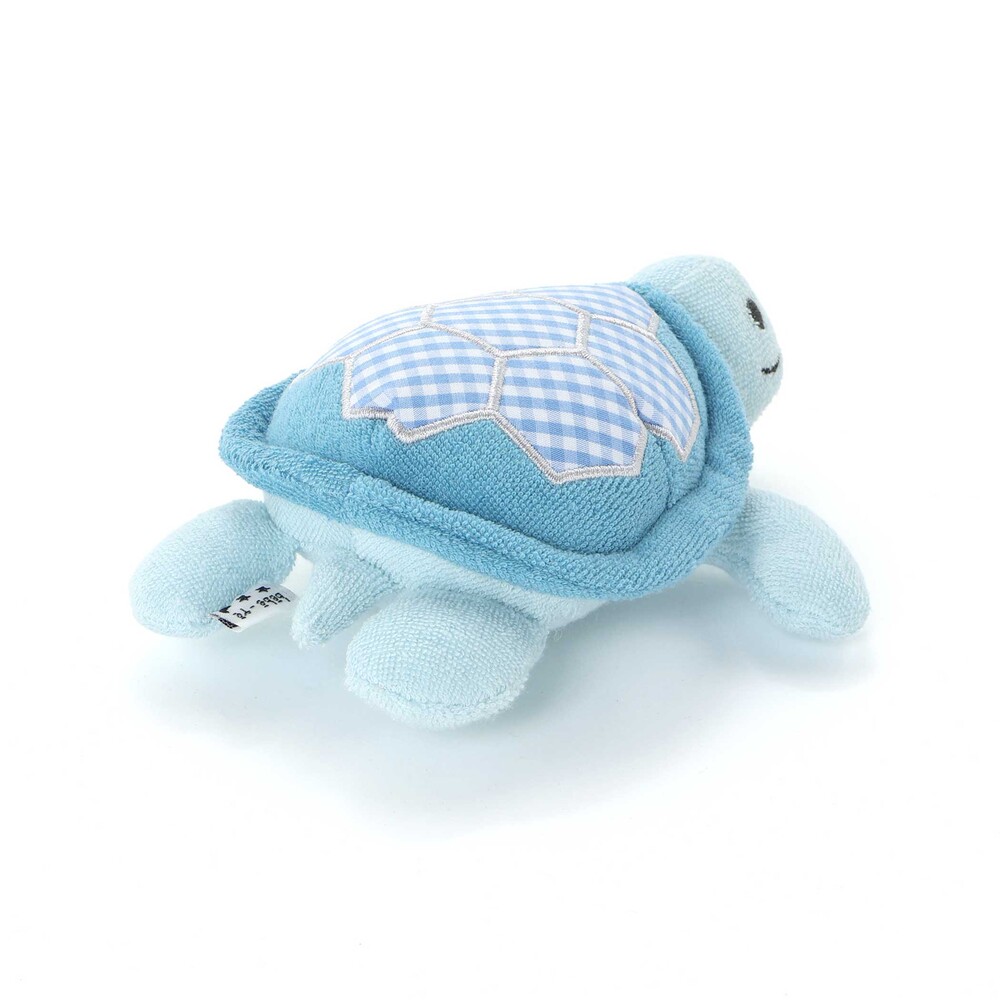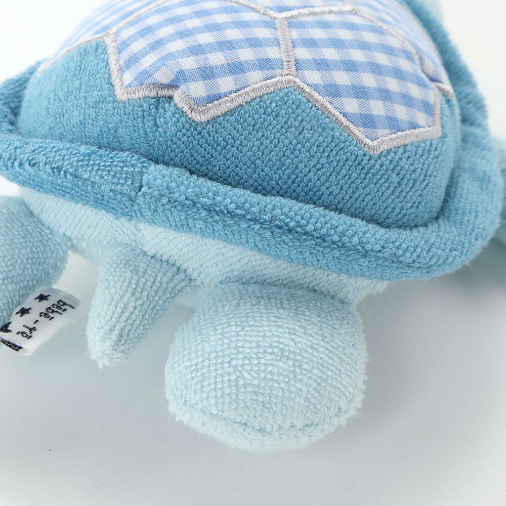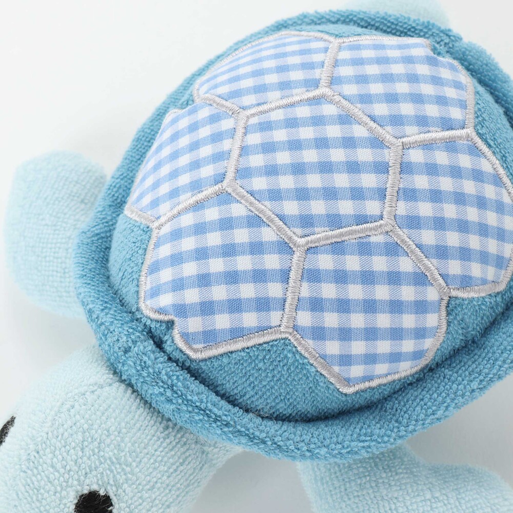 ブルーの身生地に、水色系のギンガムチェックをパッチワークのように施した、優しい色使いのカメさん型ラトルです。