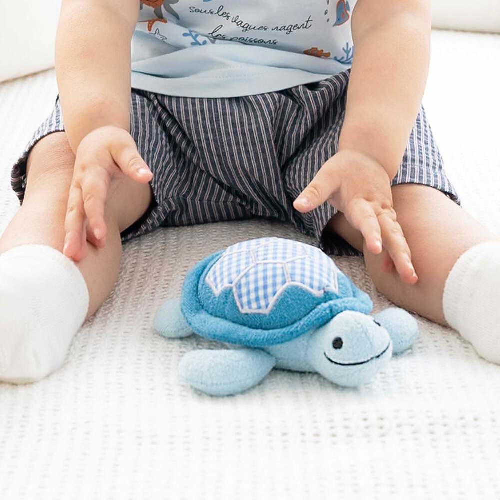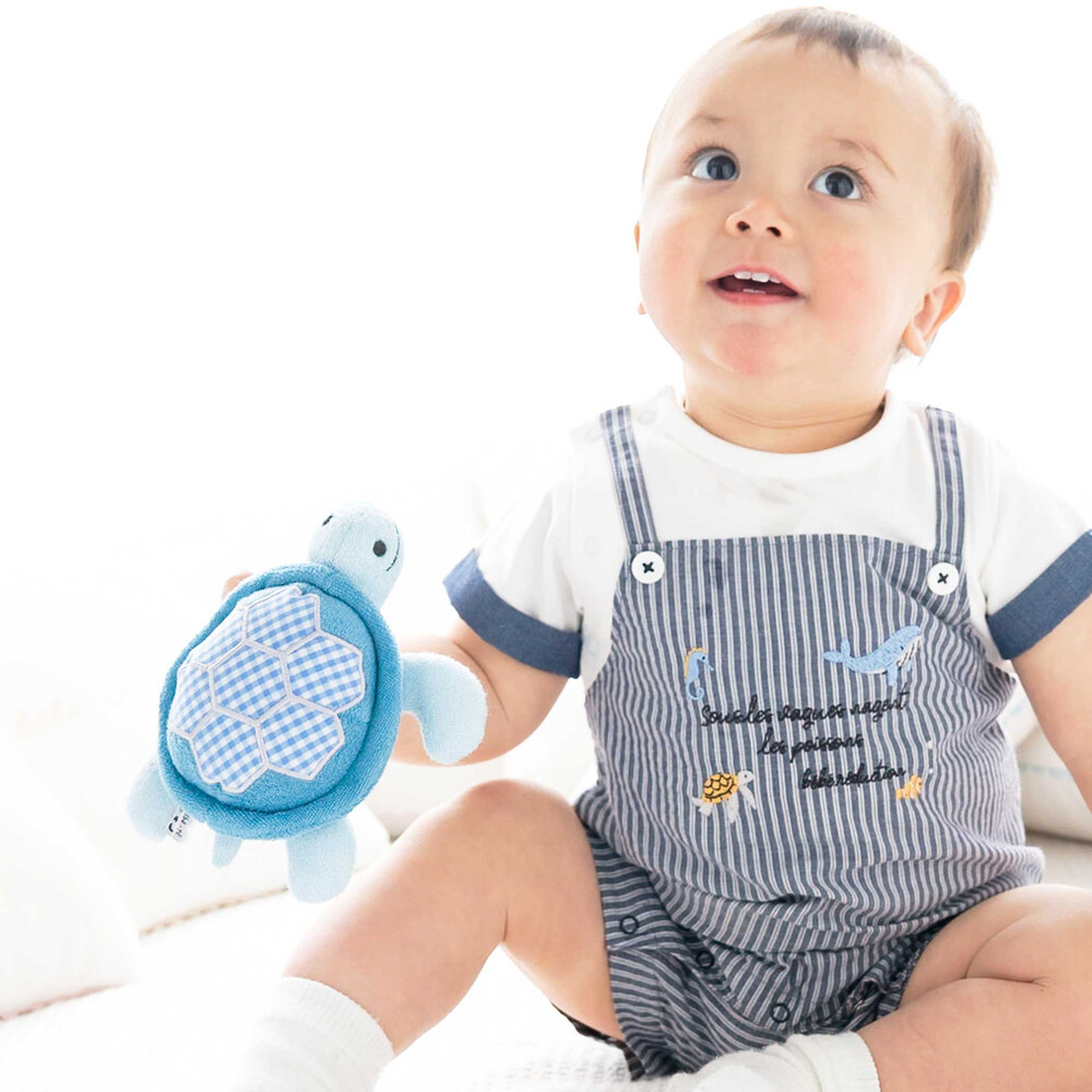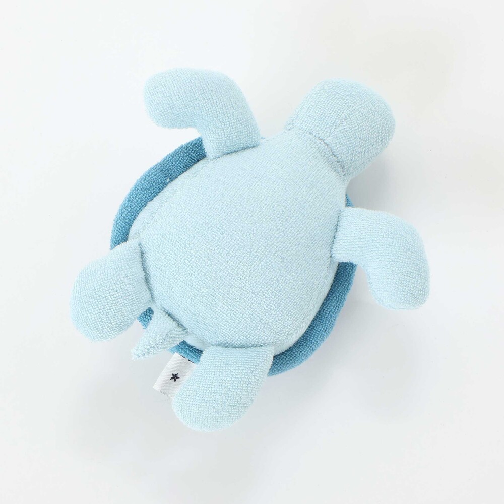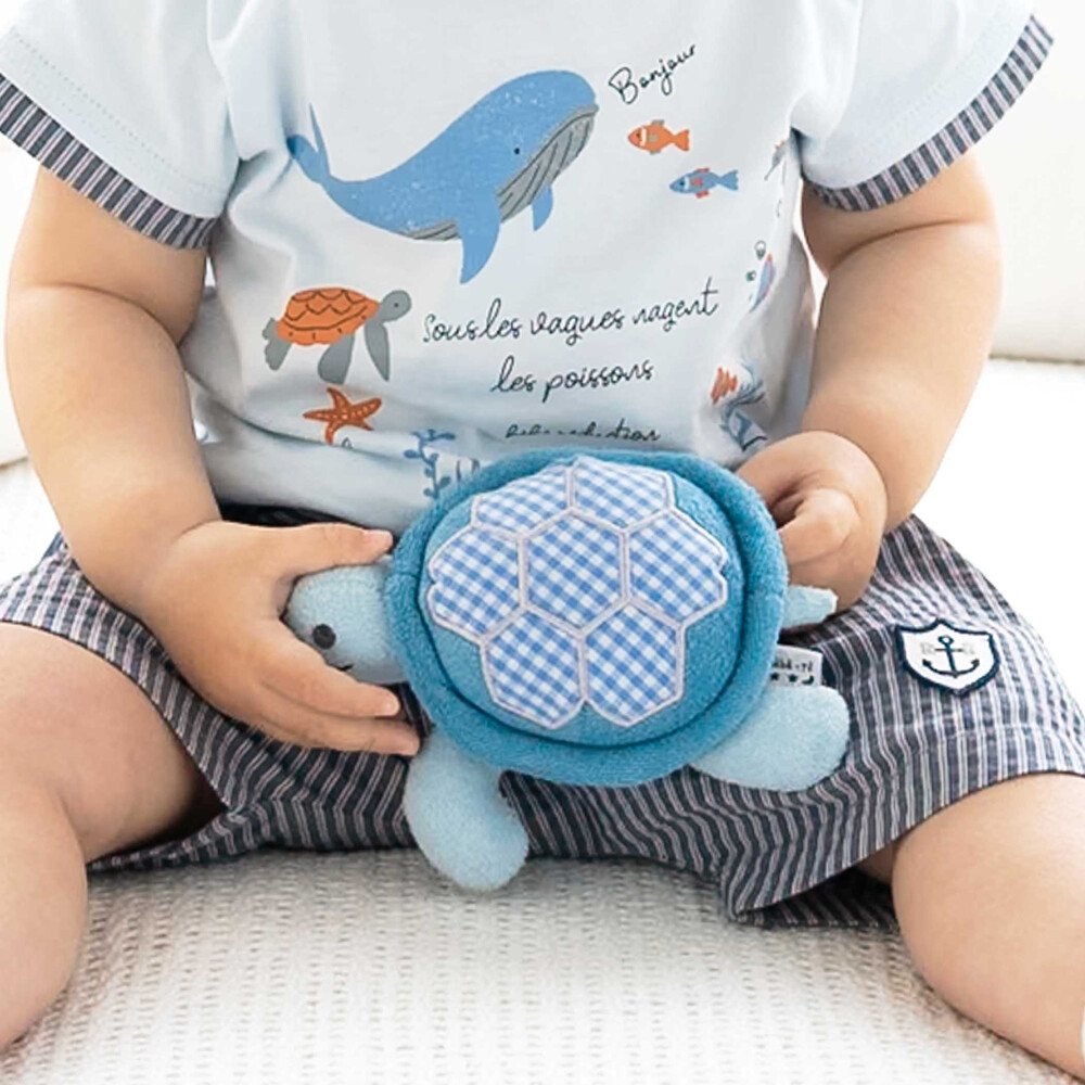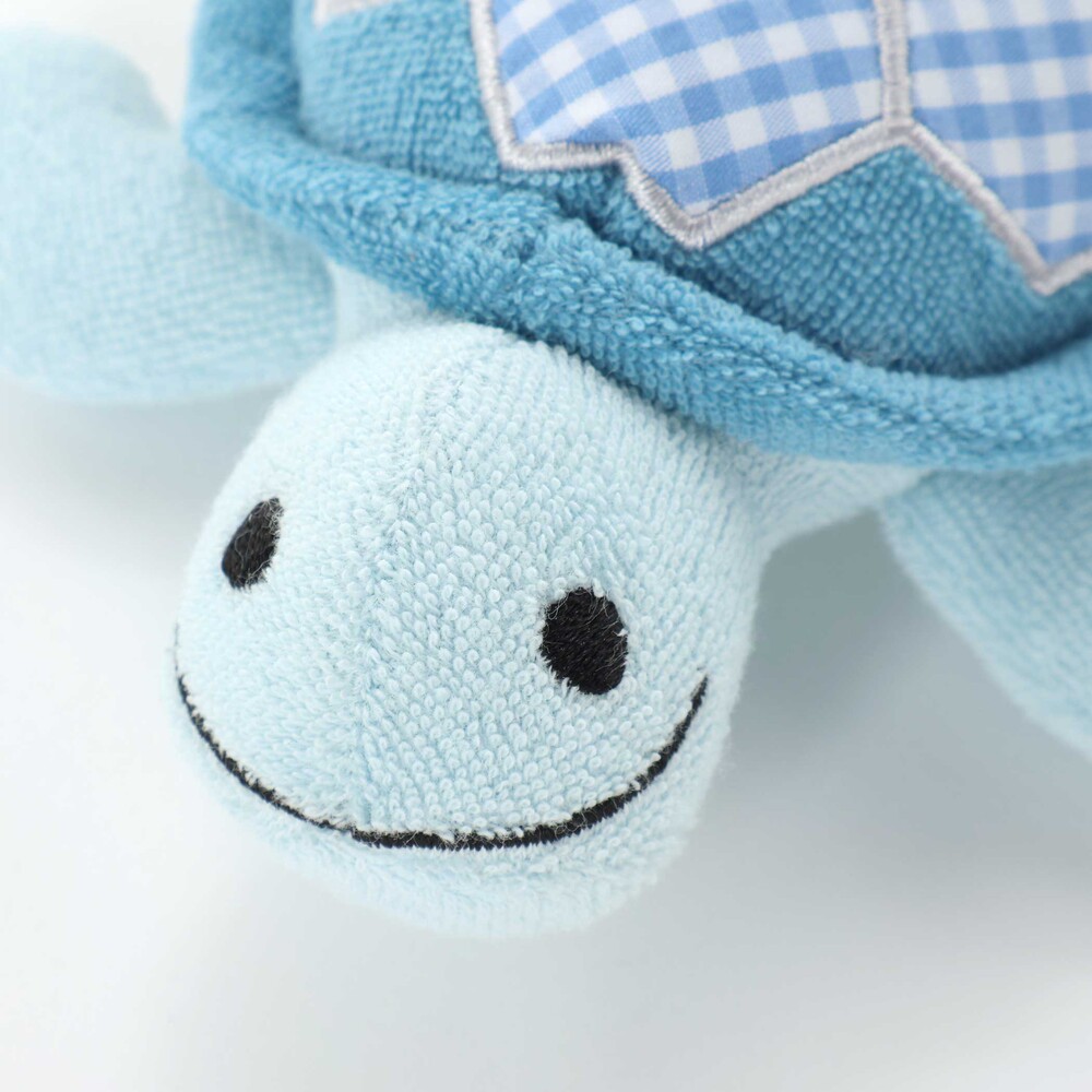 ブルーの身生地に、水色系のギンガムチェックをパッチワークのように施した、優しい色使いのカメさん型ラトルです。