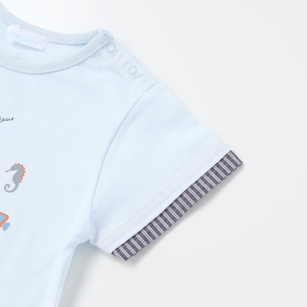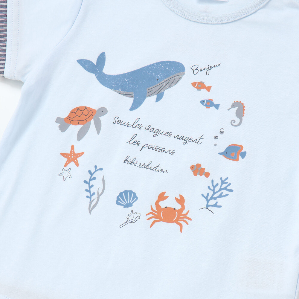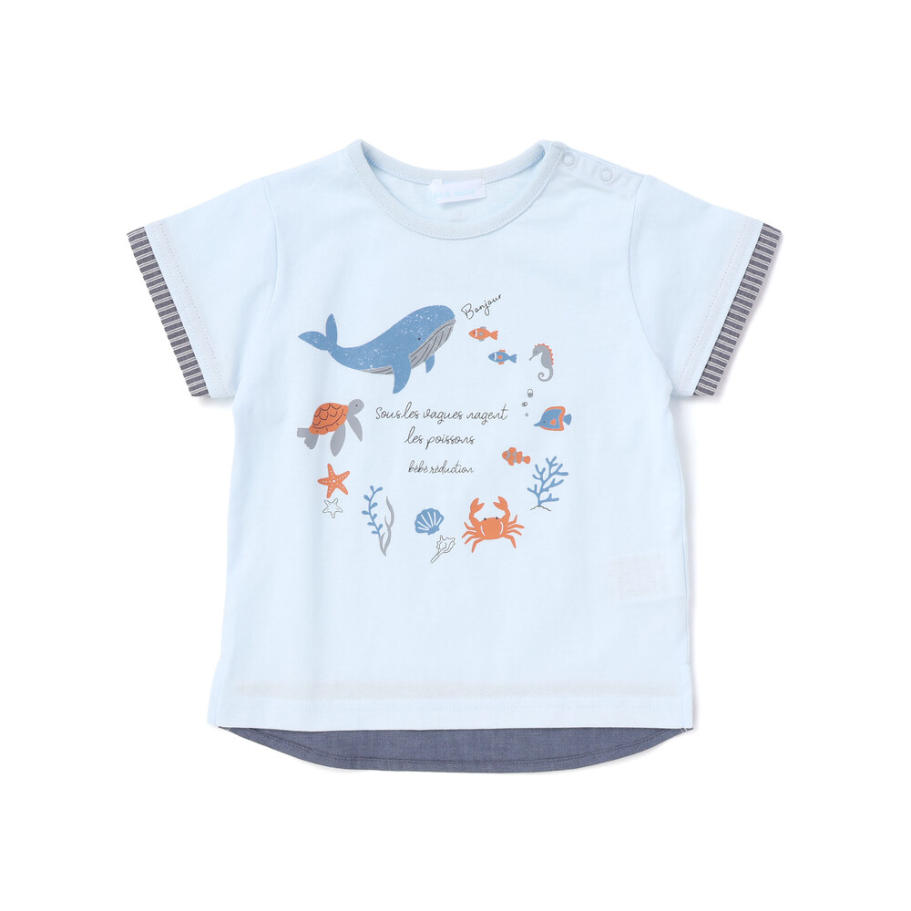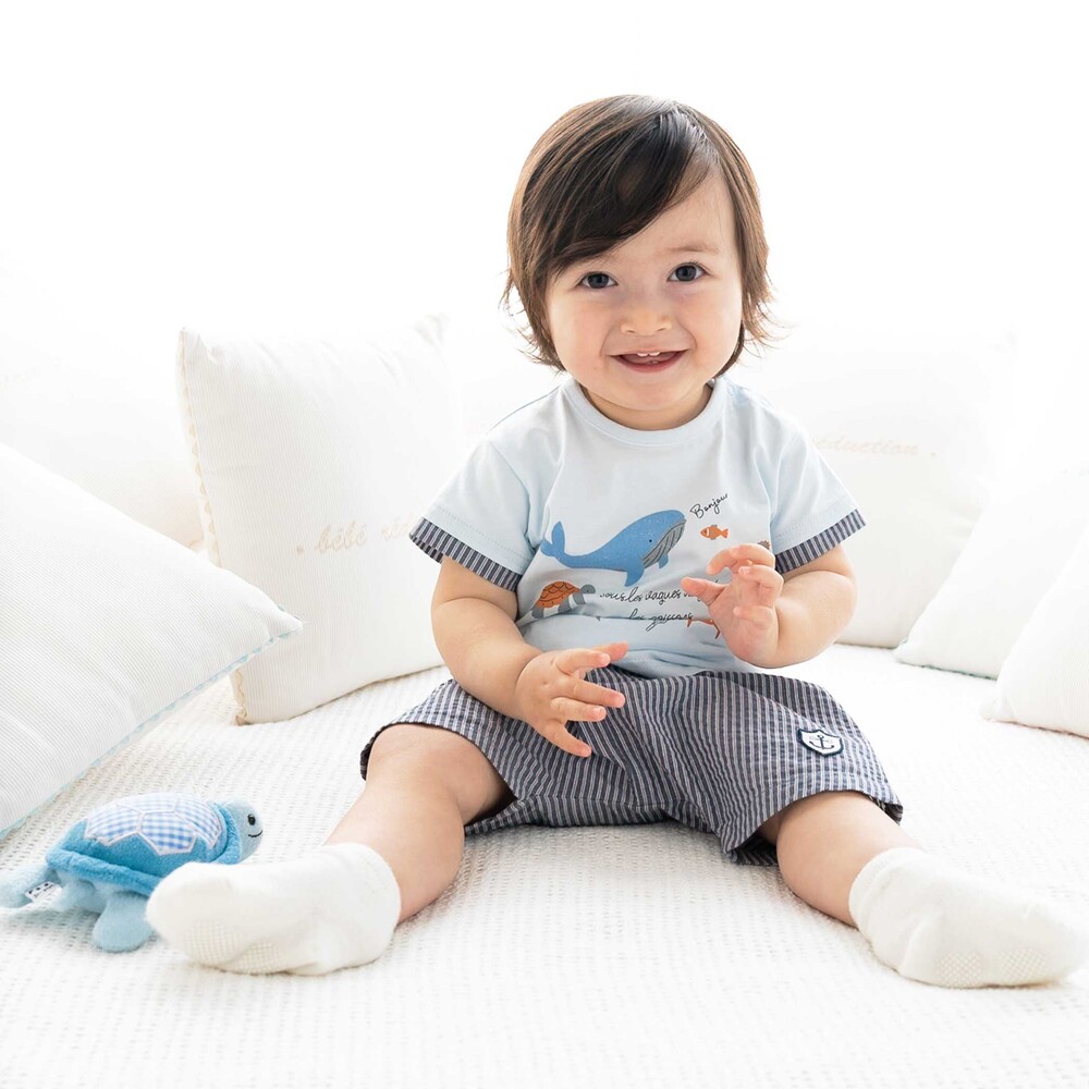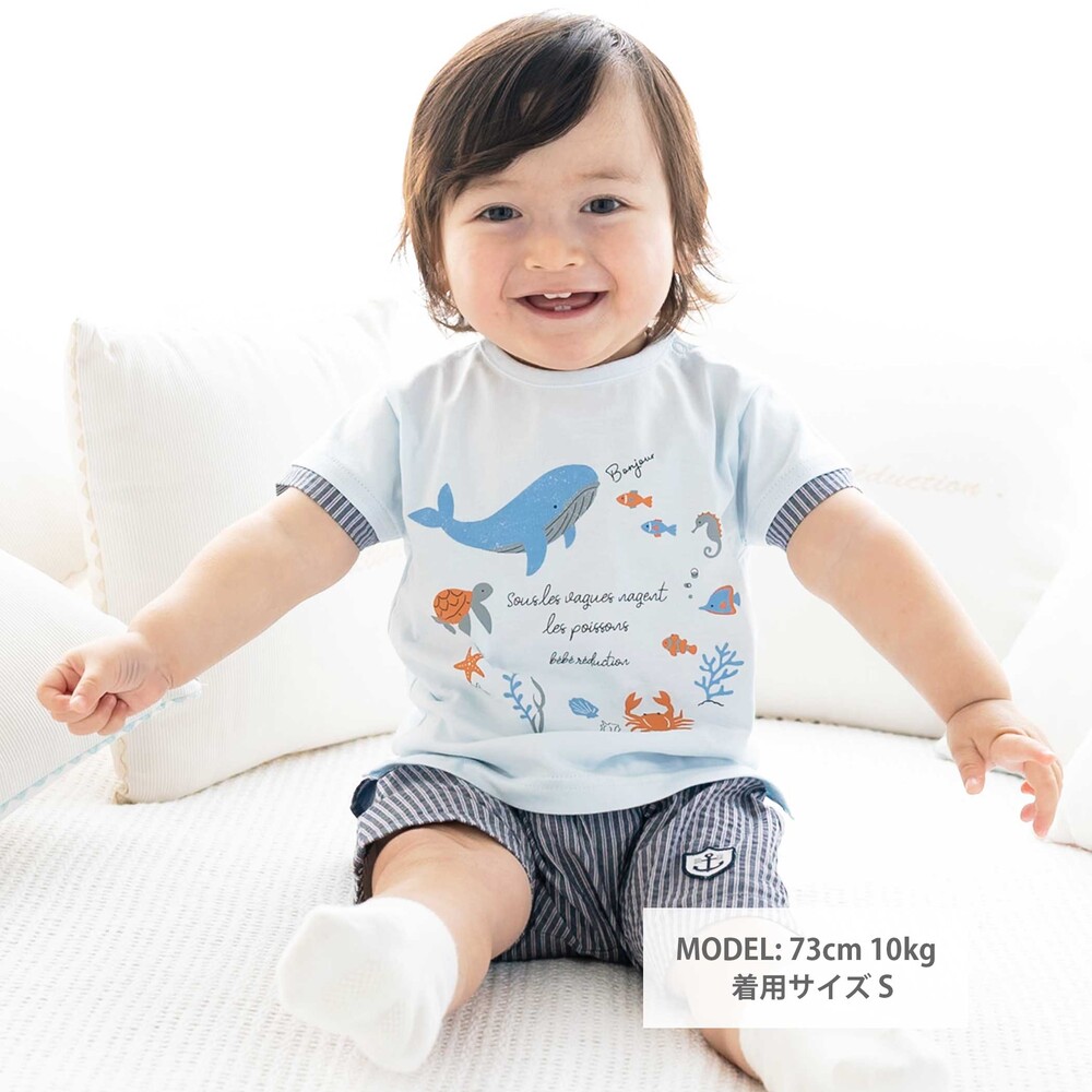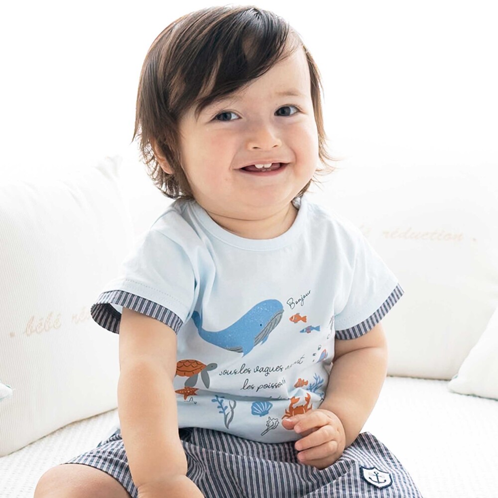 クジラや海の仲間たちのプリントが楽しい、爽やかなマリンスタイルの男の子ベビー用半袖Tシャツです。
