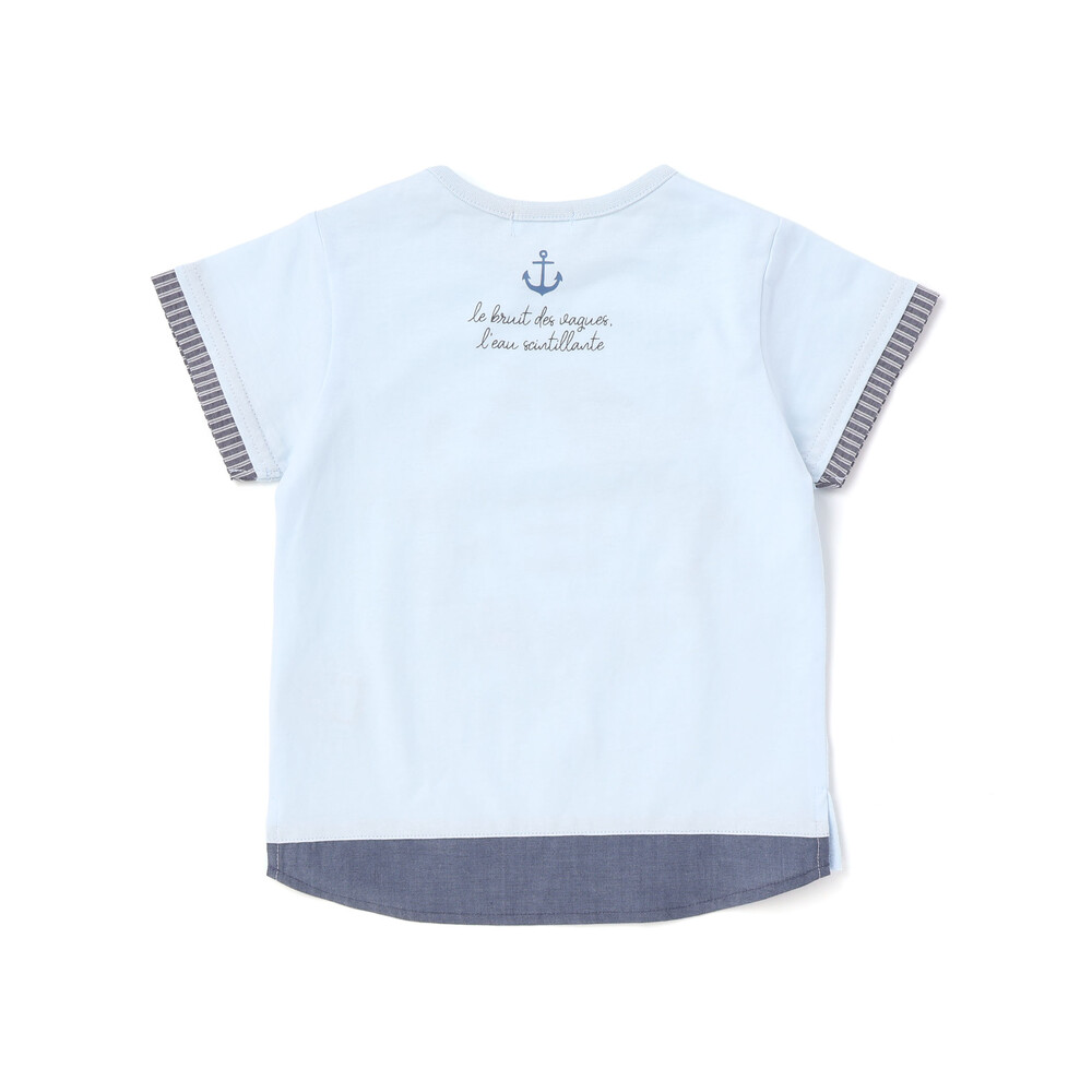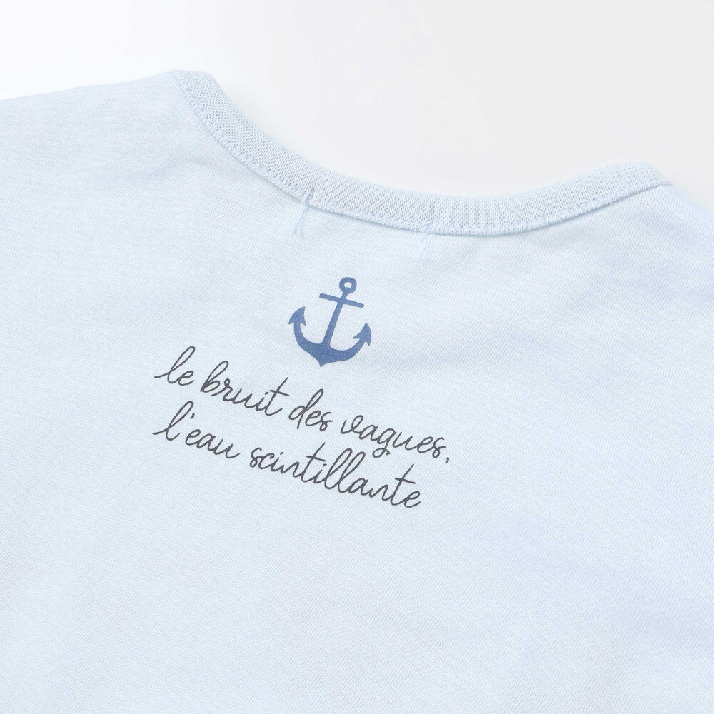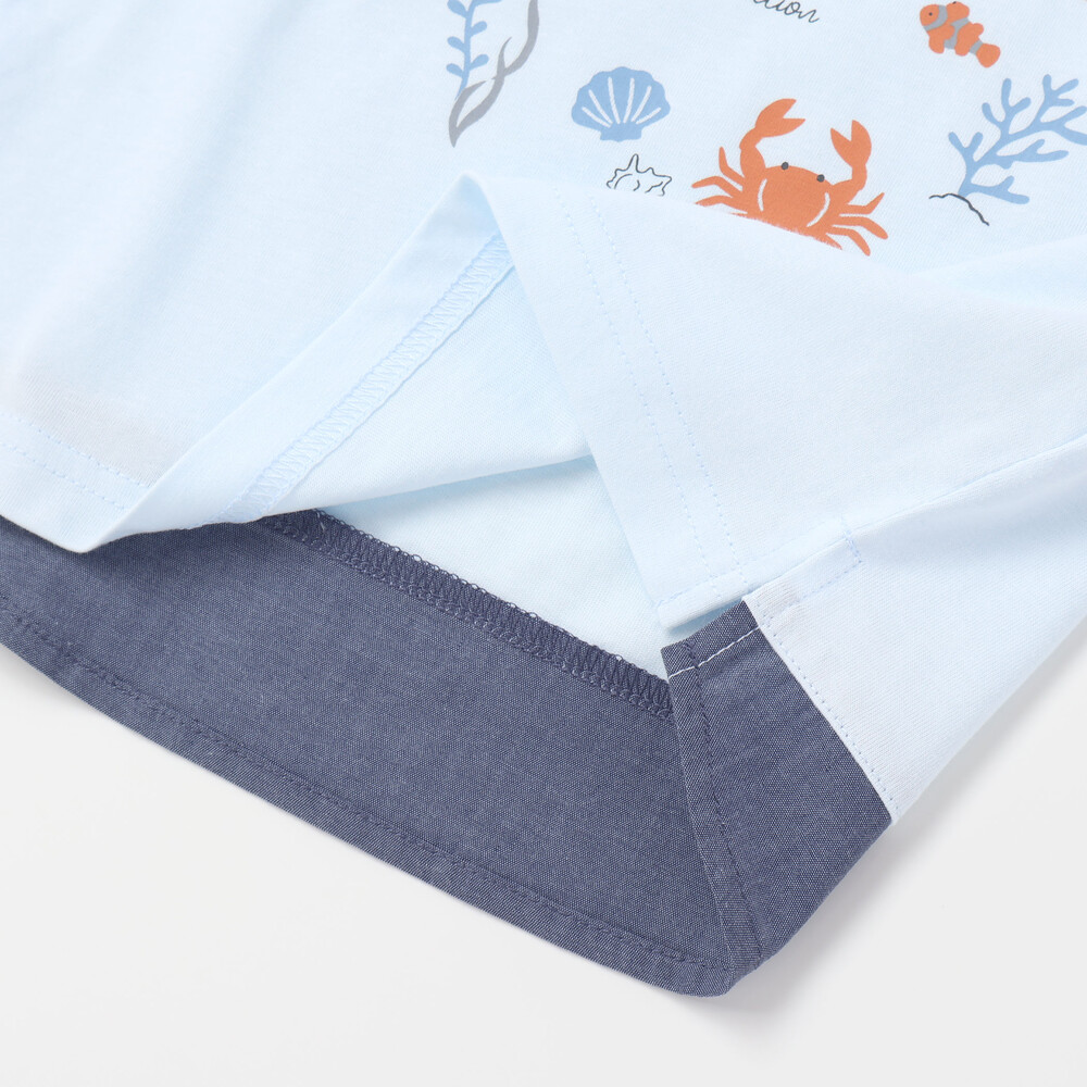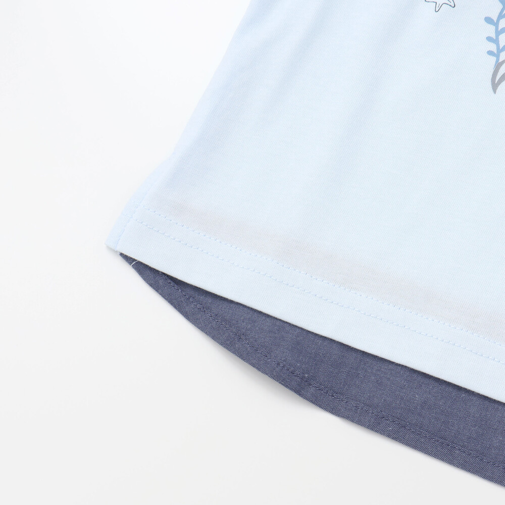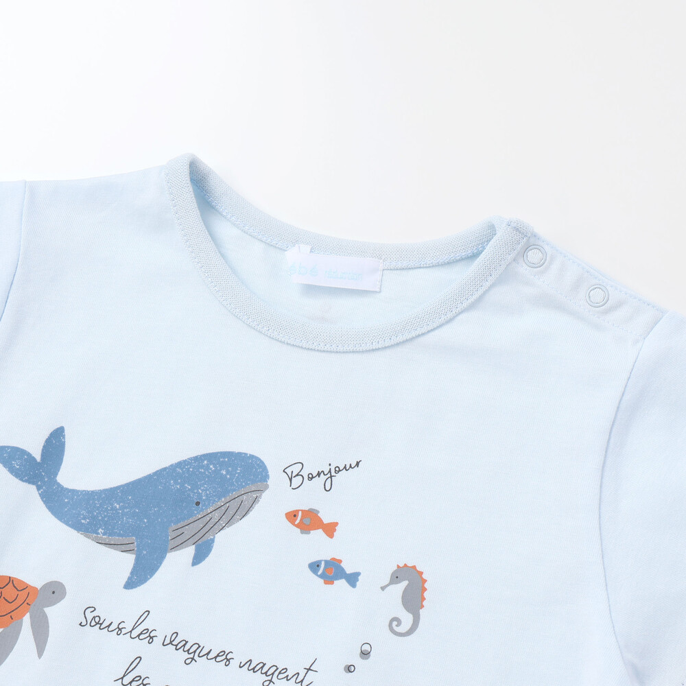 ブルーの身生地をベースに、フロントへ大きく描かれたクジラやカニ、カメなどの海の生き物たちが、まるでお子様と一緒に海の中を冒険しているような遊び心たっぷりのデザインです。