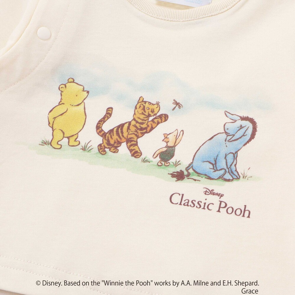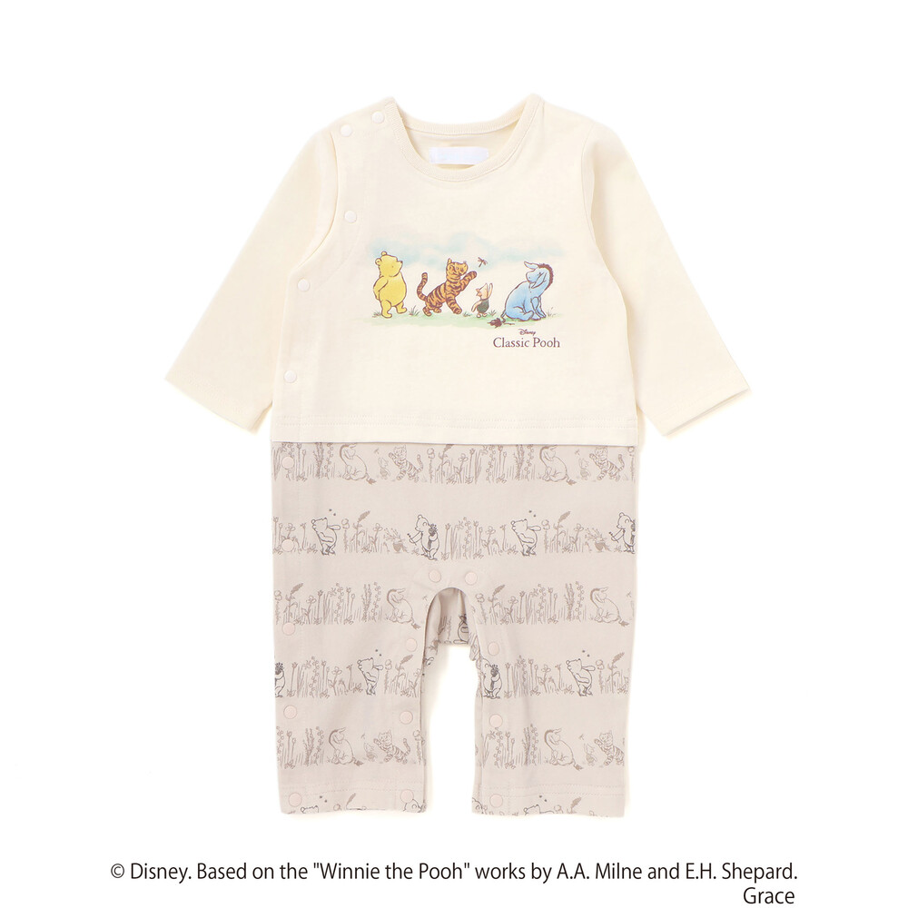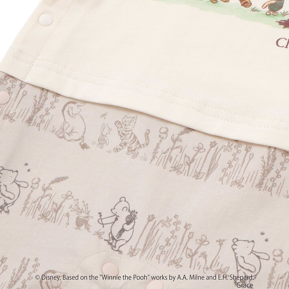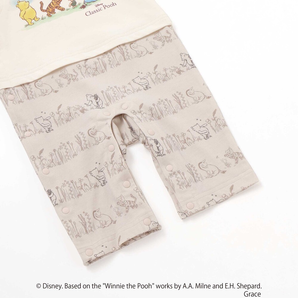 カバーオールの前面には、[クラシックプー]のキャラクターたち([プーさん]、[イーヨー]、[ティガー]、[ピグレット]など)が描かれた、愛らしく心温まるプリントが施されています。