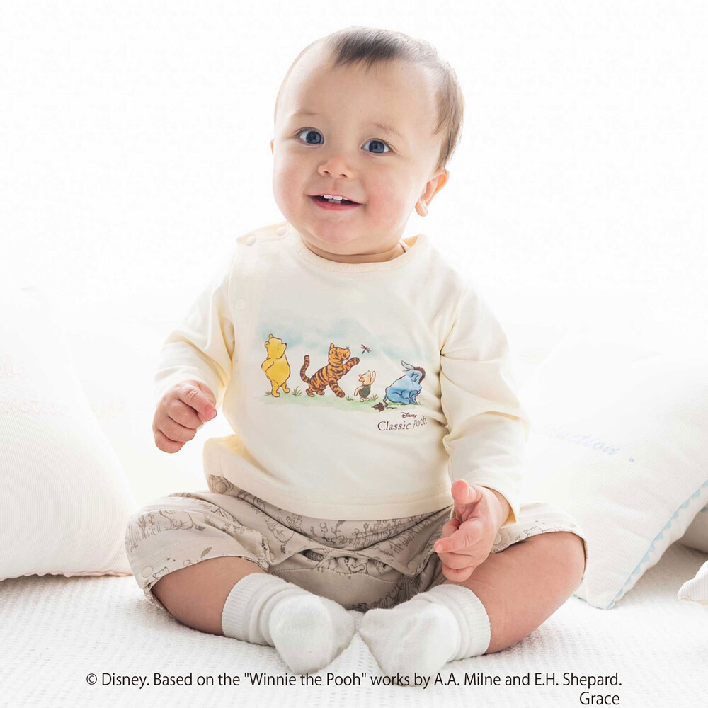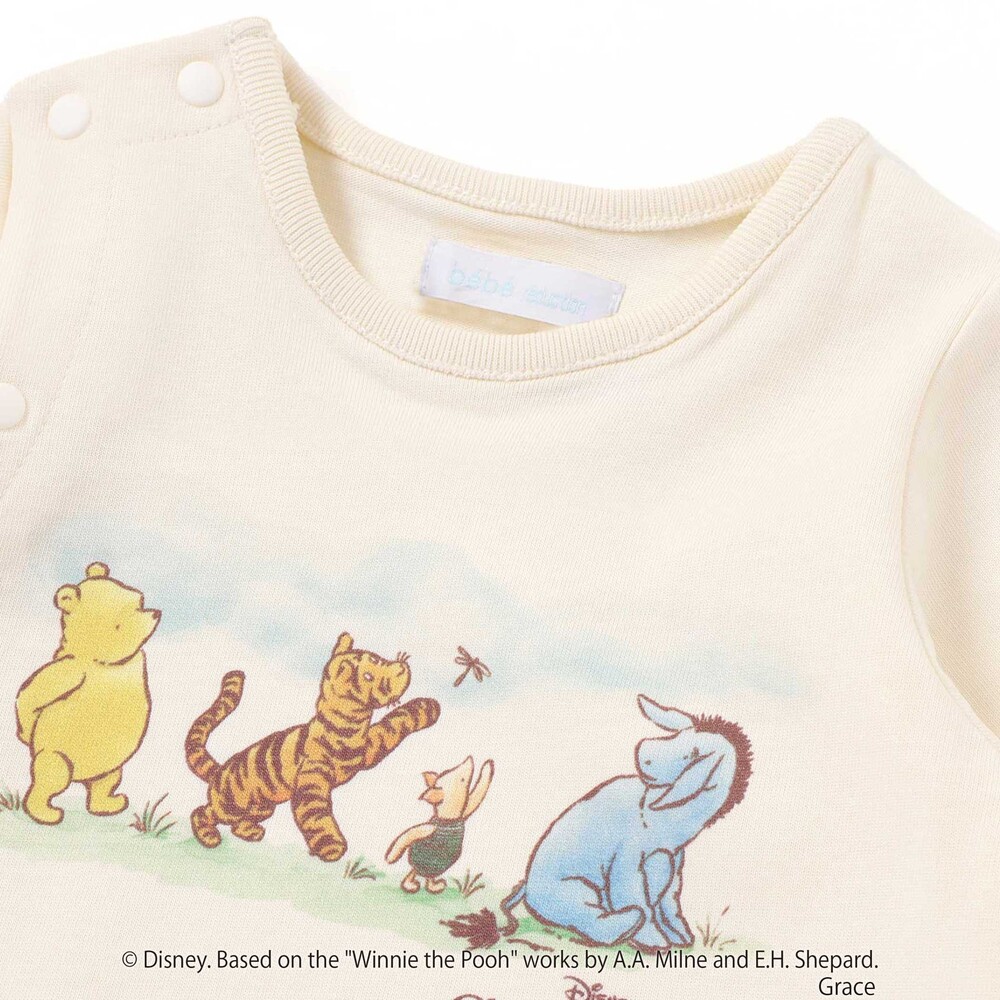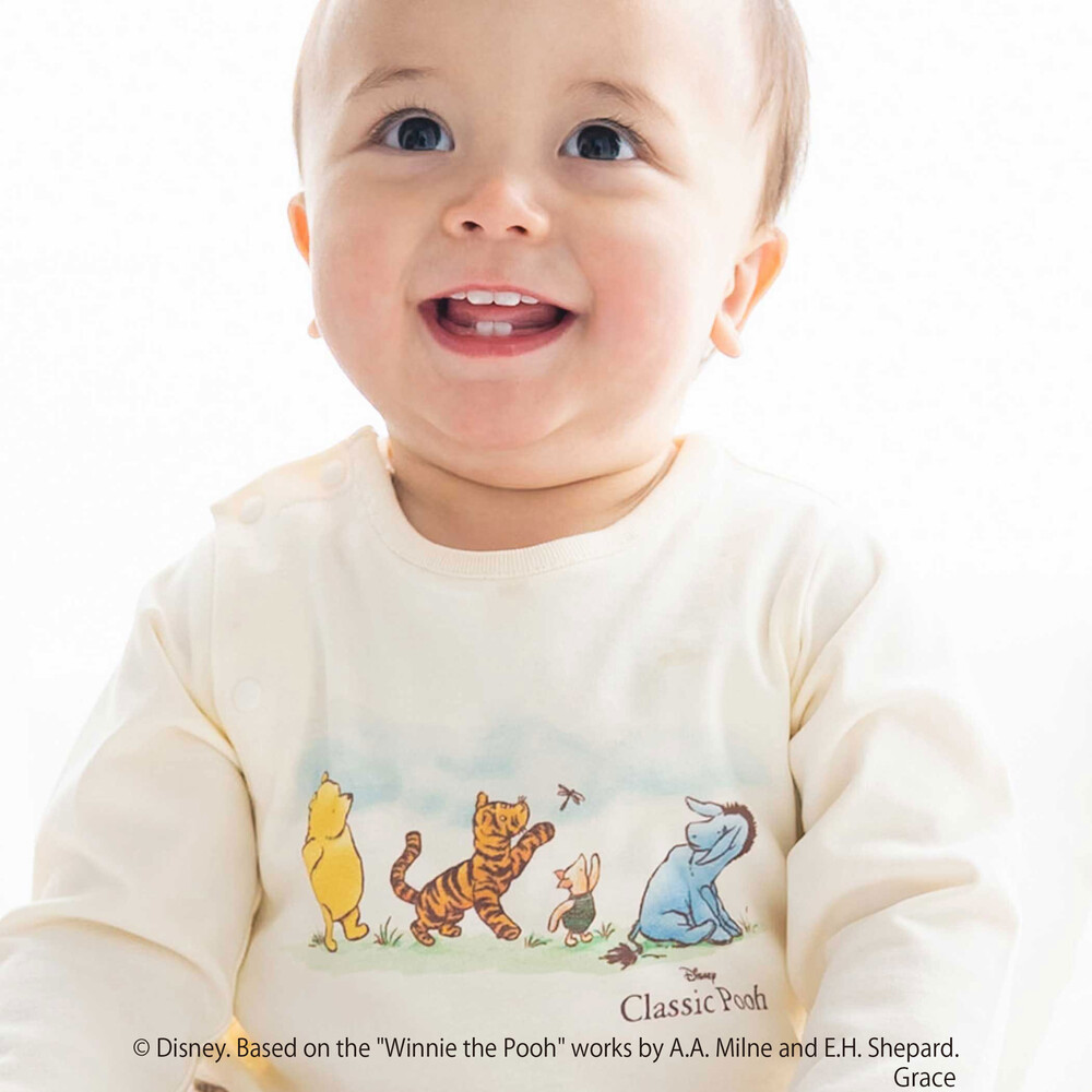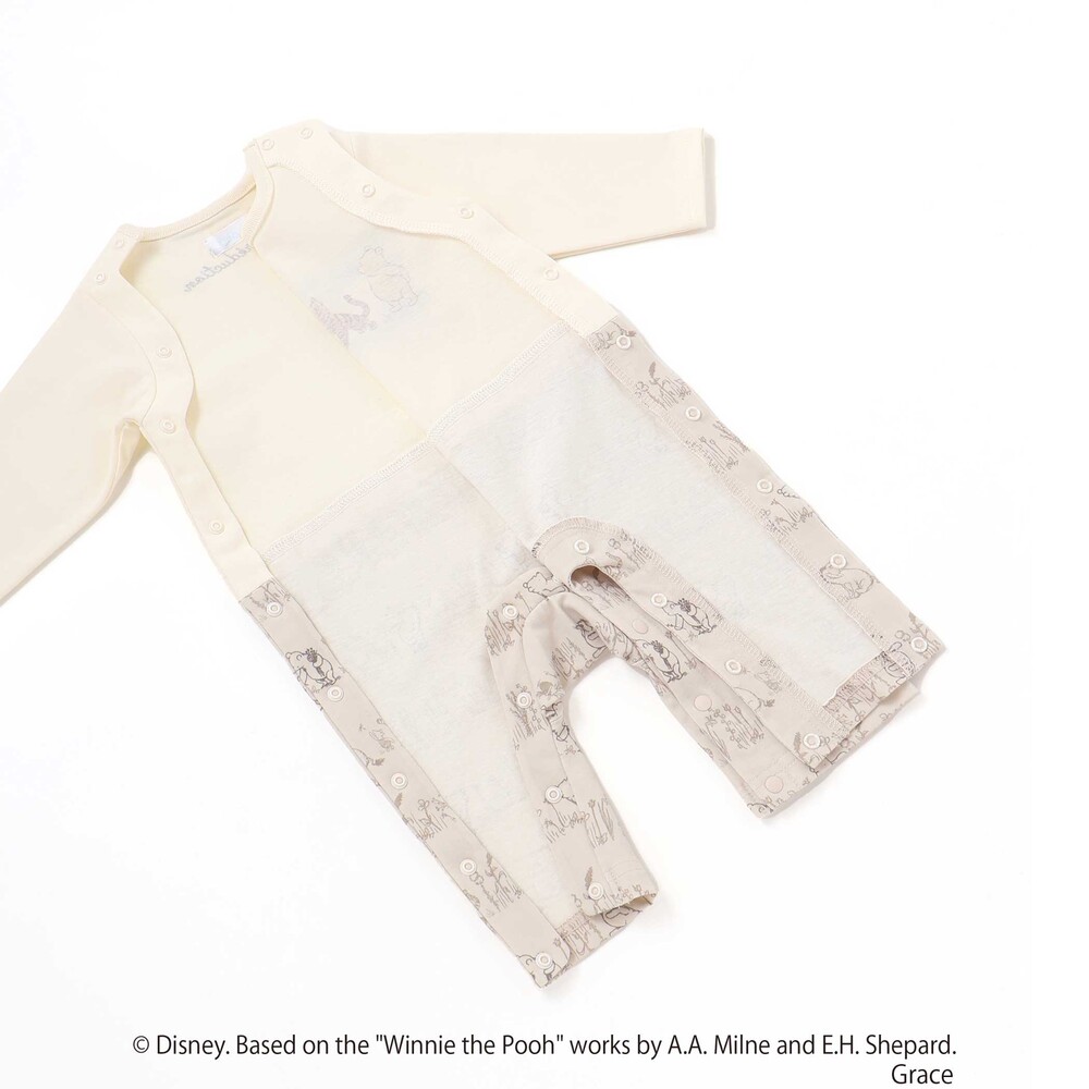 カバーオールの前面には、[クラシックプー]のキャラクターたち([プーさん]、[イーヨー]、[ティガー]、[ピグレット]など)が描かれた、愛らしく心温まるプリントが施されています。