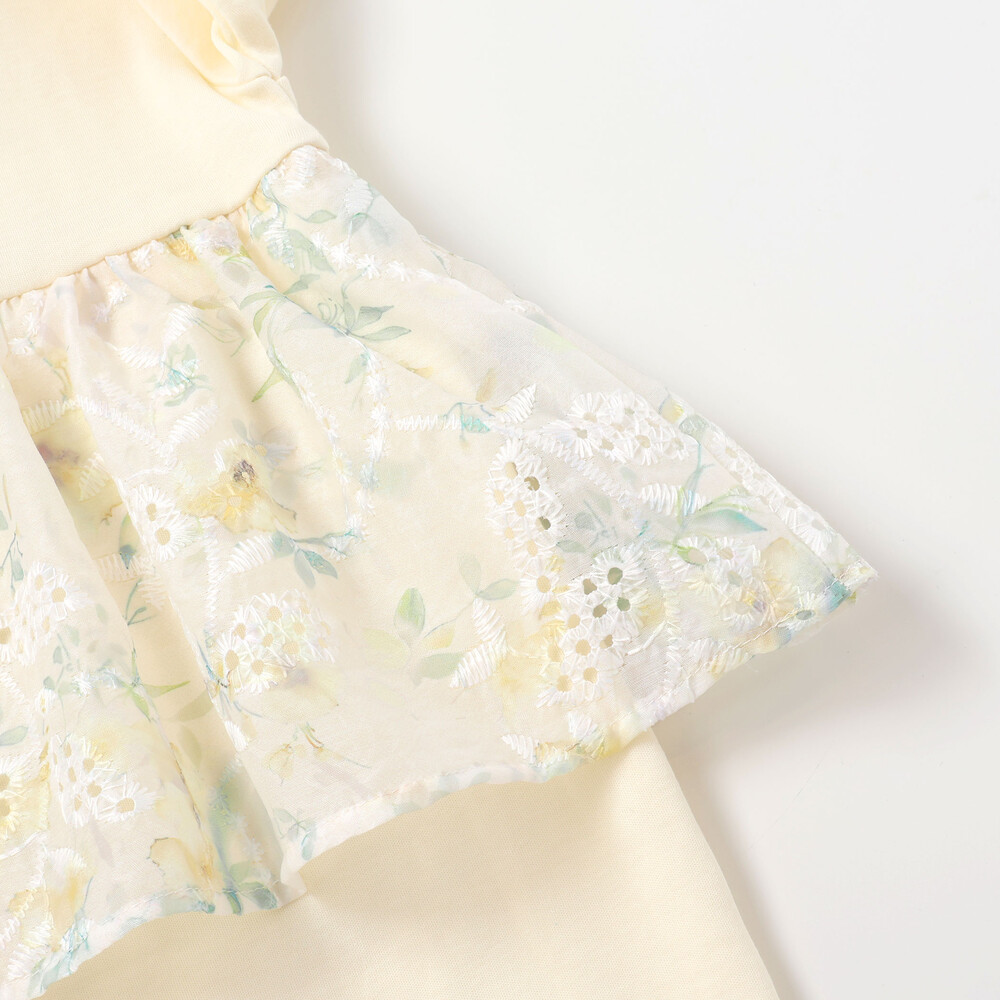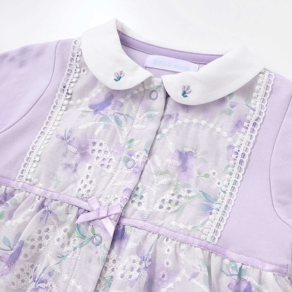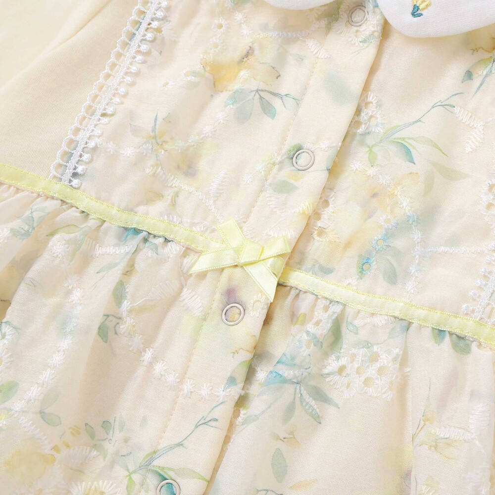 リーフ刺しゅう入りのオーガンジーに花柄プリントが華やかで、特別な日の装いを一層引き立てます。
