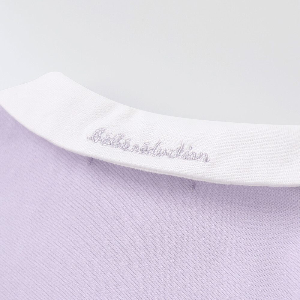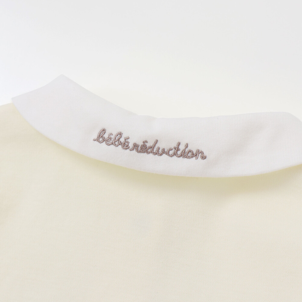 スカートとの切り替えにはサテンリボン、襟の後ろにはブランドロゴ刺しゅうをあしらい、細部のディテールまでこだわって仕上げました。