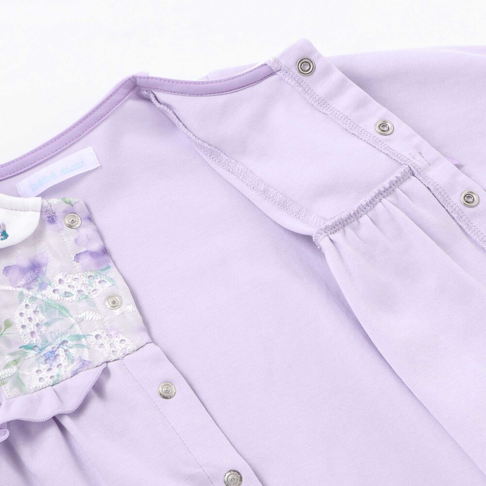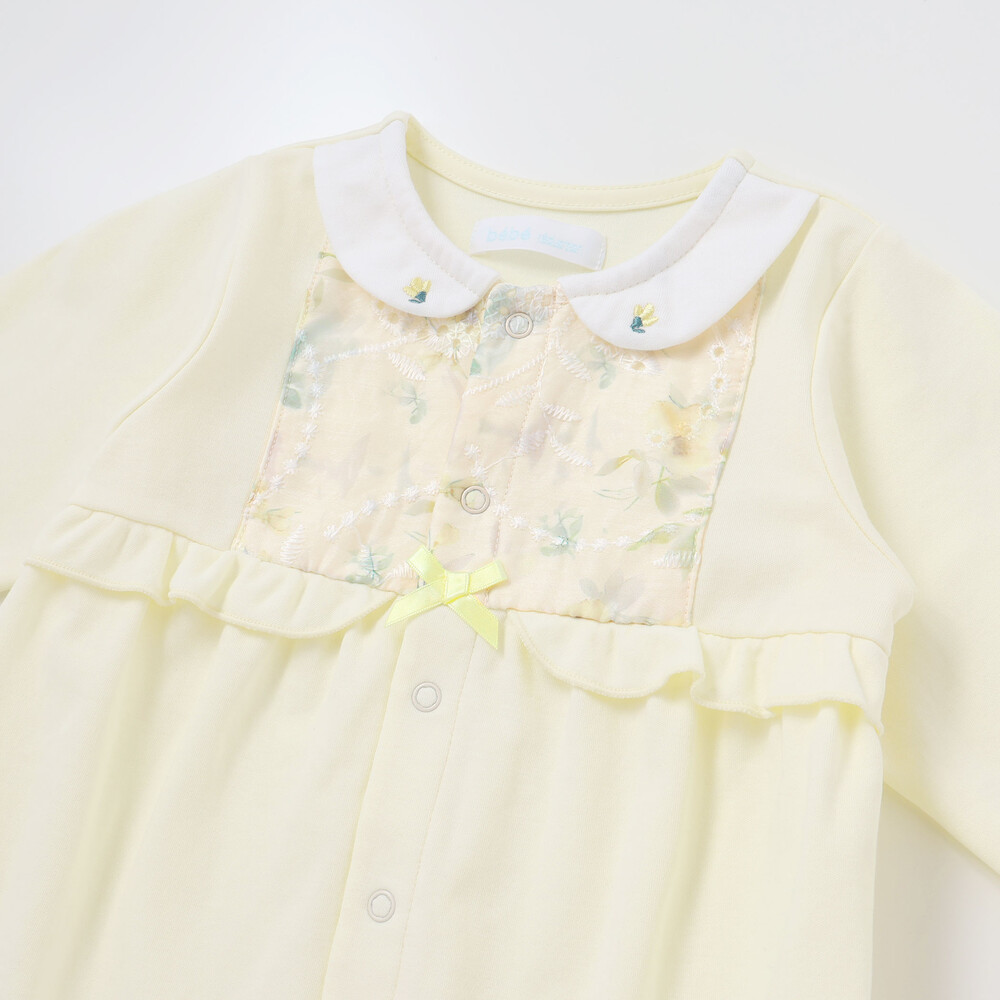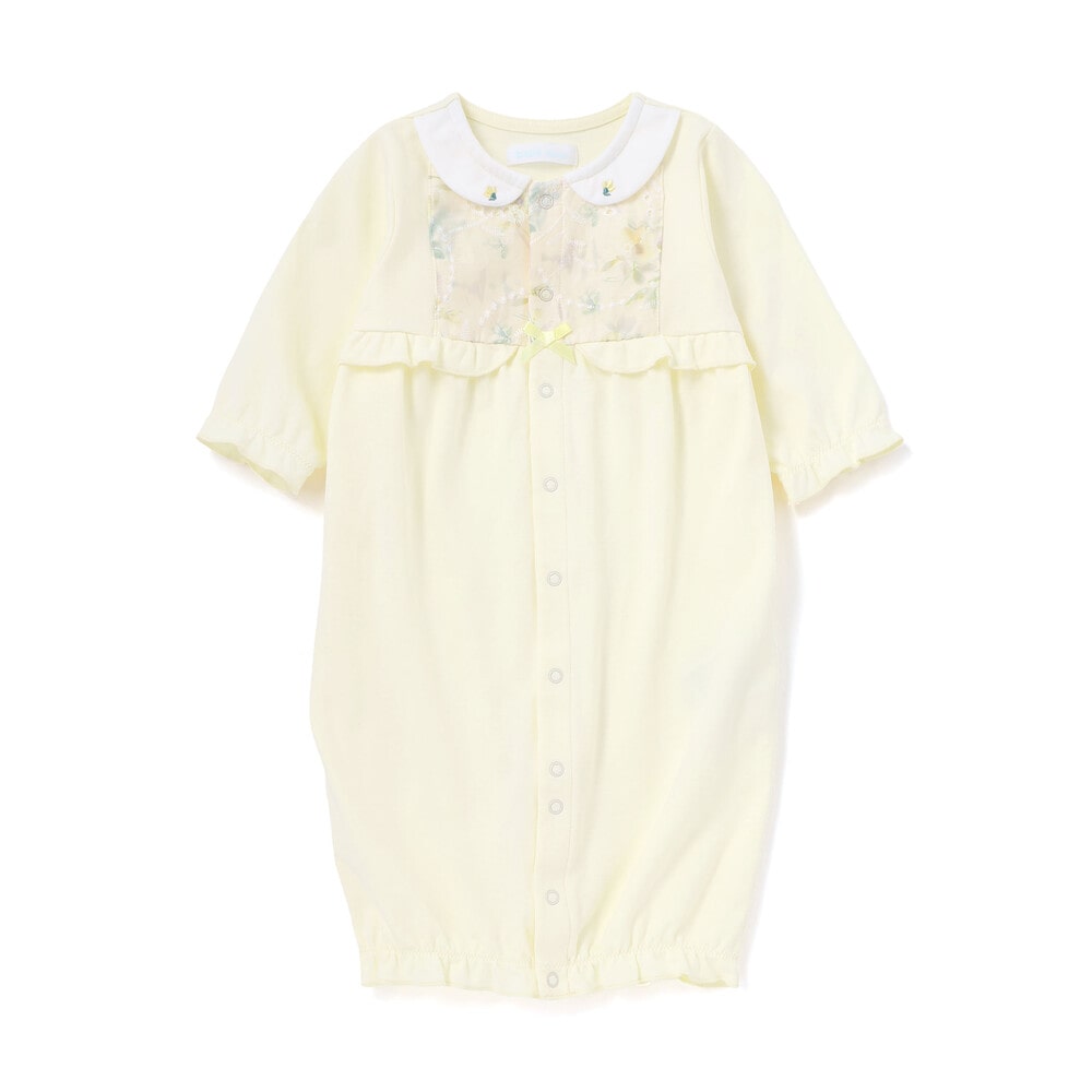 なめらかなスムース素材を身生地に使用し、胸元には、透け感のあるオーガンジー素材の花柄プリントが華やかに広がり、愛らしい表情を演出。