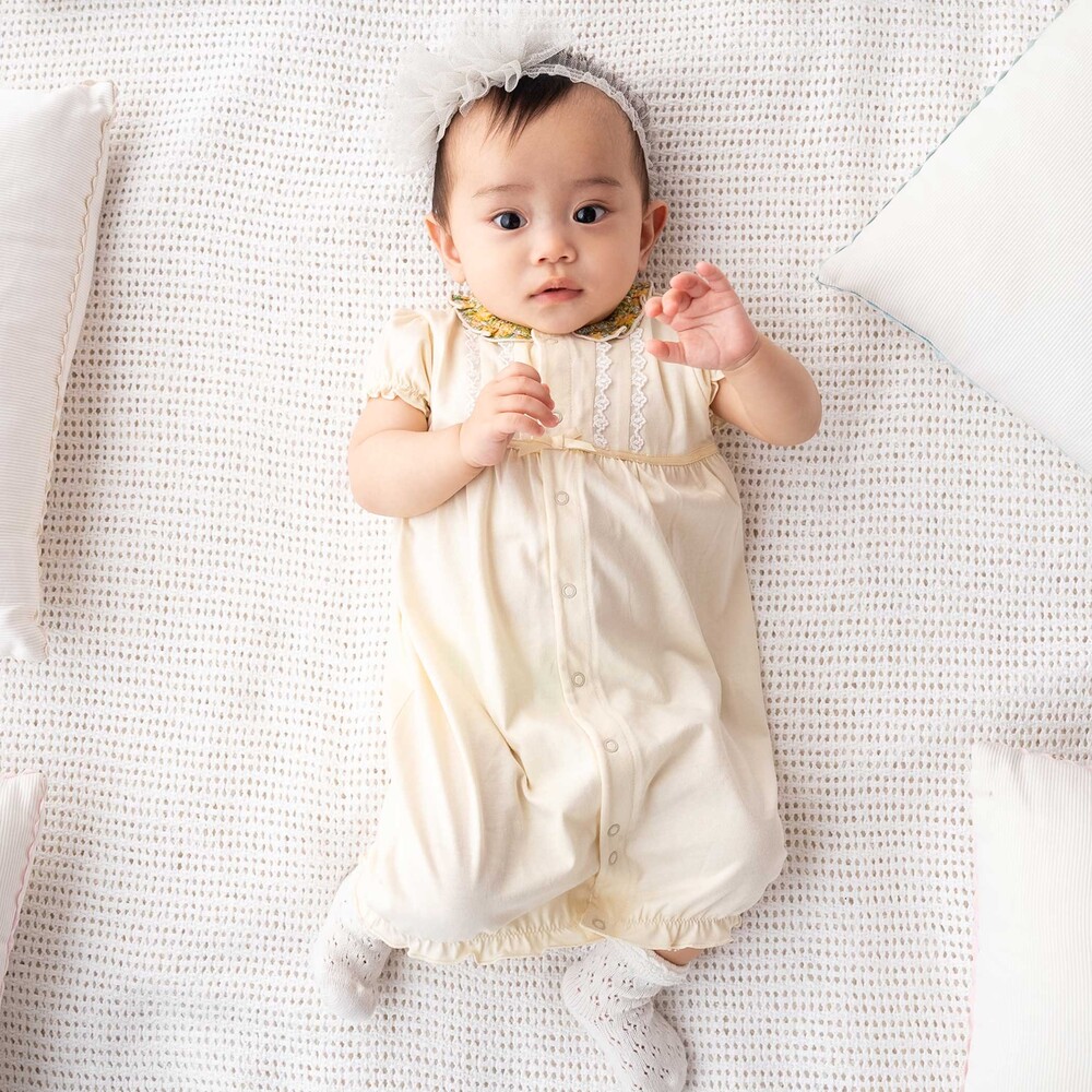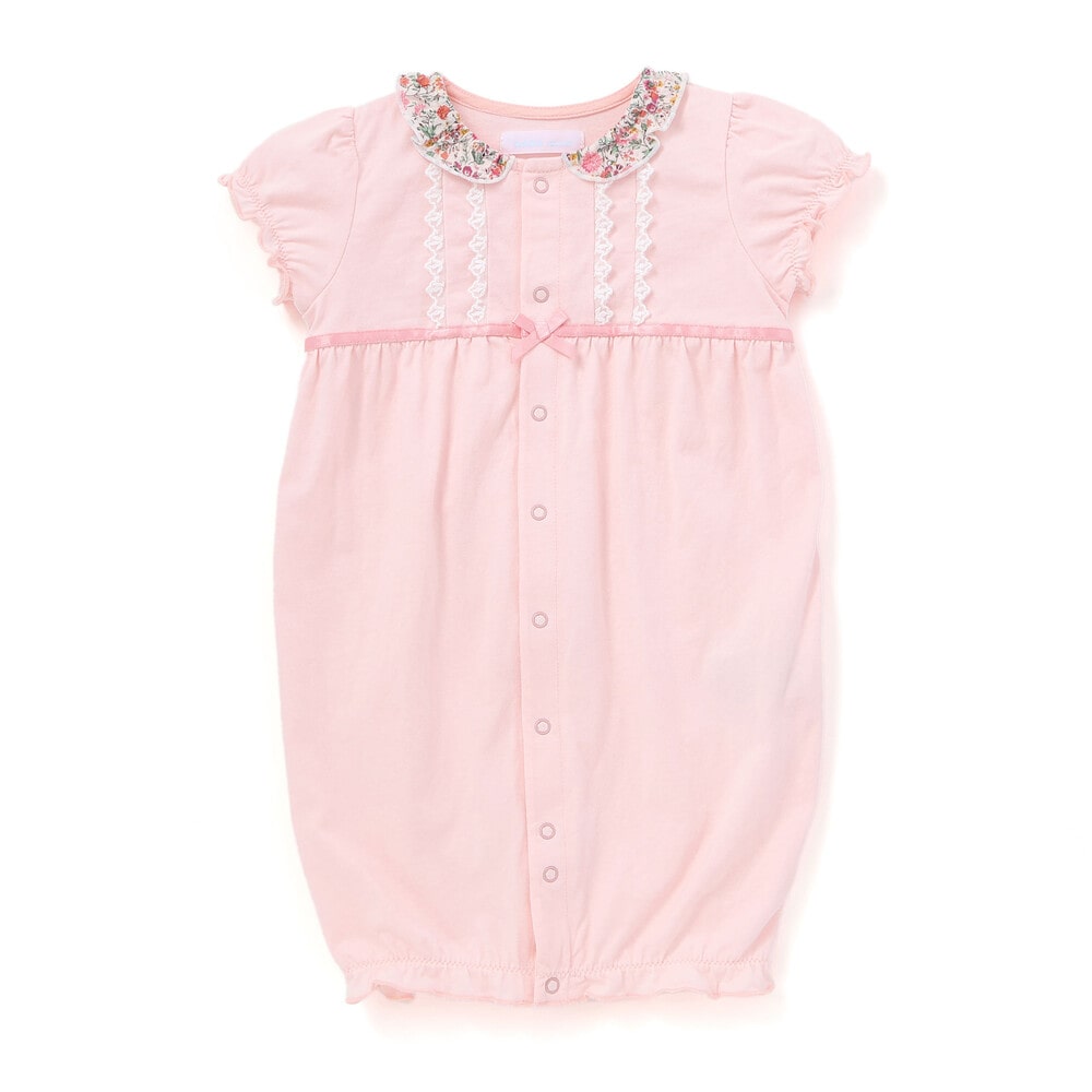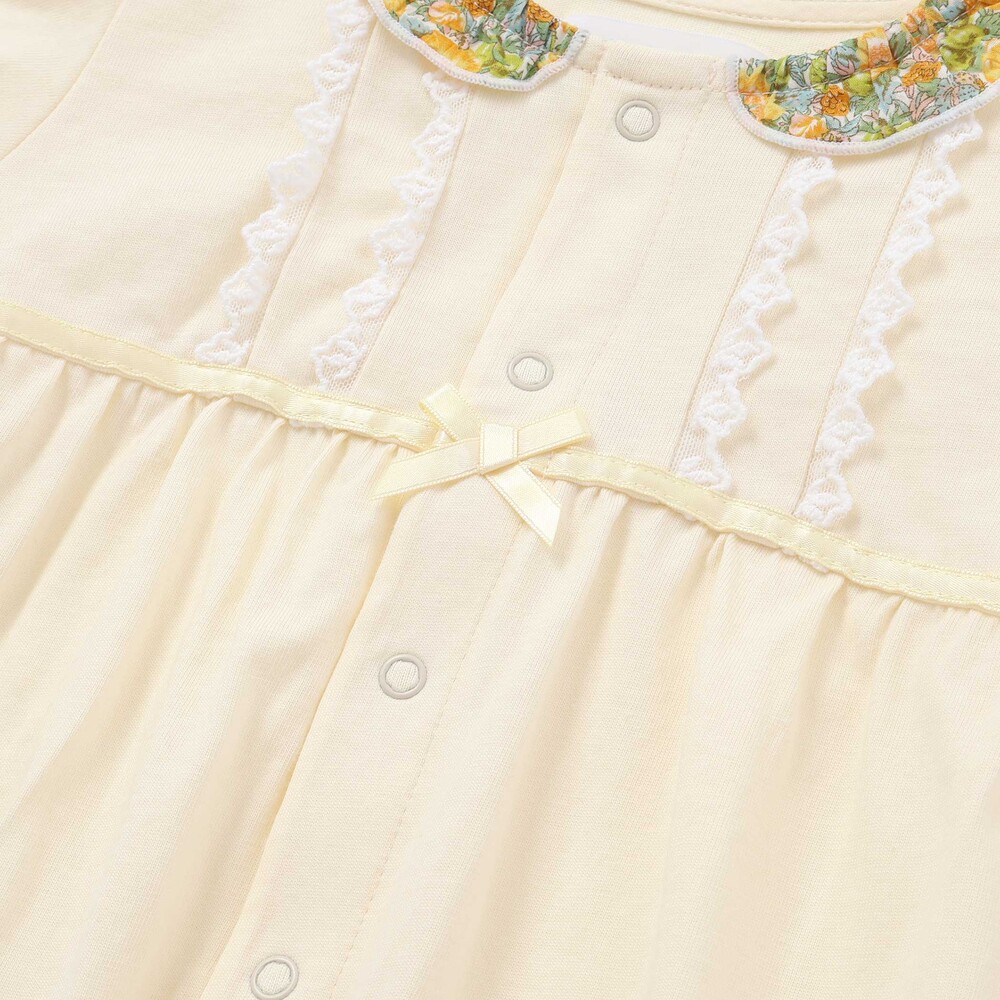 カラーはピンクとイエローの2色展開で、それぞれのカラーに合わせた繊細なリバティプリントの襟フリルで特別な魅力を放っています。