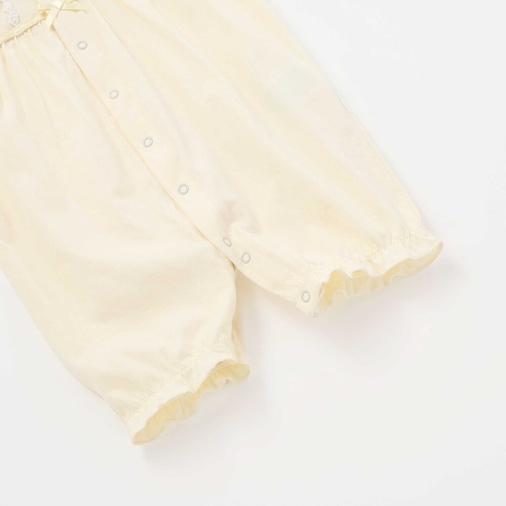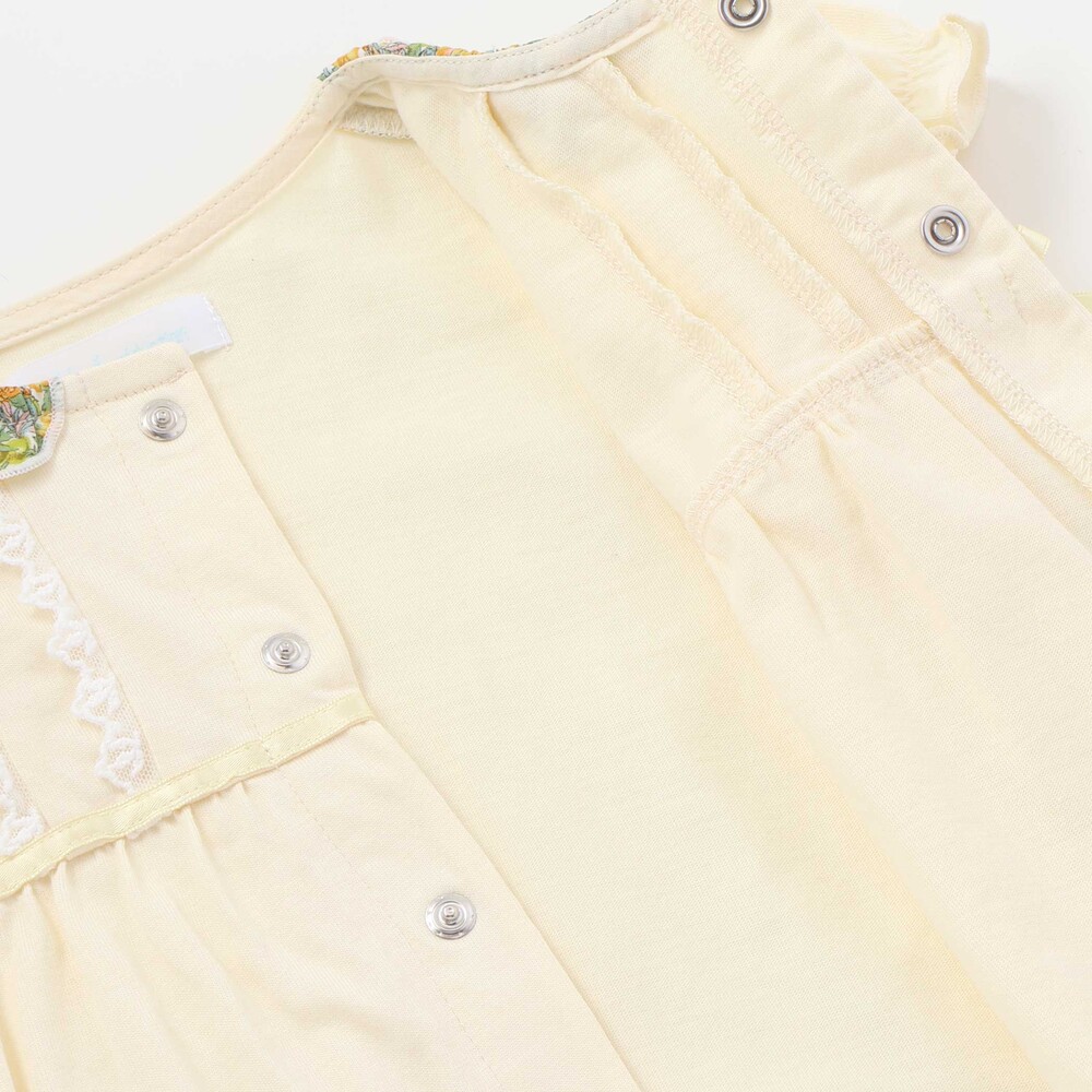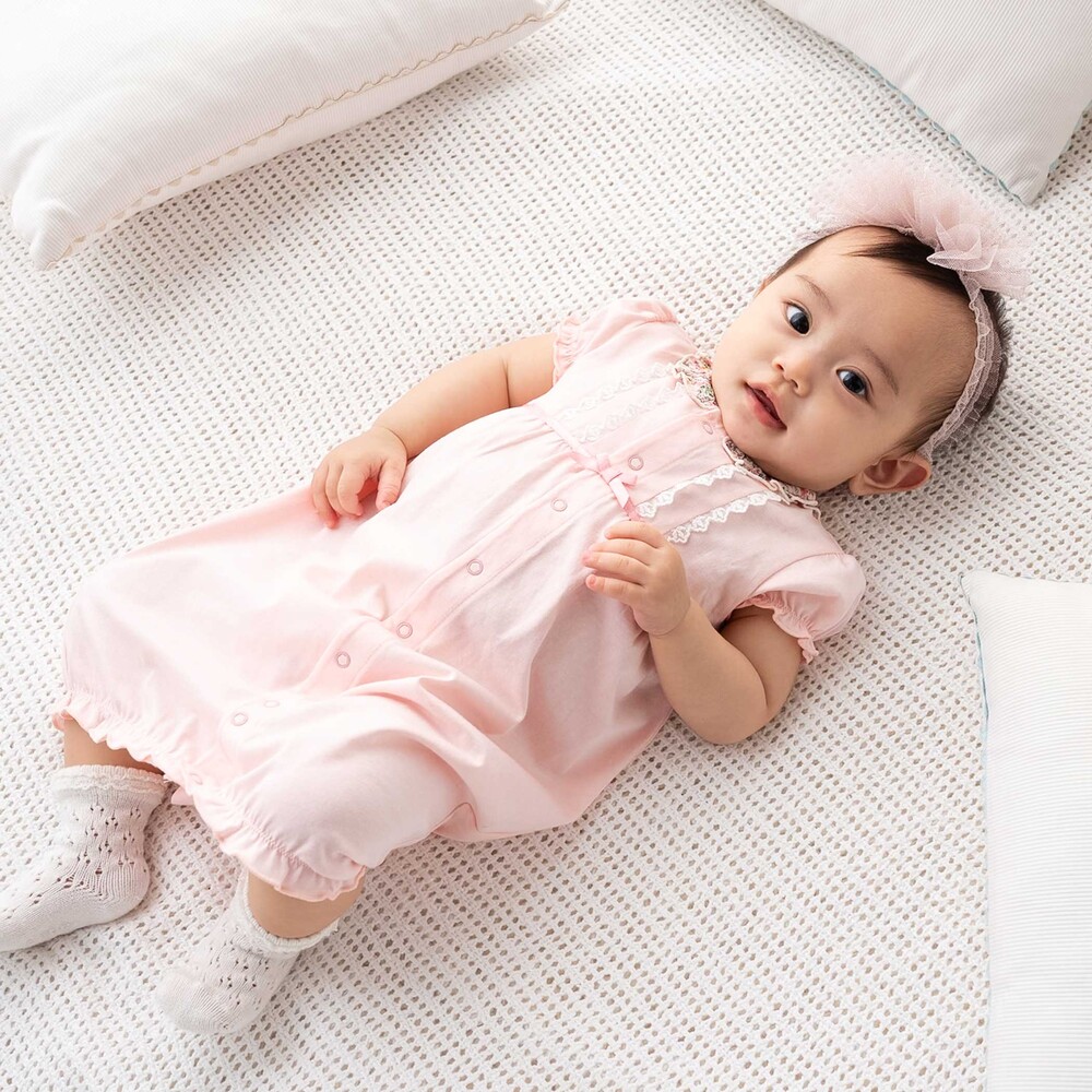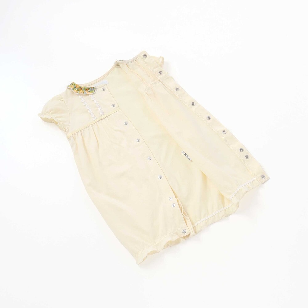 カラーはピンクとイエローの2色展開で、それぞれのカラーに合わせた繊細なリバティプリントの襟フリルで特別な魅力を放っています。