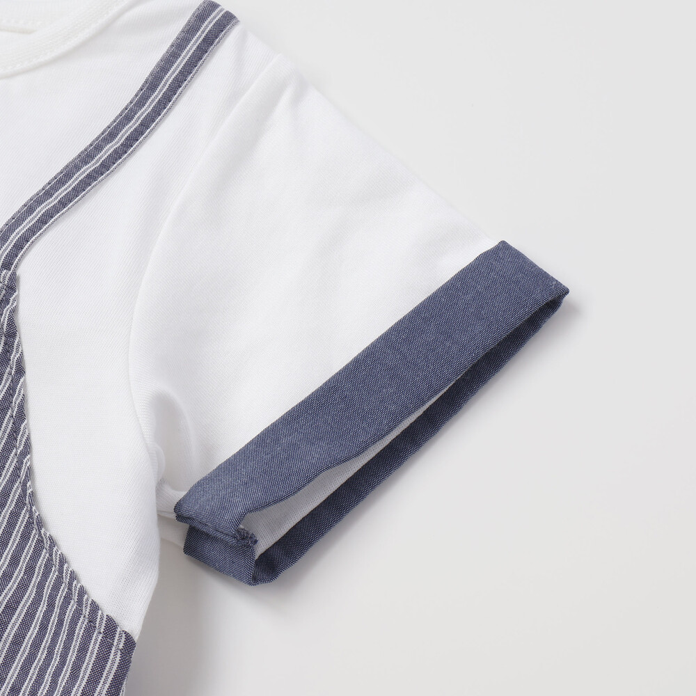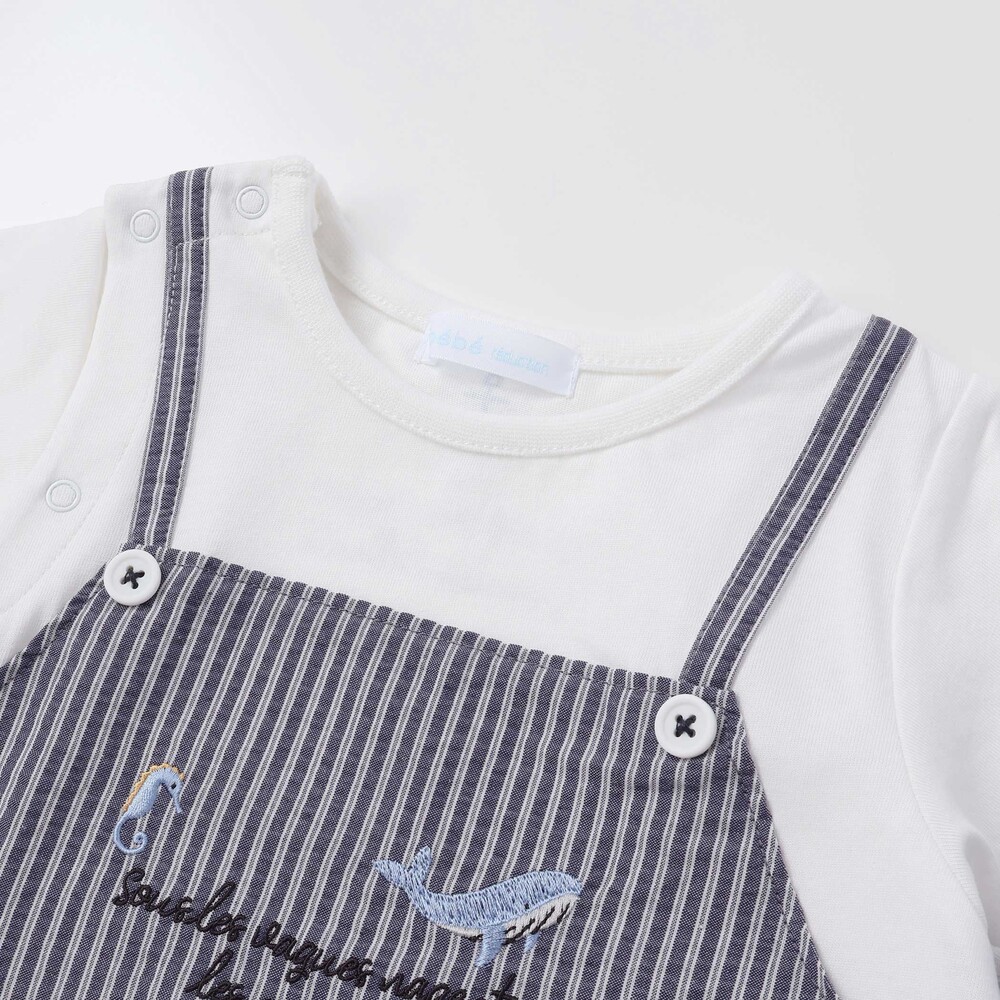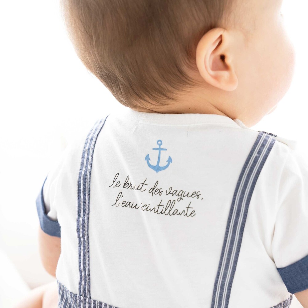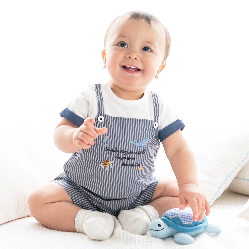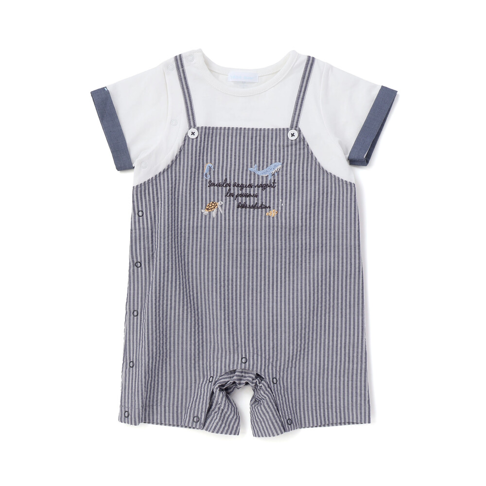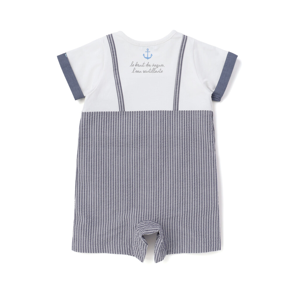 サロペットを重ね着したようなデザインが1枚で決まる、男の子ベビー用半袖マリンスタイルのカバーオールです。