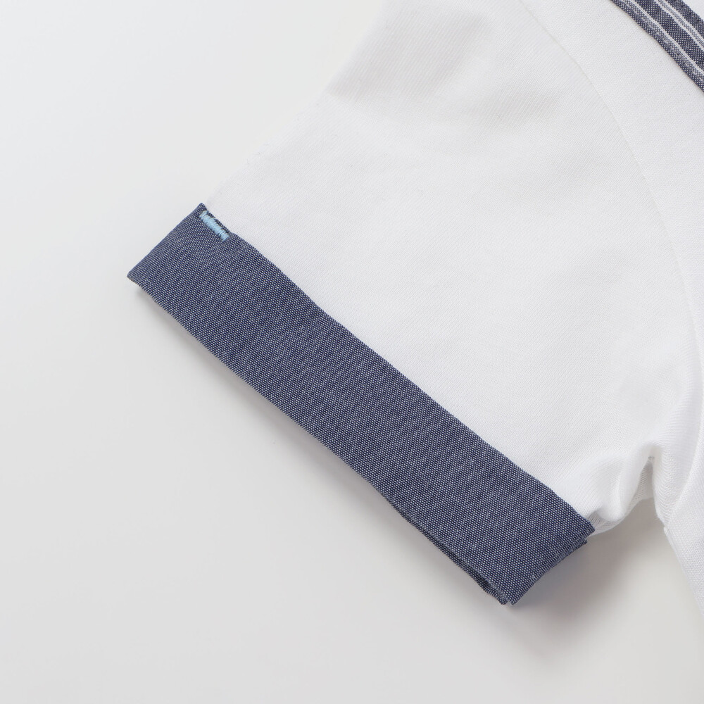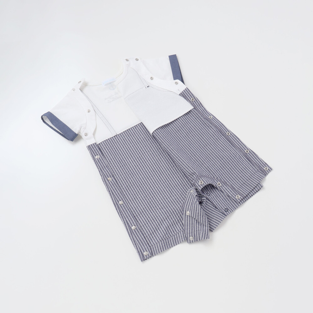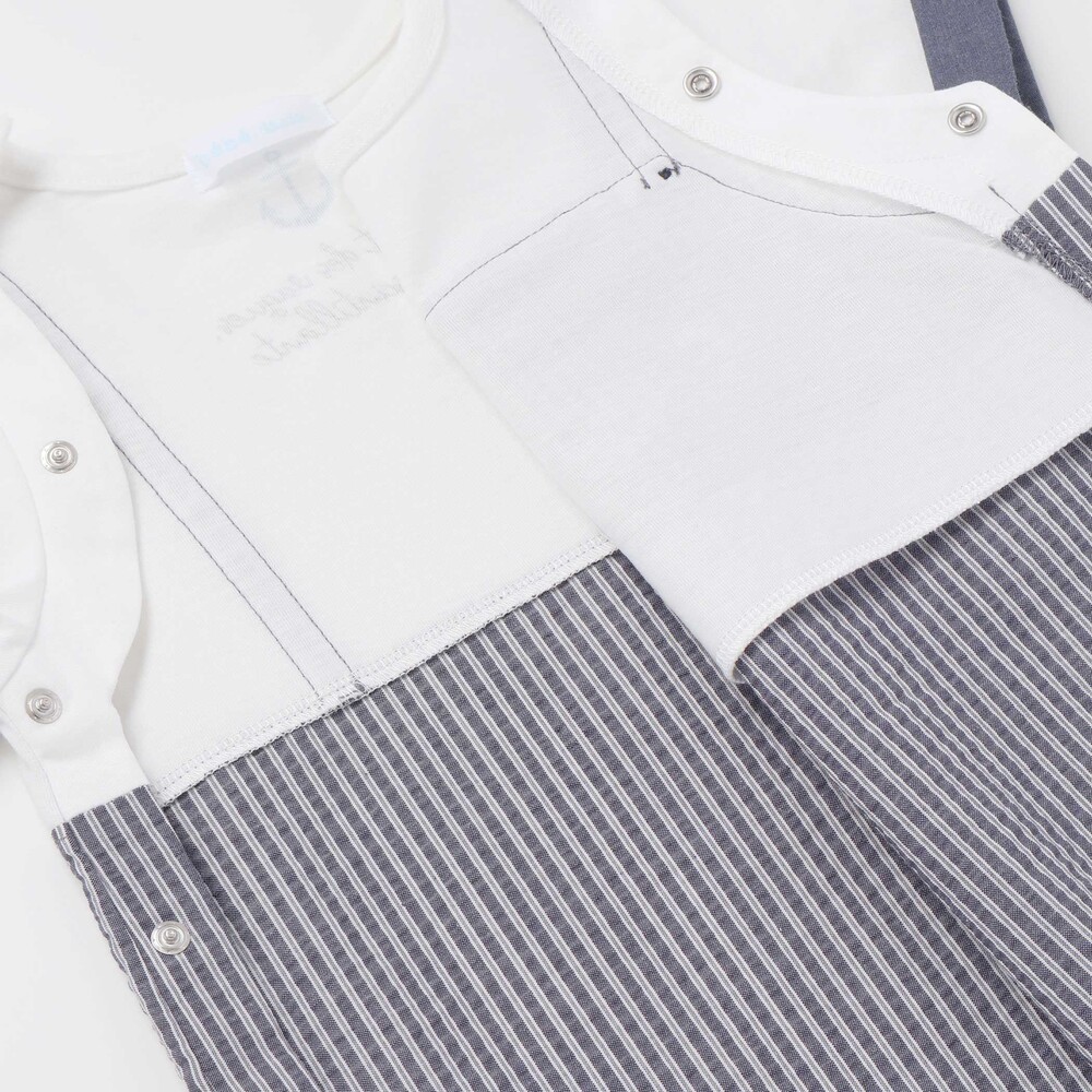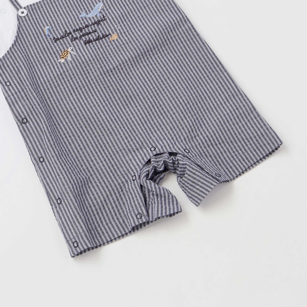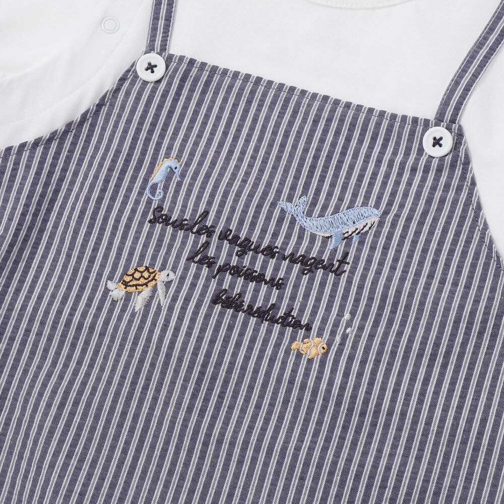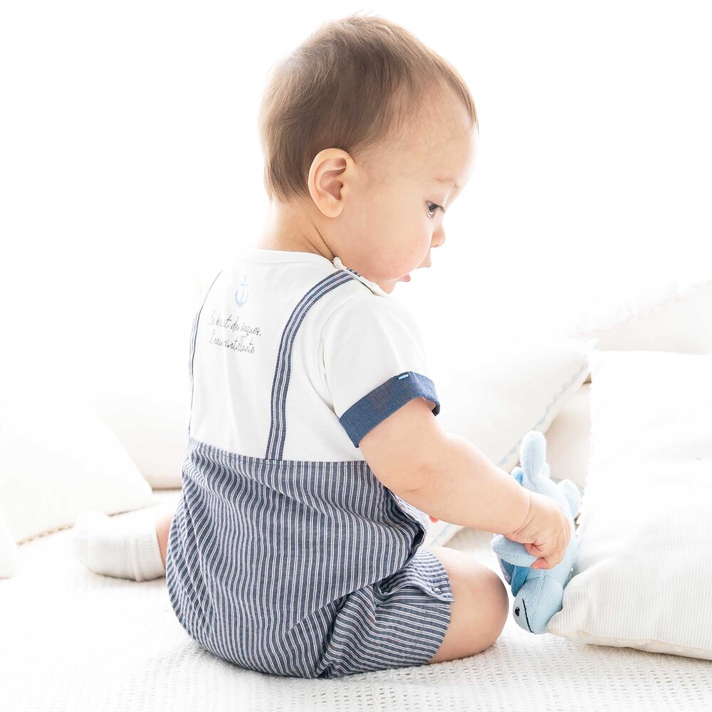 サロペットを重ね着したようなデザインが1枚で決まる、男の子ベビー用半袖マリンスタイルのカバーオールです。