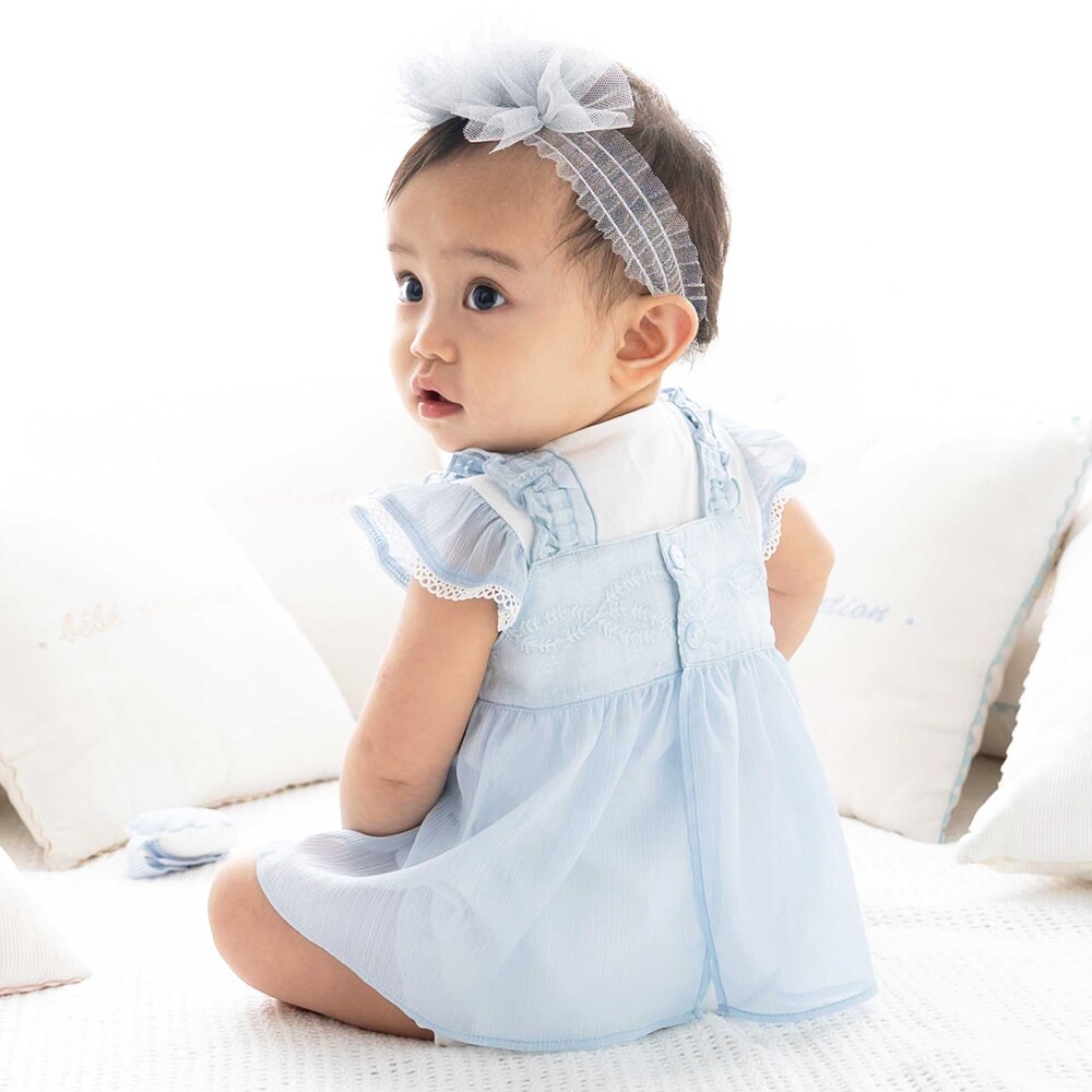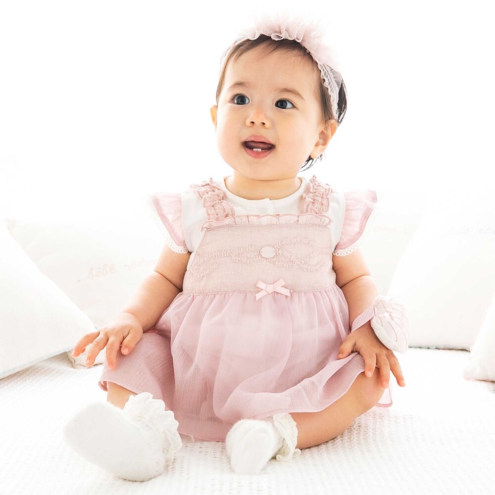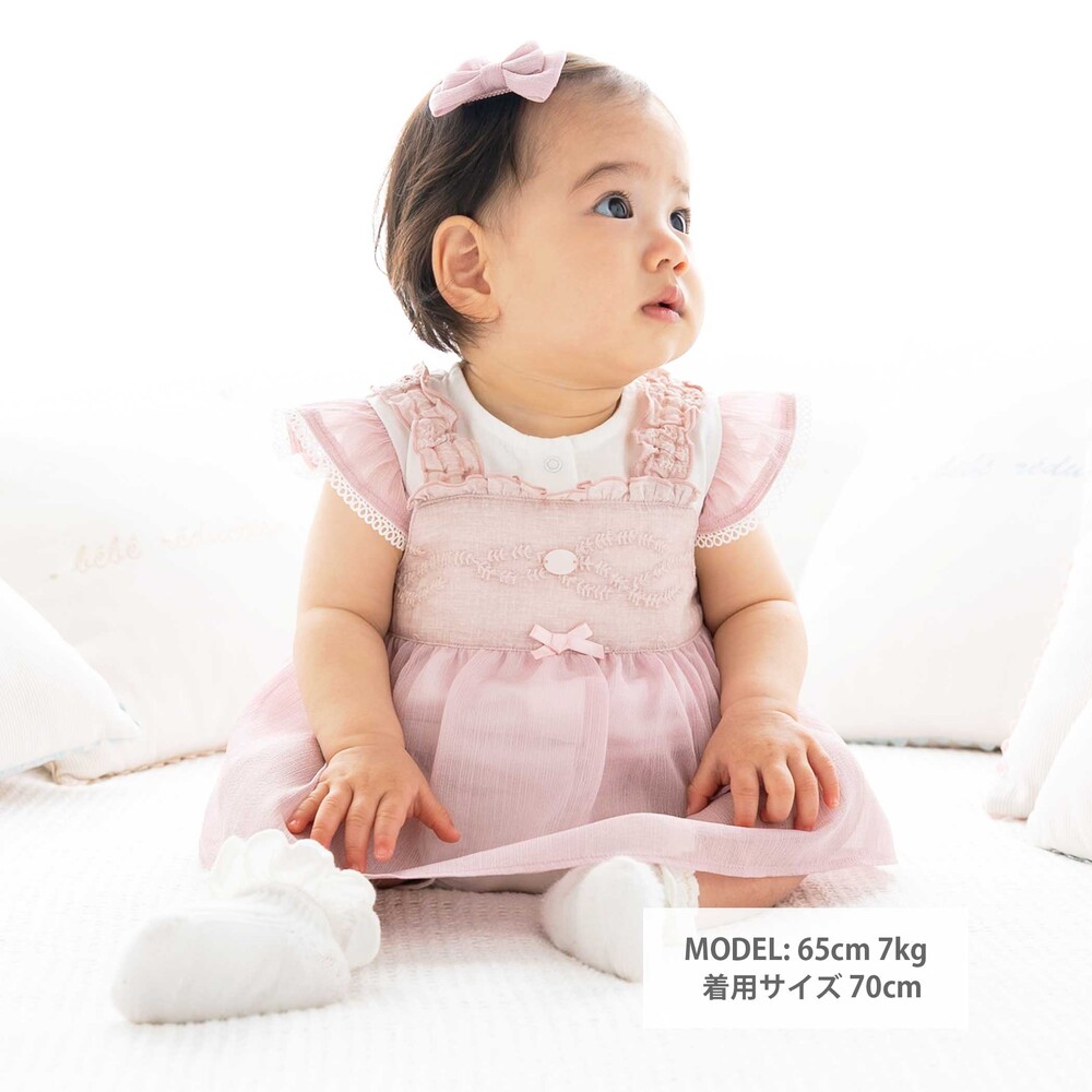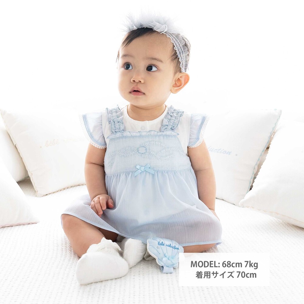 軽やかなシフォンチュニックとカバーオールがセットになった、上品な女の子ベビー用おめかしスタイル。