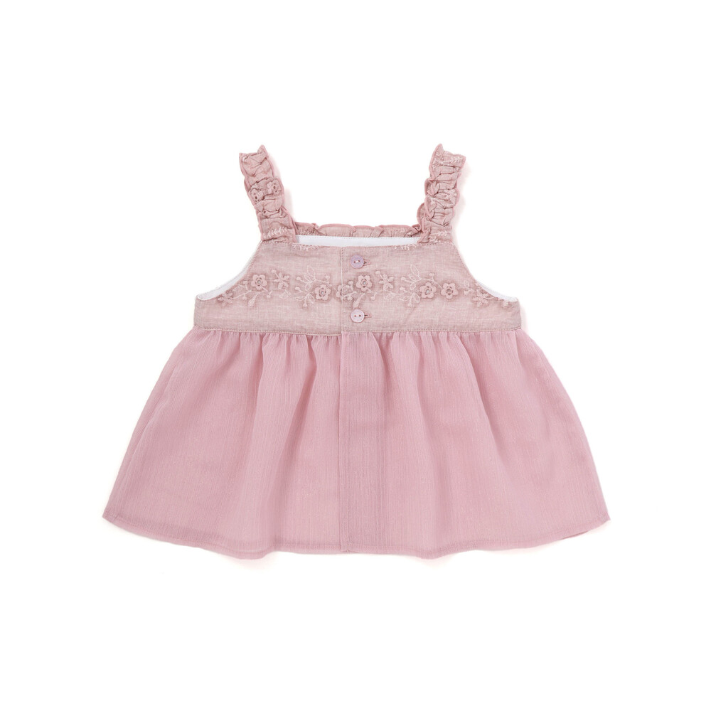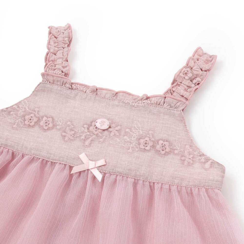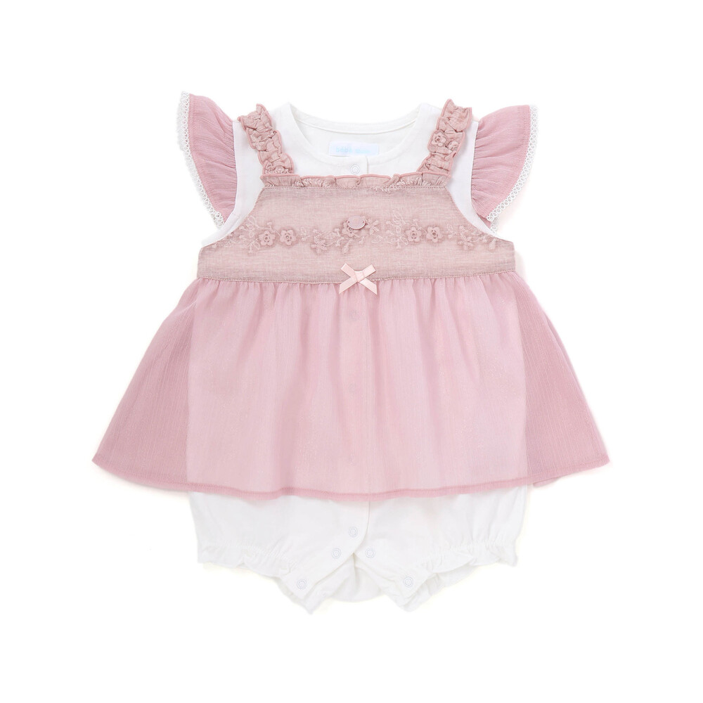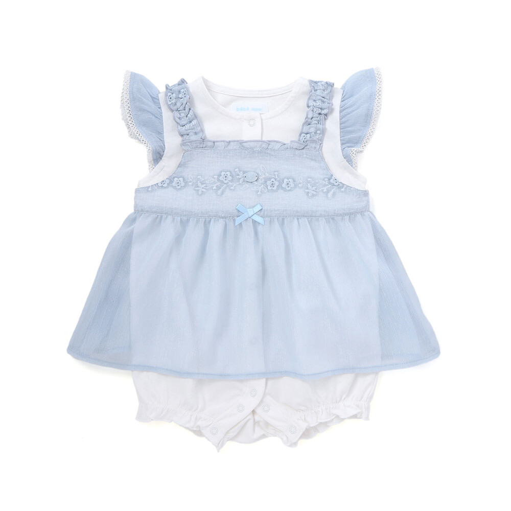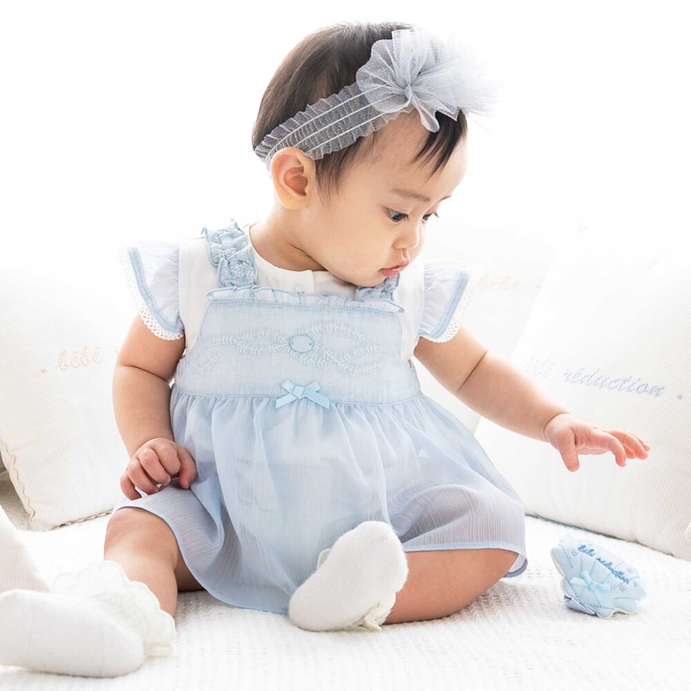 軽やかなシフォンチュニックとカバーオールがセットになった、上品な女の子ベビー用おめかしスタイル。