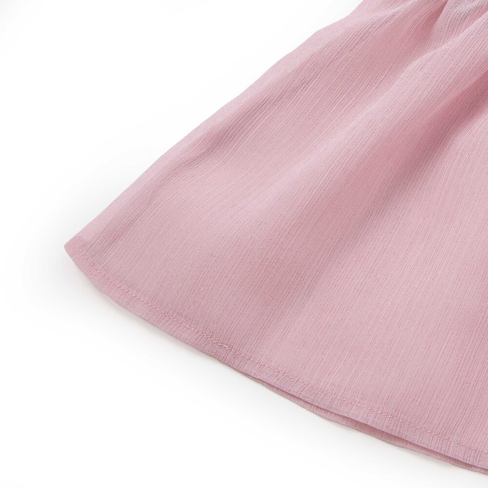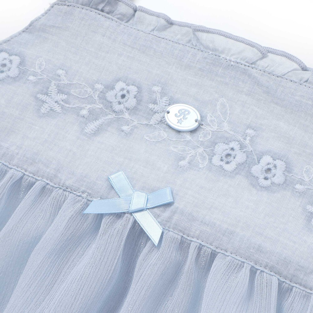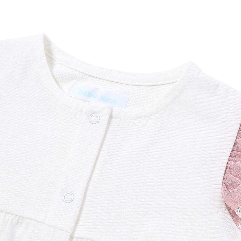 チュニックにはラメシフォンと綿レースを贅沢に使用し、ウエストのサテンリボンと胸元のロゴ入りモチーフが高級感を添えています。