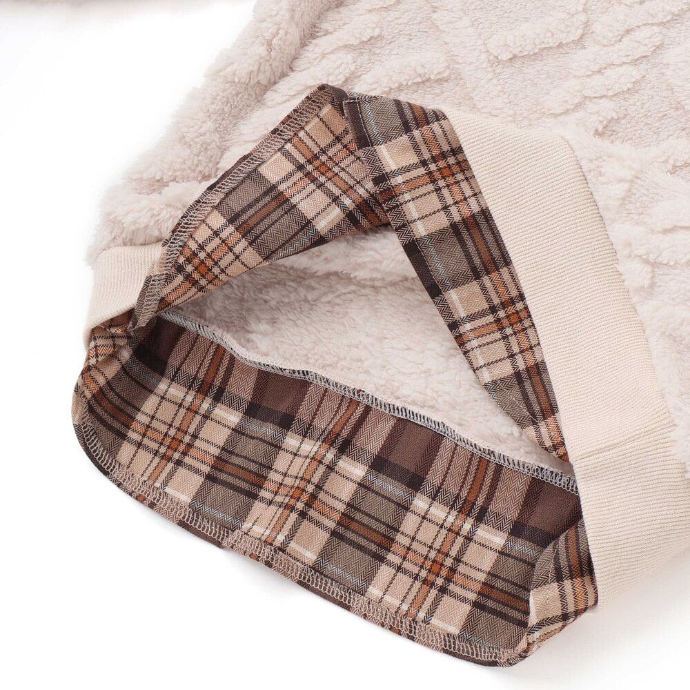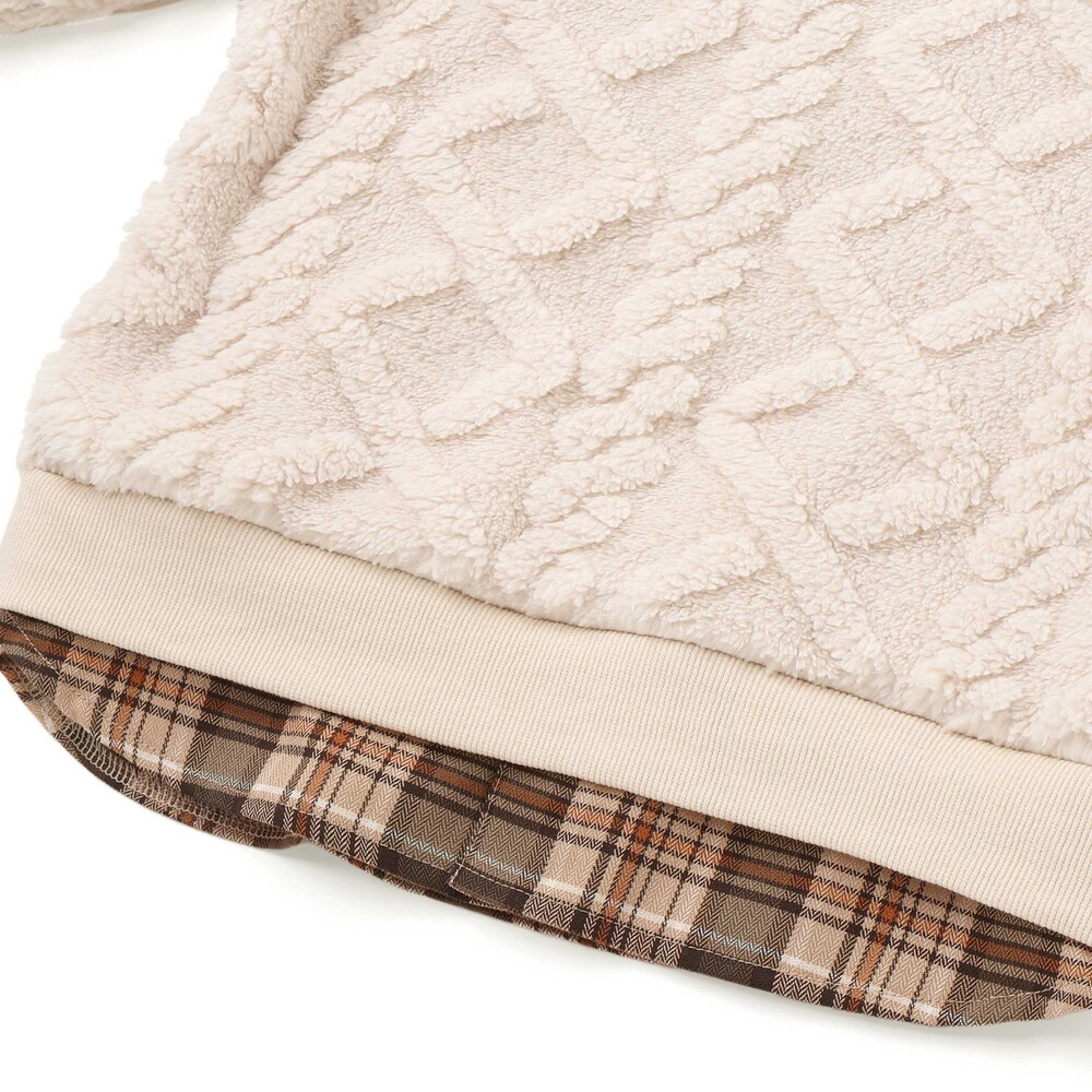 襟・袖口・裾には、アクセントとしてタータンチェック柄をあしらい、季節感と可愛らしさをプラスしました。