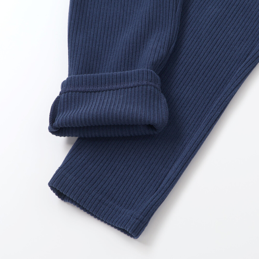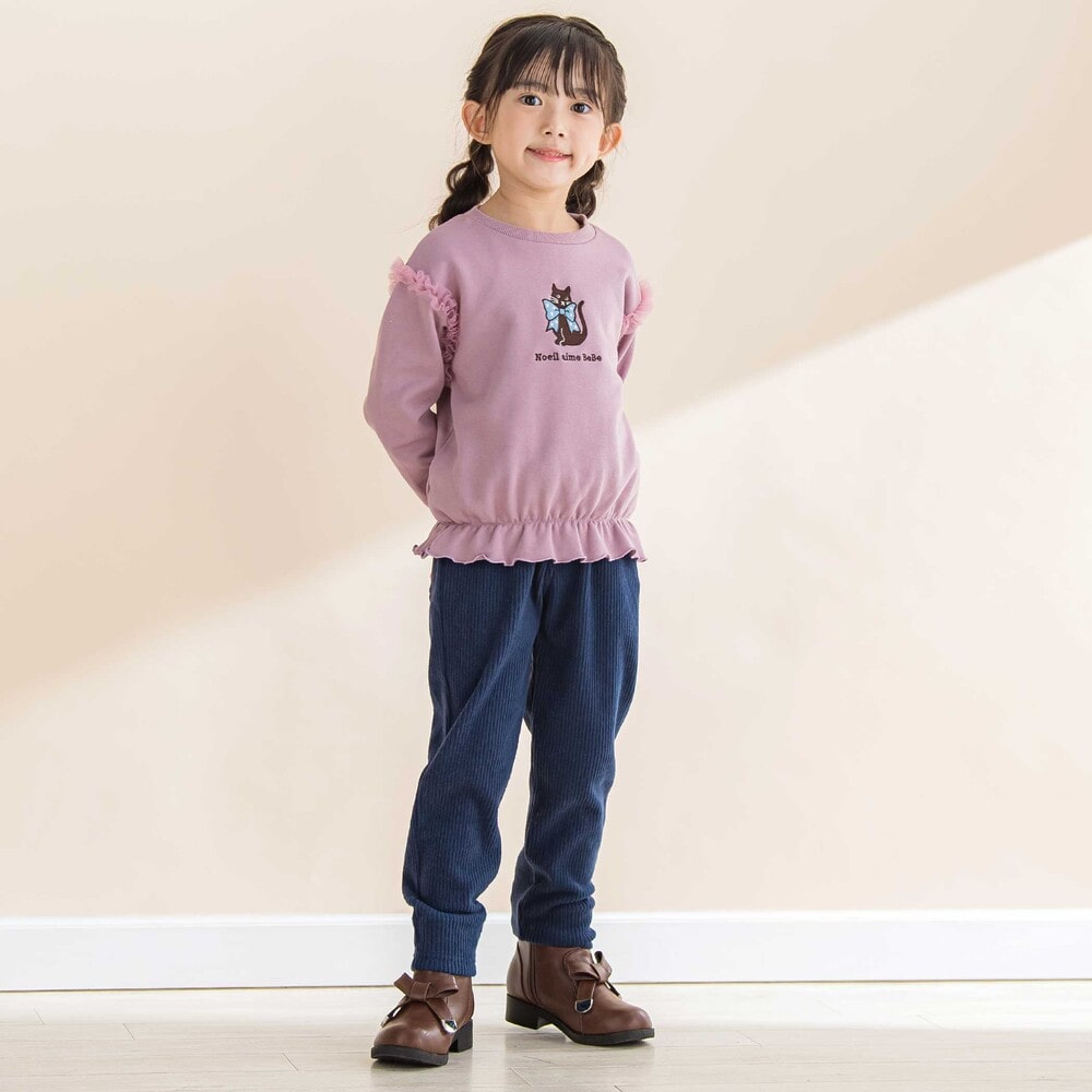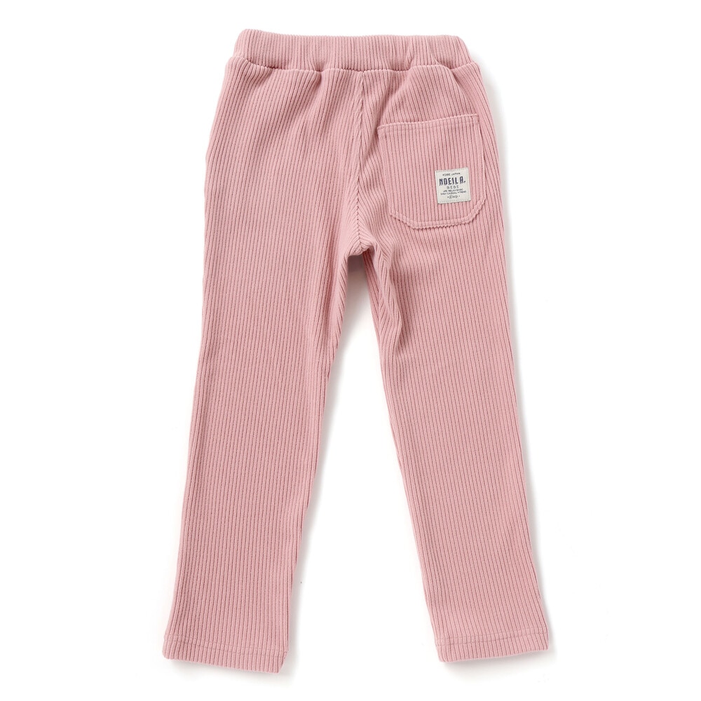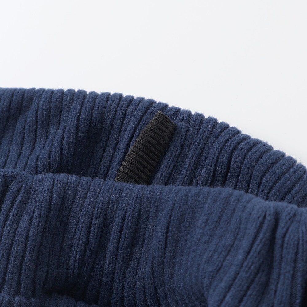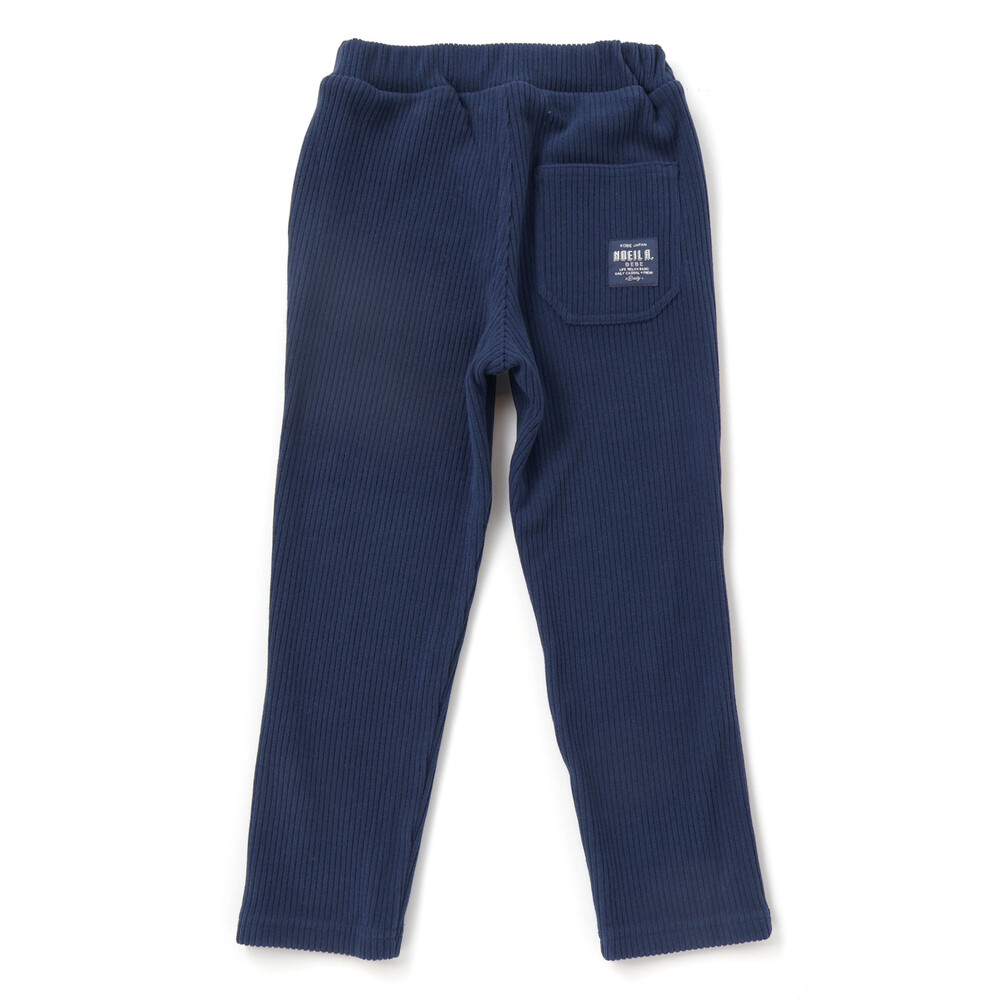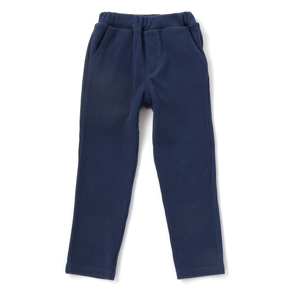 コーデュロイのようなウネのある男女兼用のロングパンツ。