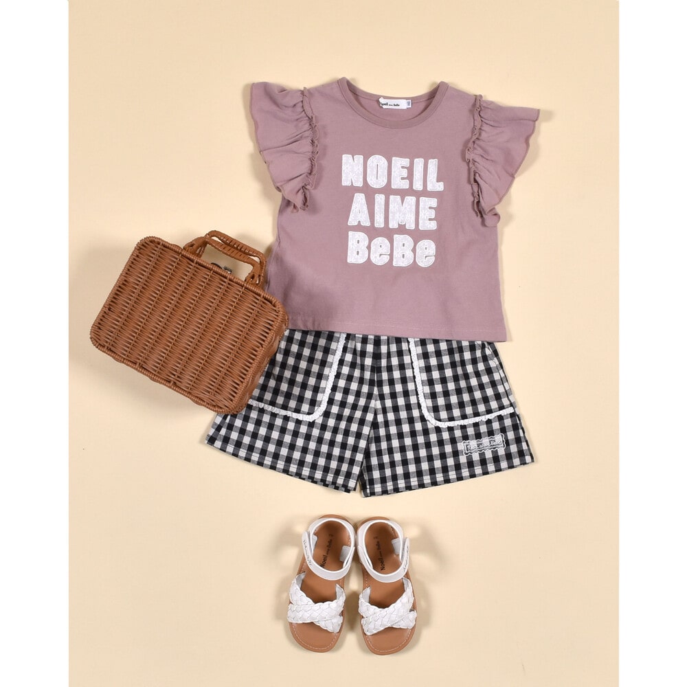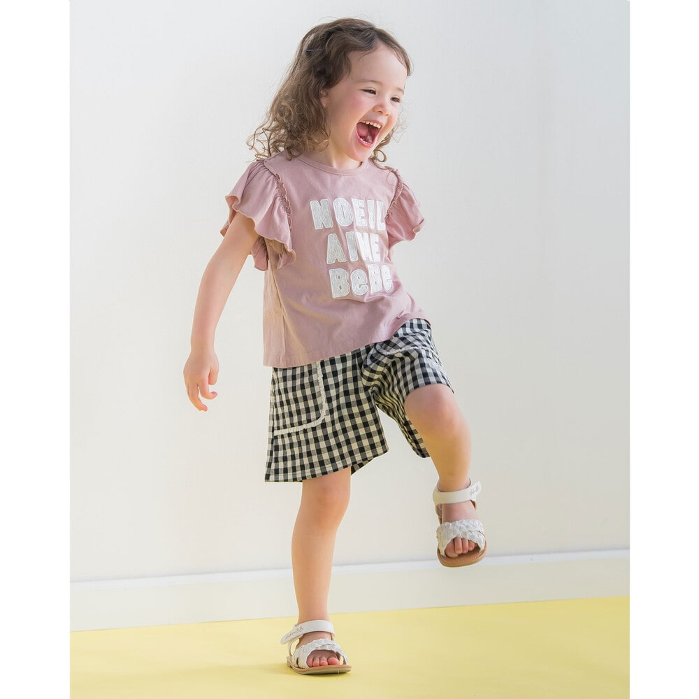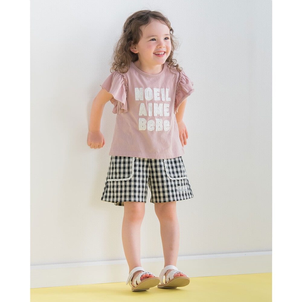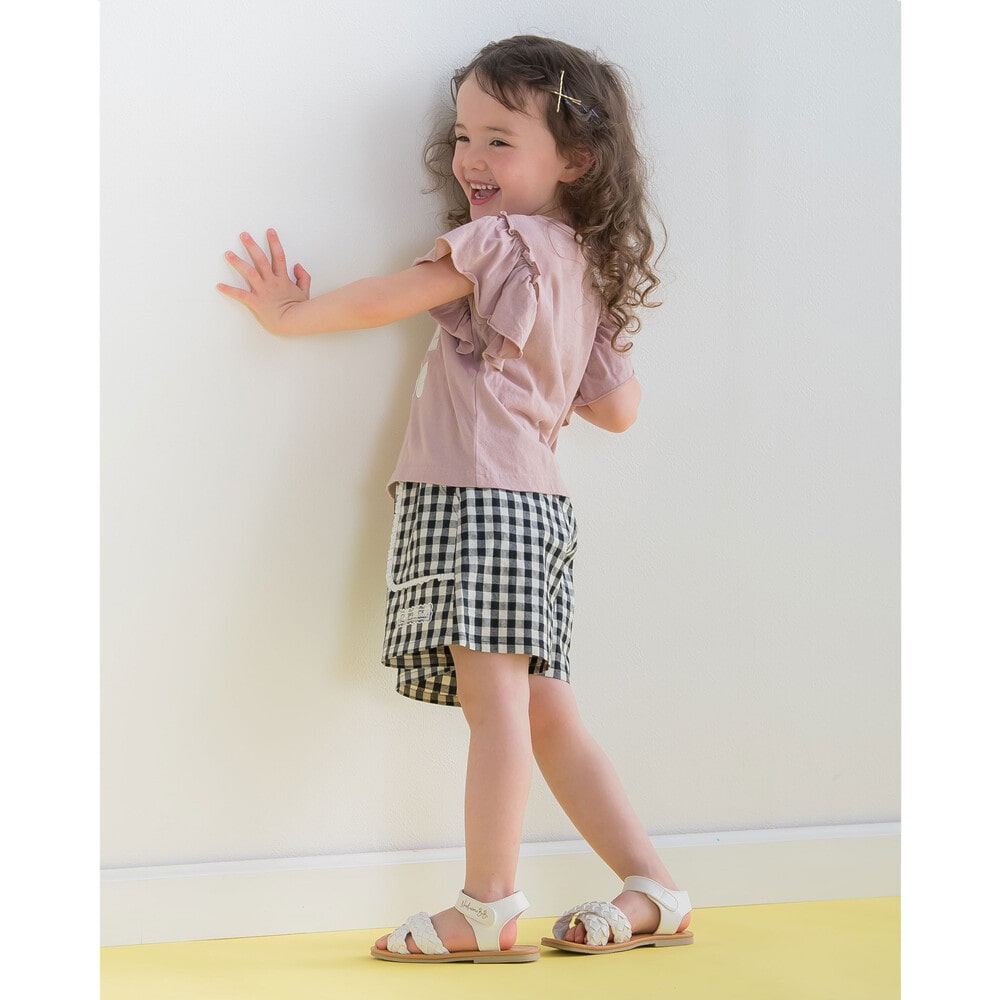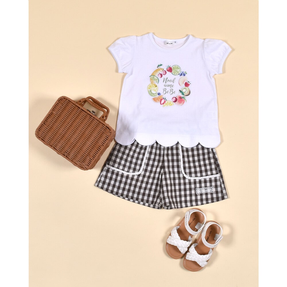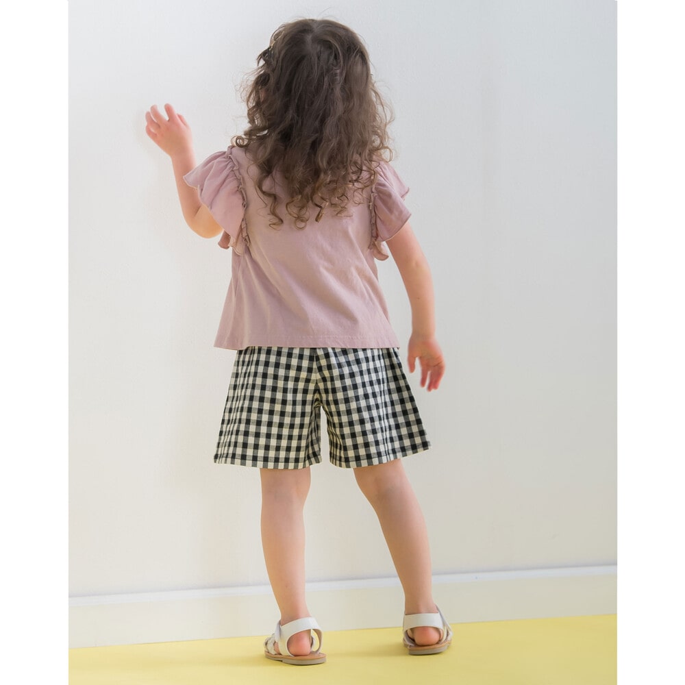 ヒラヒラ揺れる肩のフリルがかわいい半袖のTシャツ(1775-42589)や色とりどりのフルーツがポイントの半袖Tシャツ(1775-42590)のコーディネートがおすすめです。