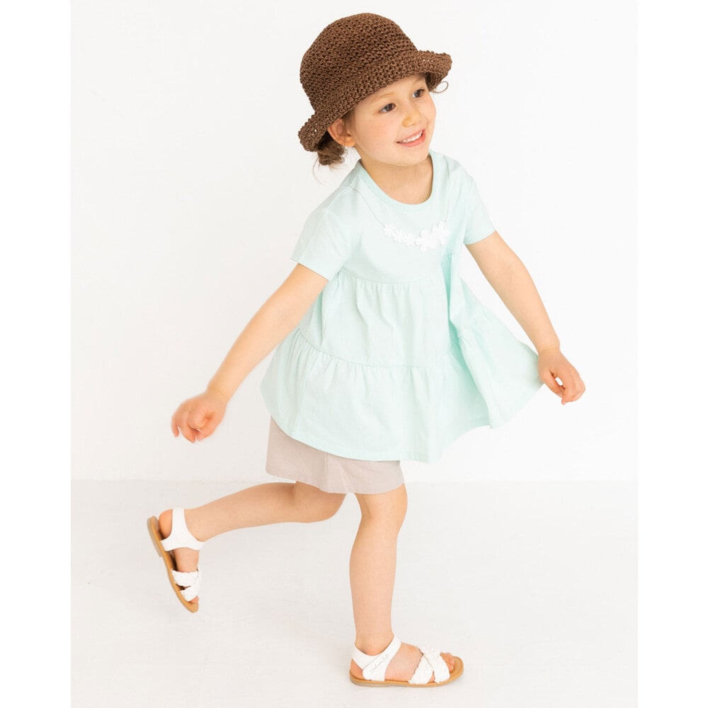 レースのベストがセットになったギンガムチェック柄の半袖ワンピース(1762-43003)や前面にプリントされたカップケーキが可愛い半袖Tシャツ(1775-43096)とふんわり広がるシルエットが可愛いショートパンツ(1770-43068)と合わせたコーディネートがおすすめです。