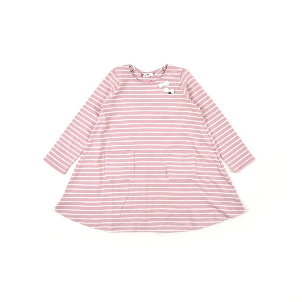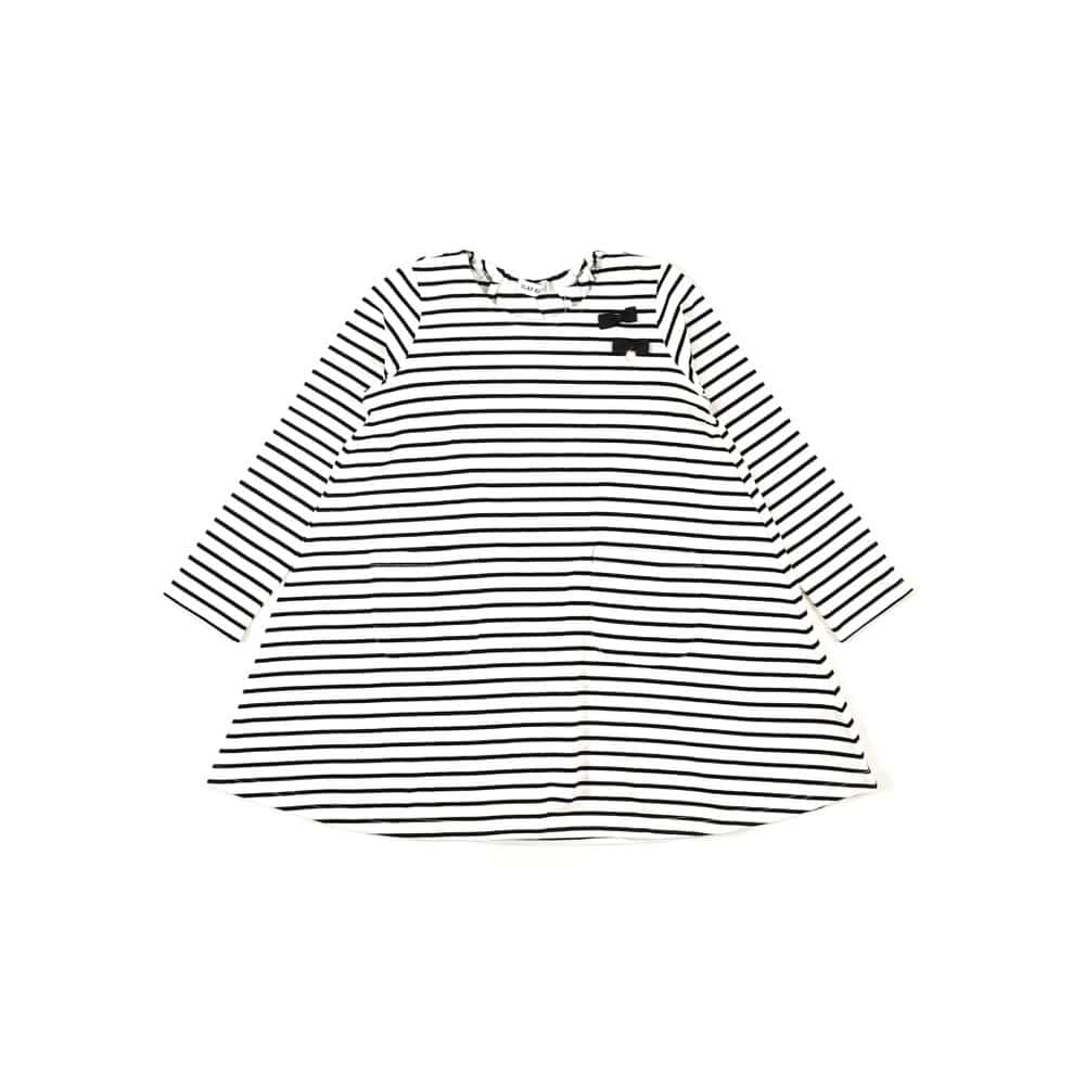 胸元に2つリボンがついたボーダーワンピース。