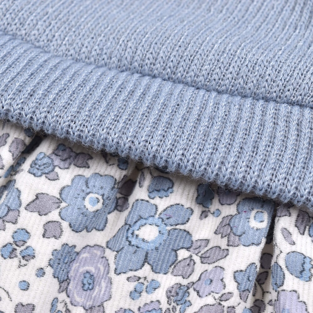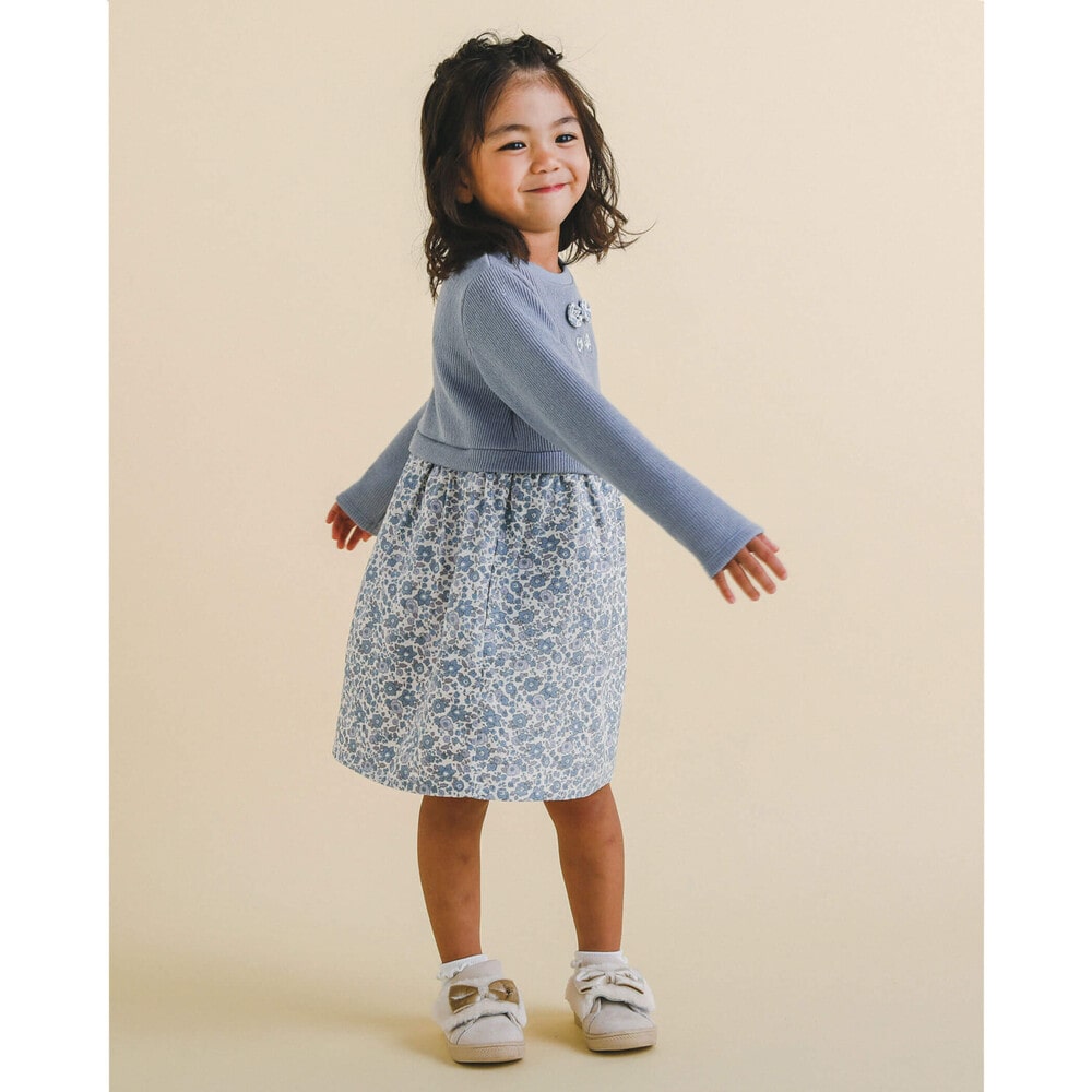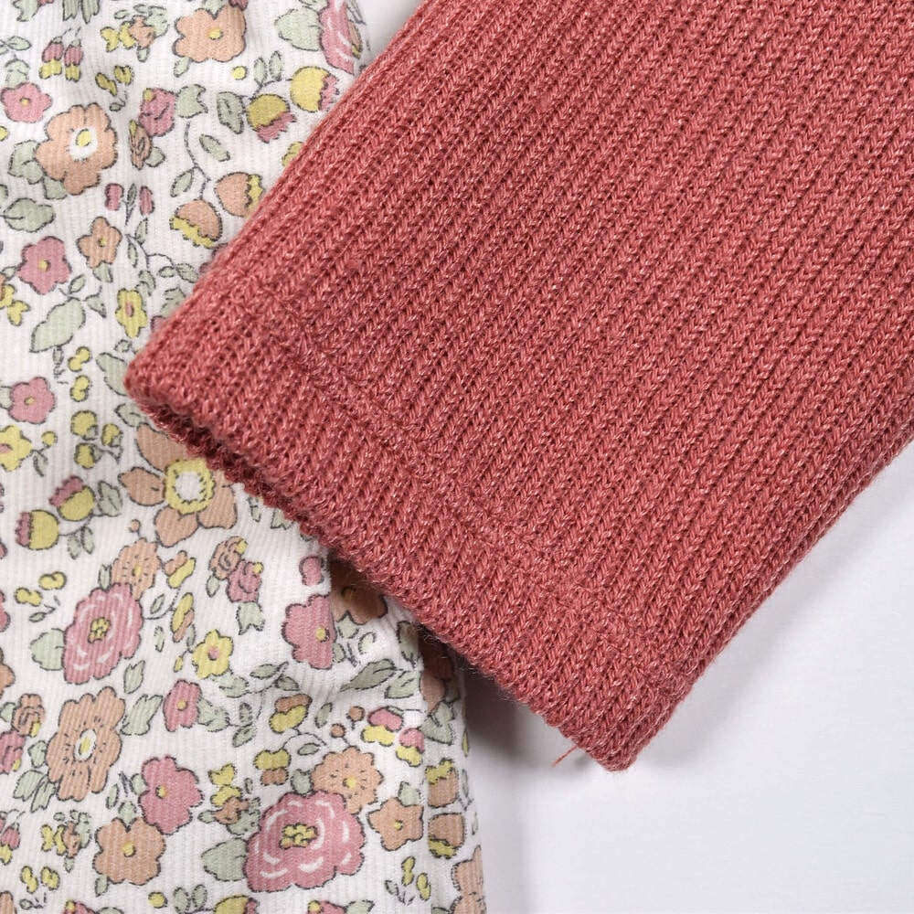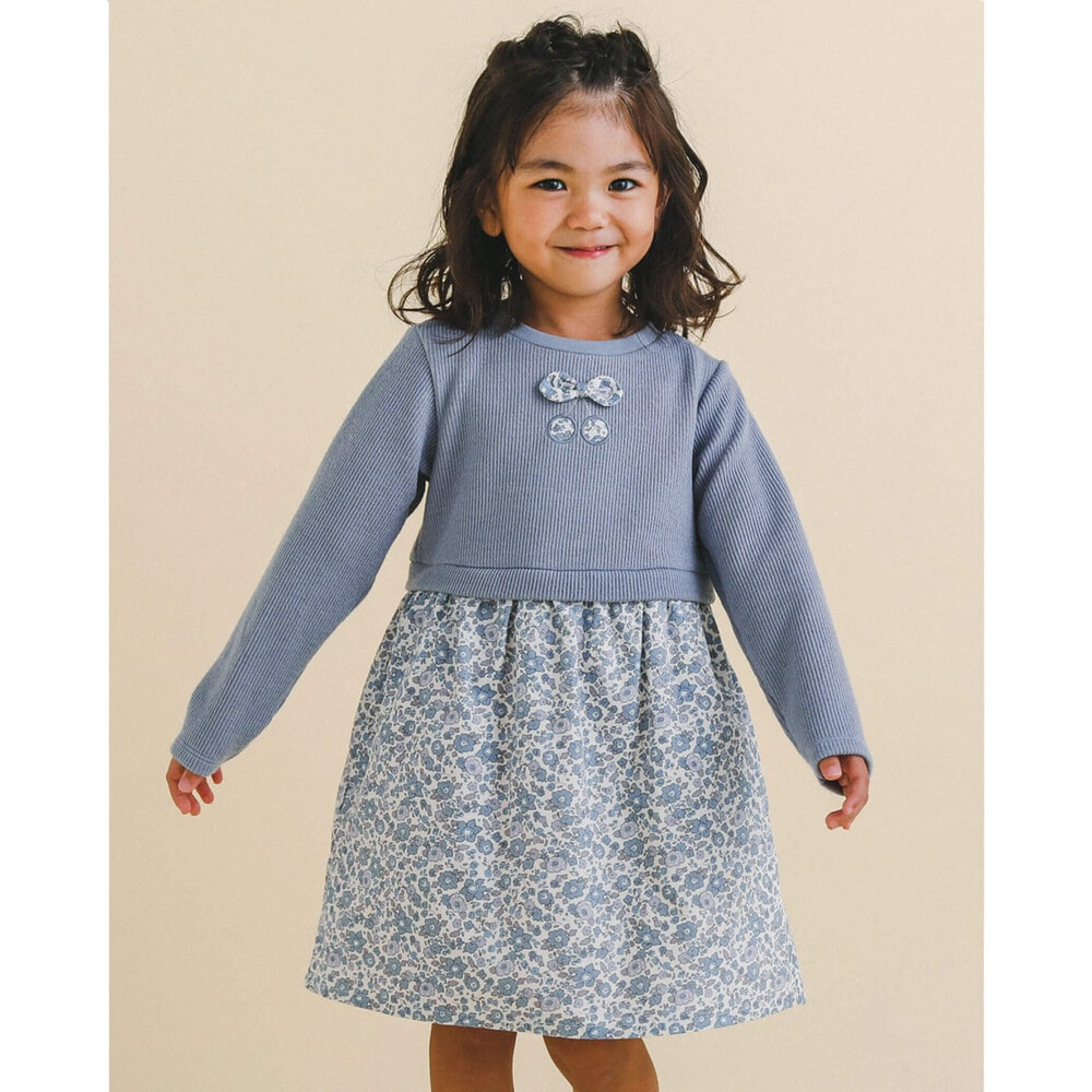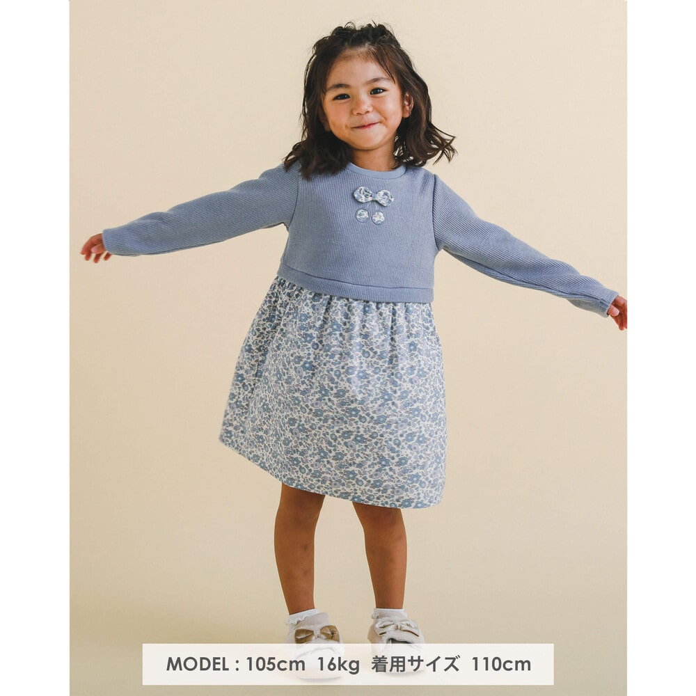 【 お揃い 】 花柄 コールテン × 無地 ニット ドッキング ワンピース (80~130cm)