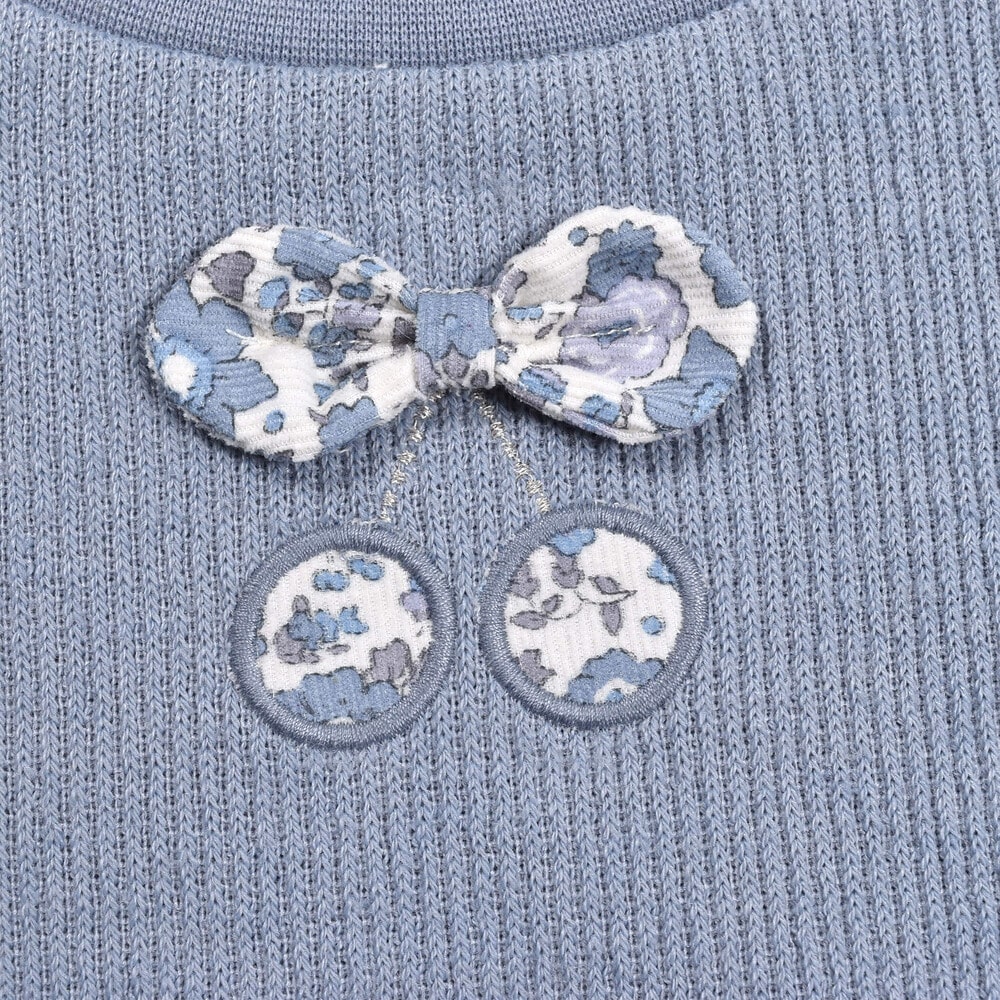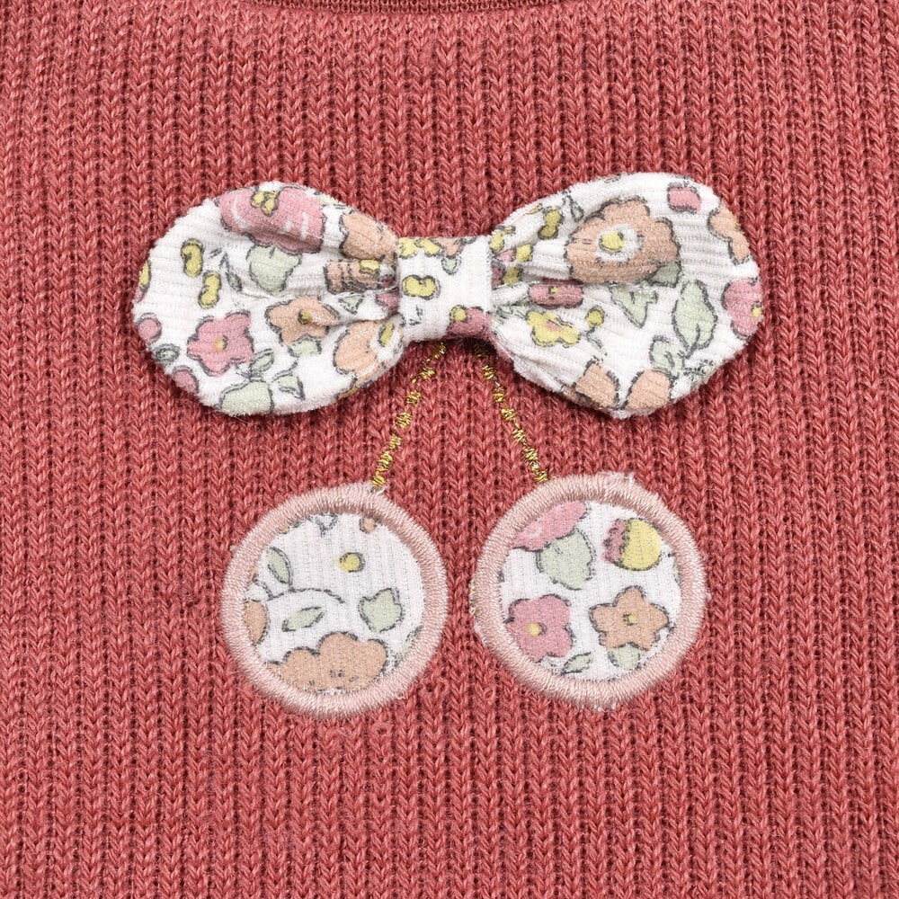 フロントにあしらったチェリーパッチに、スカート部分と同じ花柄を使用しているので全体がまとまってオシャレな印象に◎