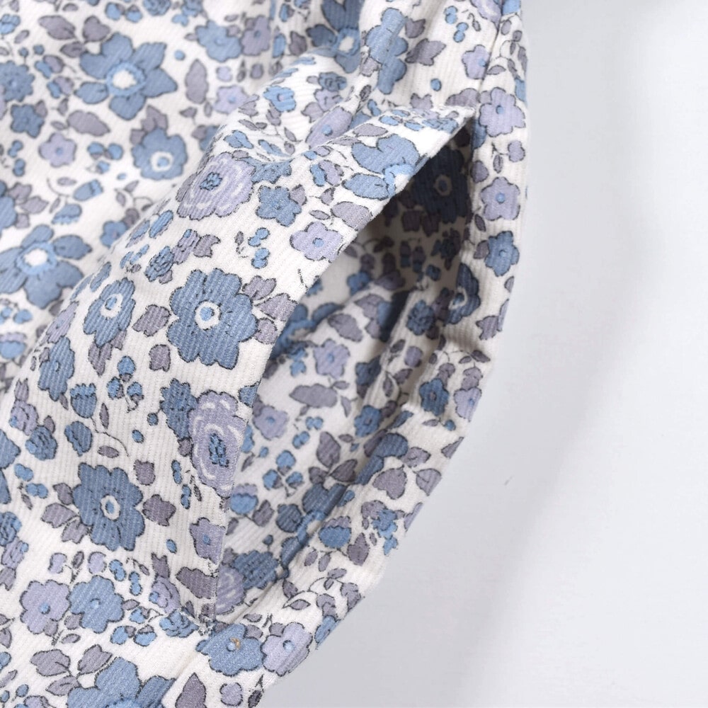 花柄のコールテン素材と無地のニット素材を切り替えた長袖ワンピース。