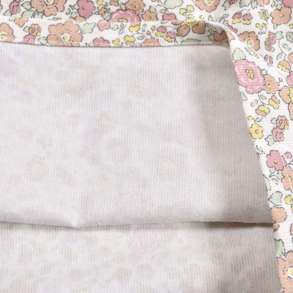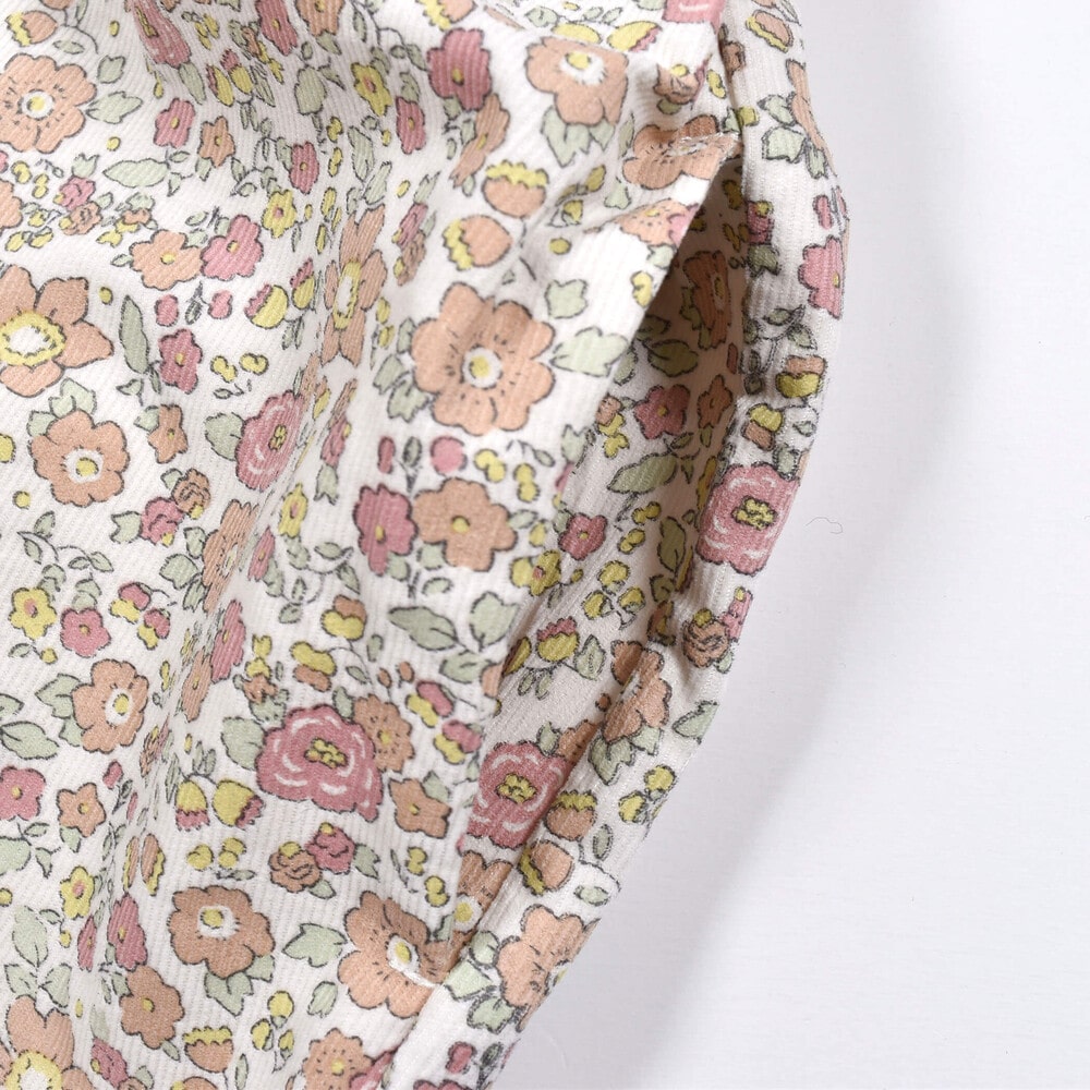 ベビーサイズでも花柄素材を使用したロンパース(1837-48146)を展開しているので、姉妹でのシミラーコーデにも◎
