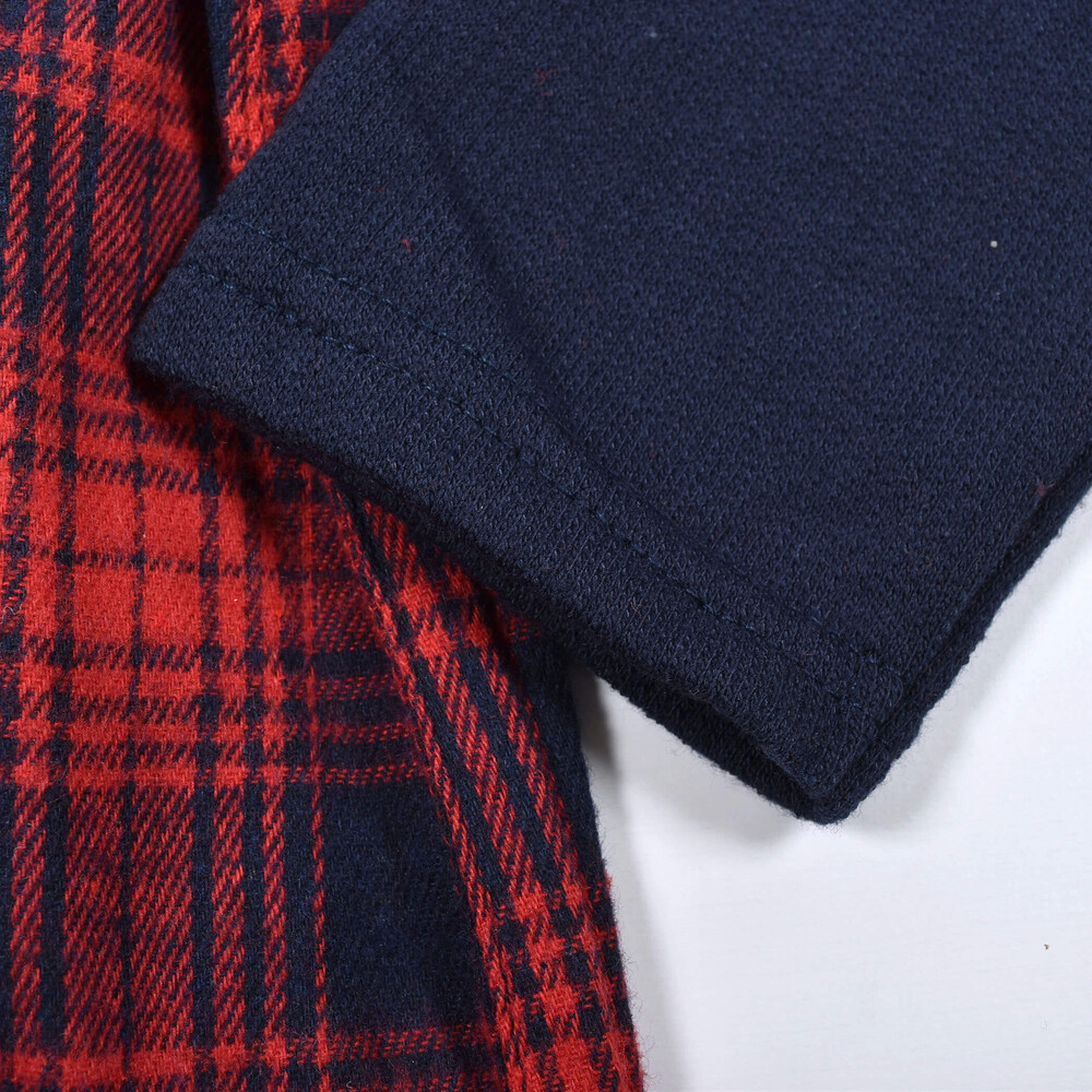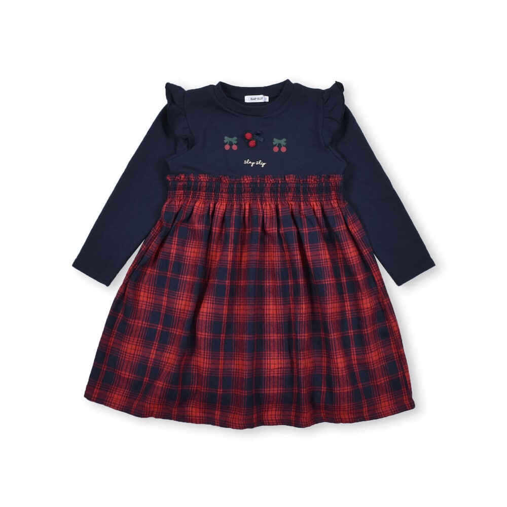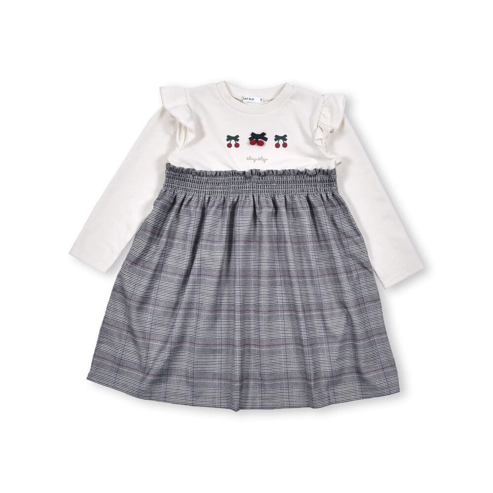 トレーナーに秋冬らしいチェック生地をドッキングした長袖ワンピース。