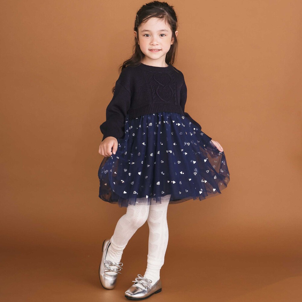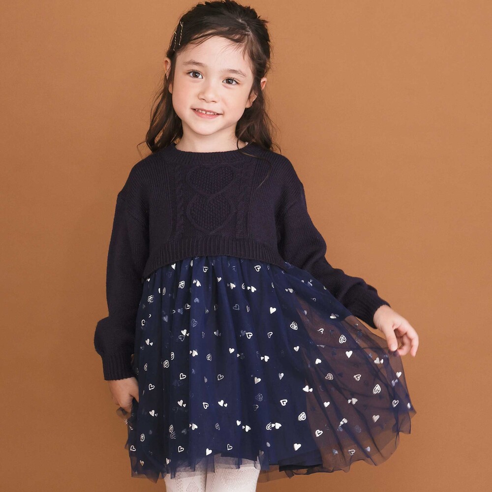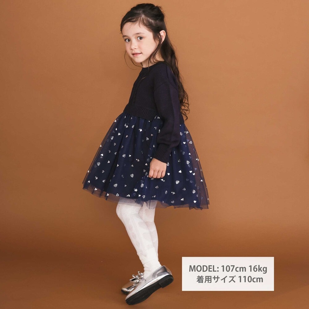 上身頃はハート柄の編地を施したニット素材で、優しい風合いと可愛らしさを両立。