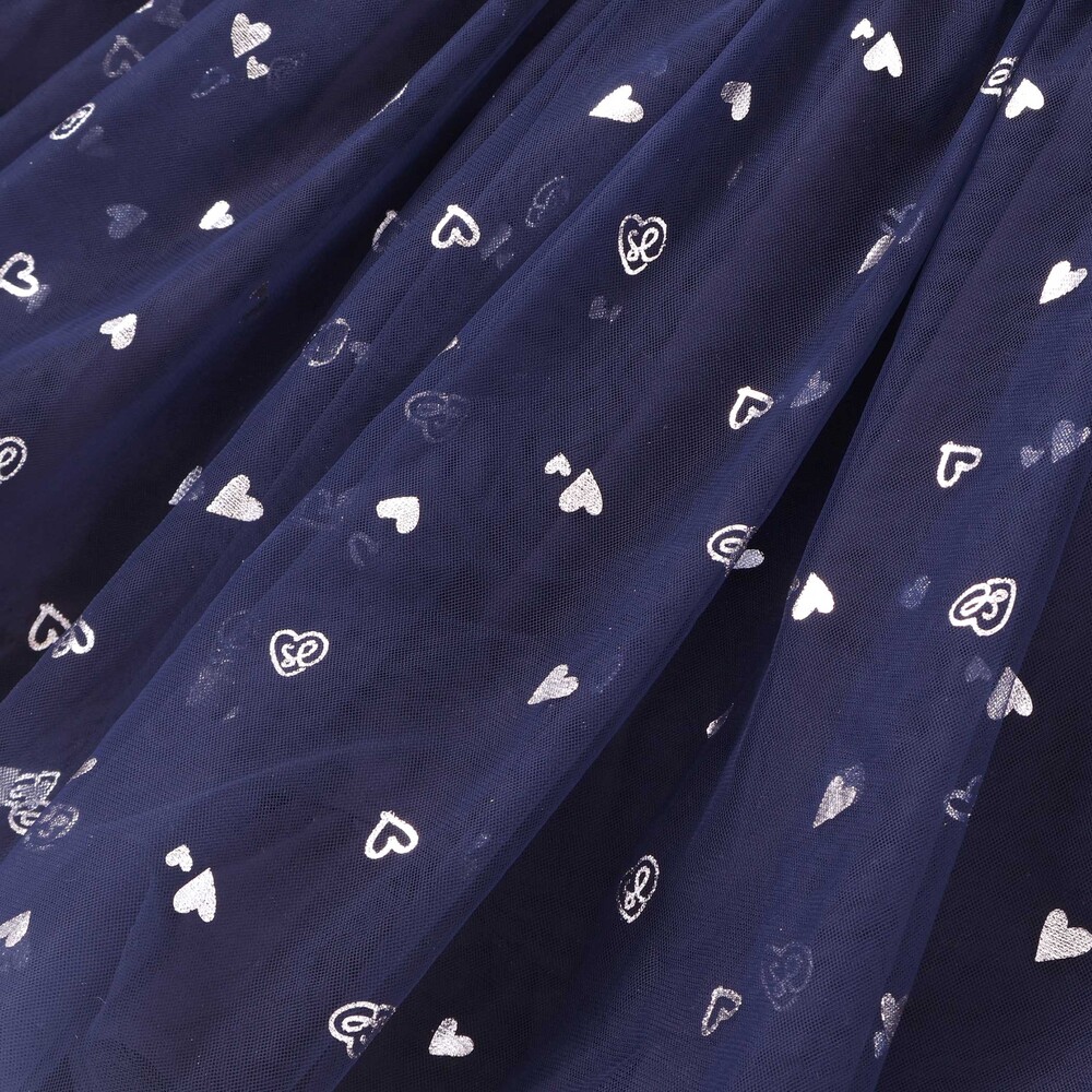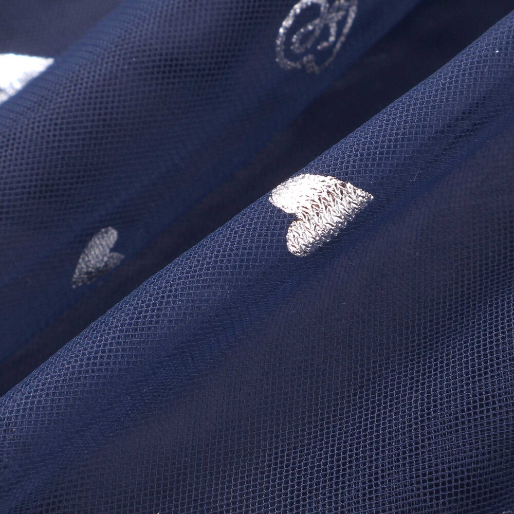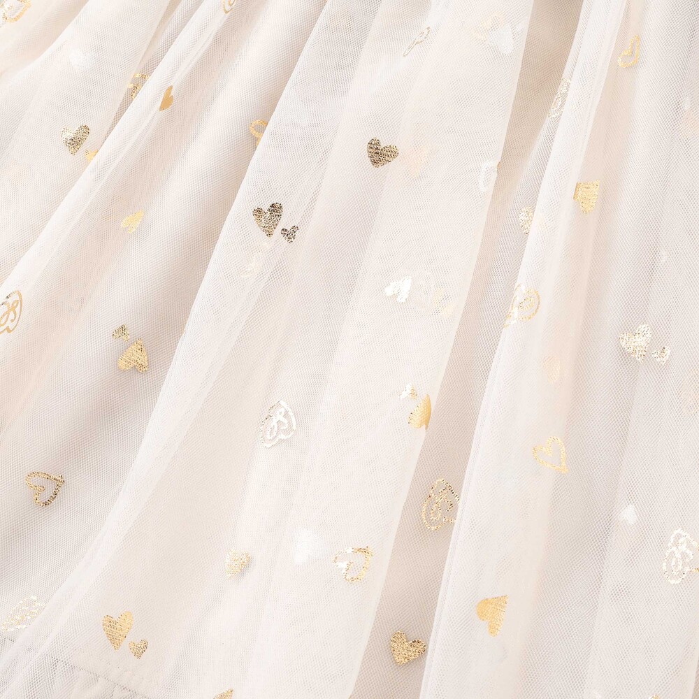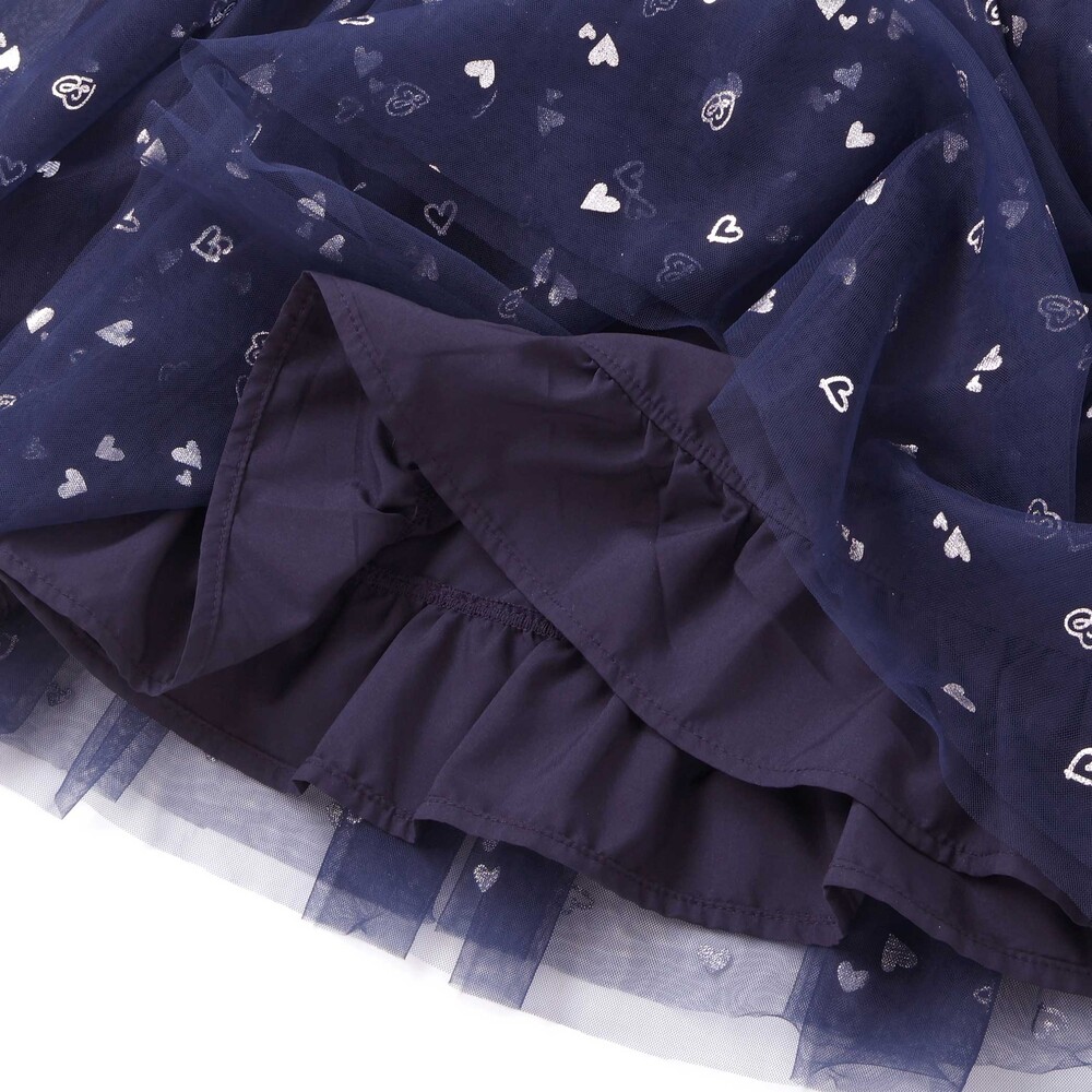 スカート部分は、箔プリントのハート柄チュールと無地チュールを重ねた贅沢仕様で、動くたびにふんわりと揺れ、華やかな雰囲気を演出。