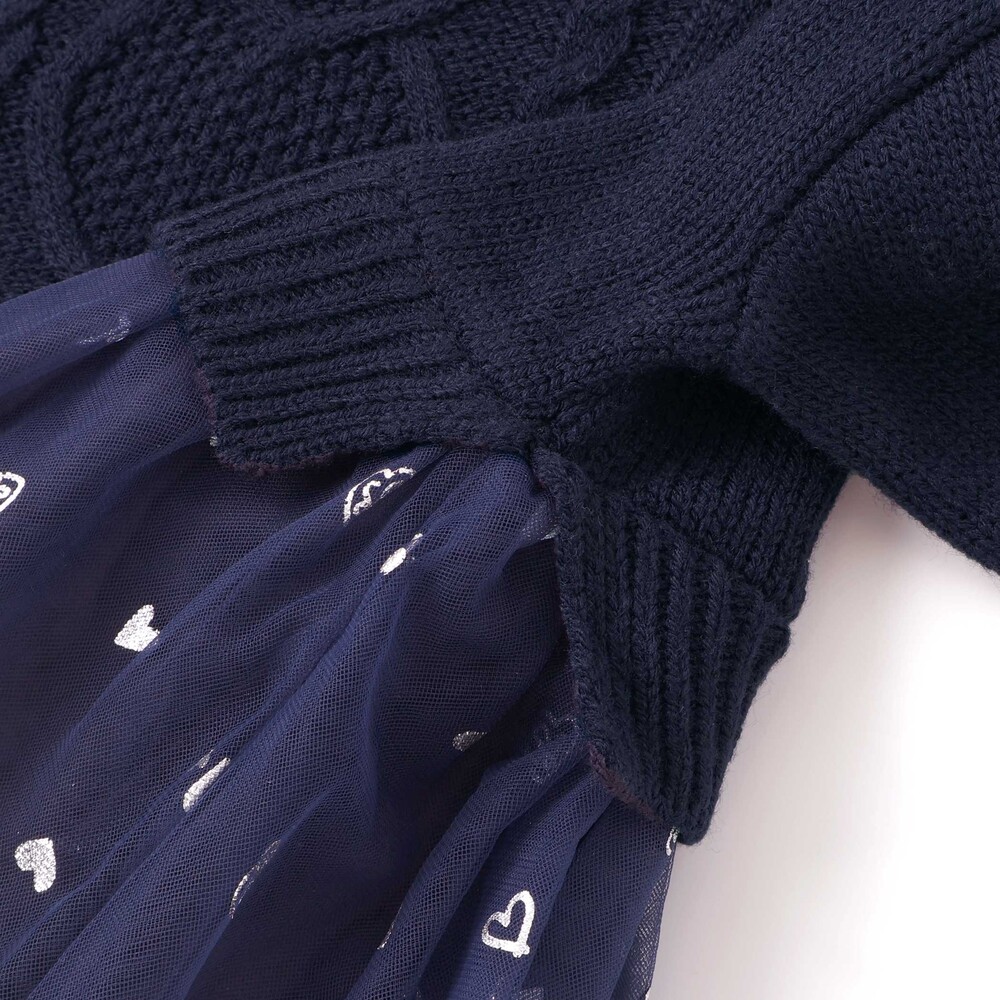 ニットの温かみとチュールの軽やかさを組み合わせたデザインで、秋冬シーズンを華やかに彩ります。