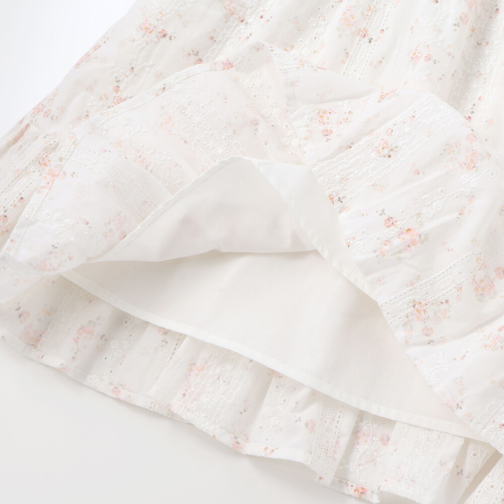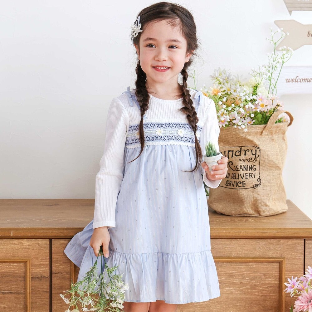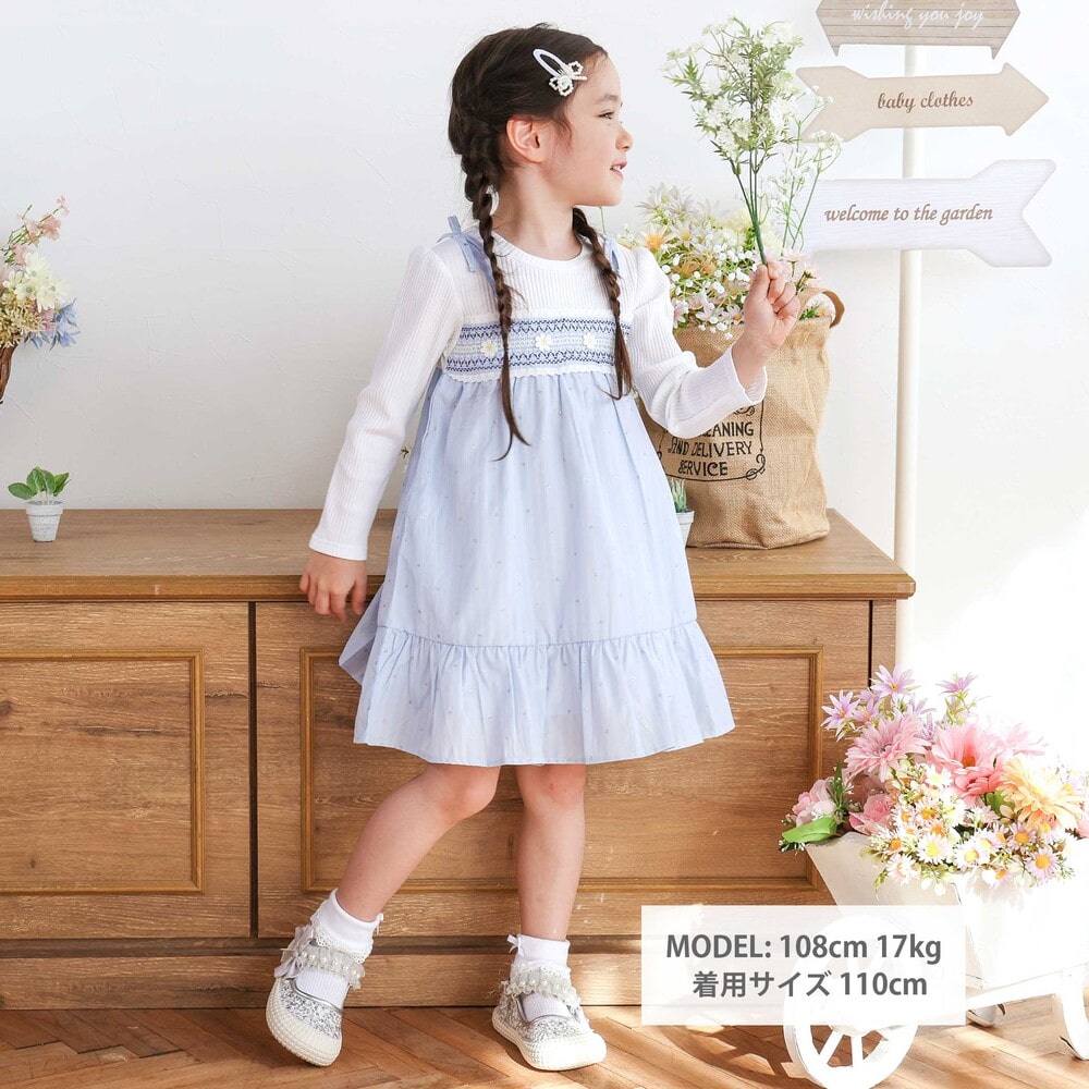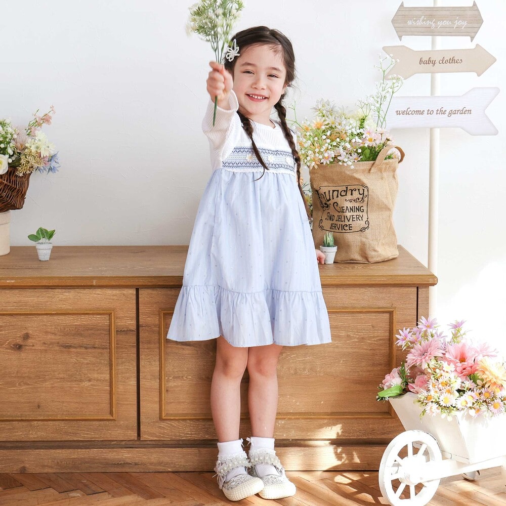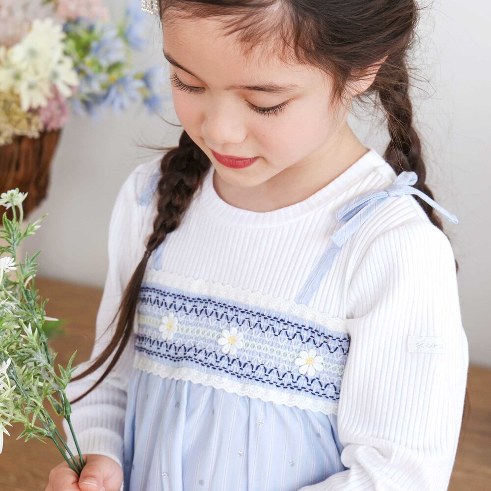 胸元には繊細なスモッキング刺しゅうをあしらい、一部には小さなお花モチーフをプラスしてより可憐な印象に。