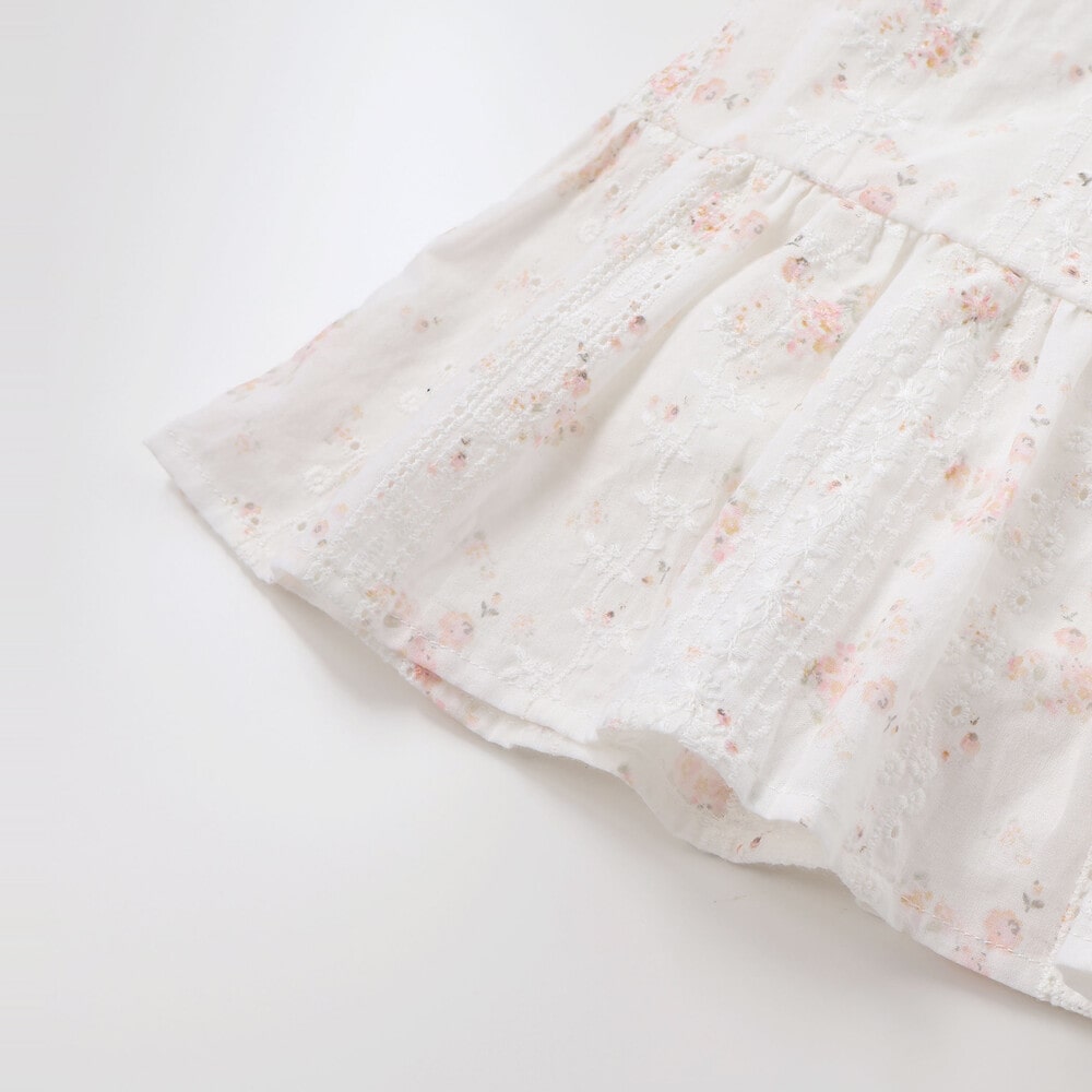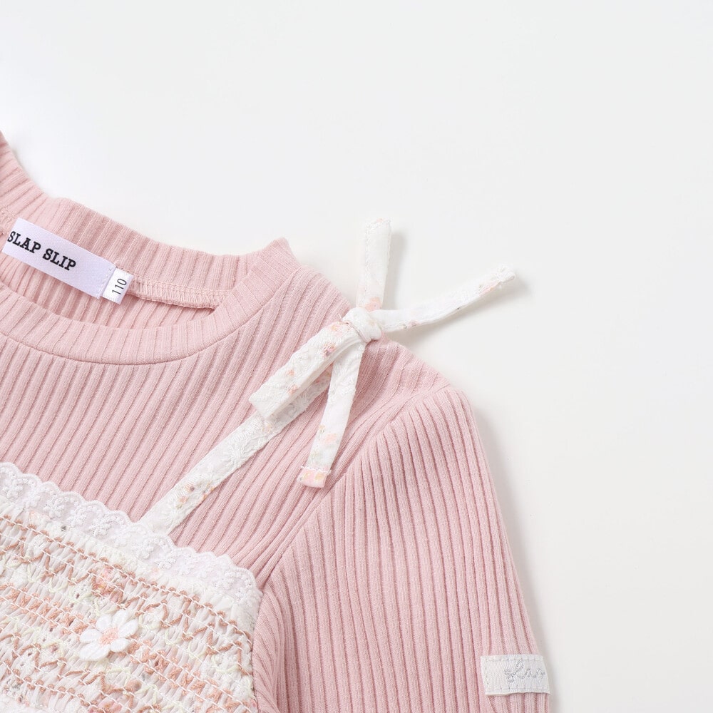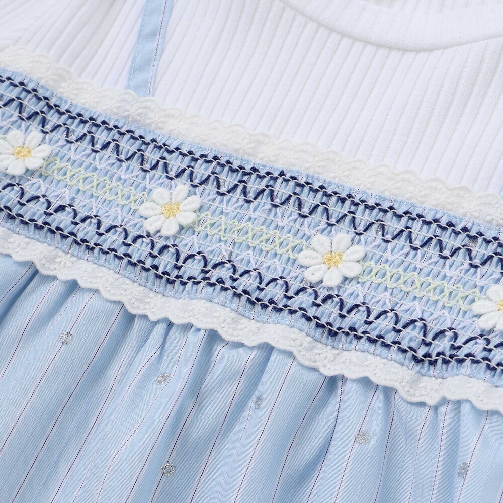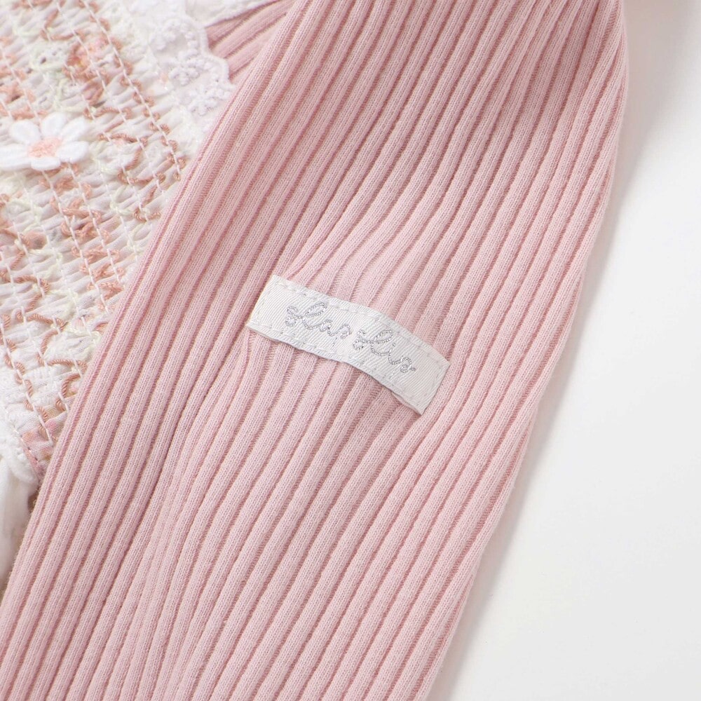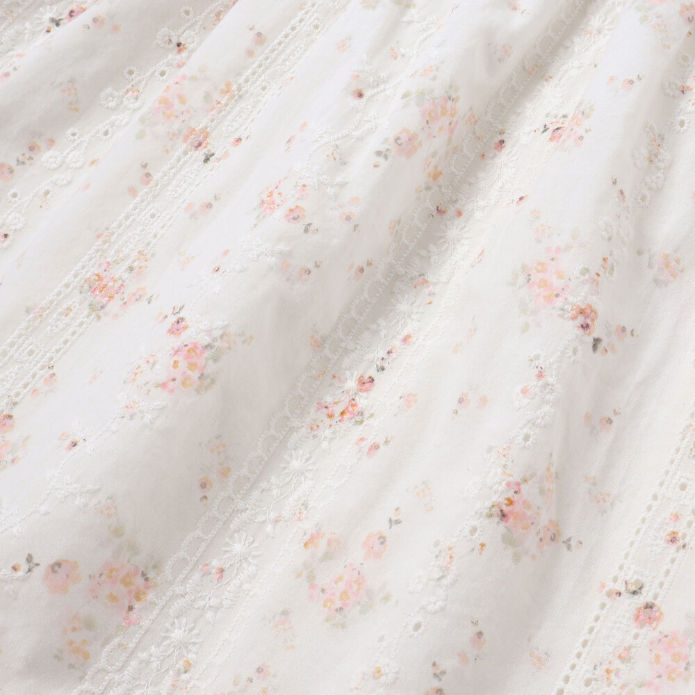 胸元には繊細なスモッキング刺しゅうをあしらい、一部には小さなお花モチーフをプラスしてより可憐な印象に。