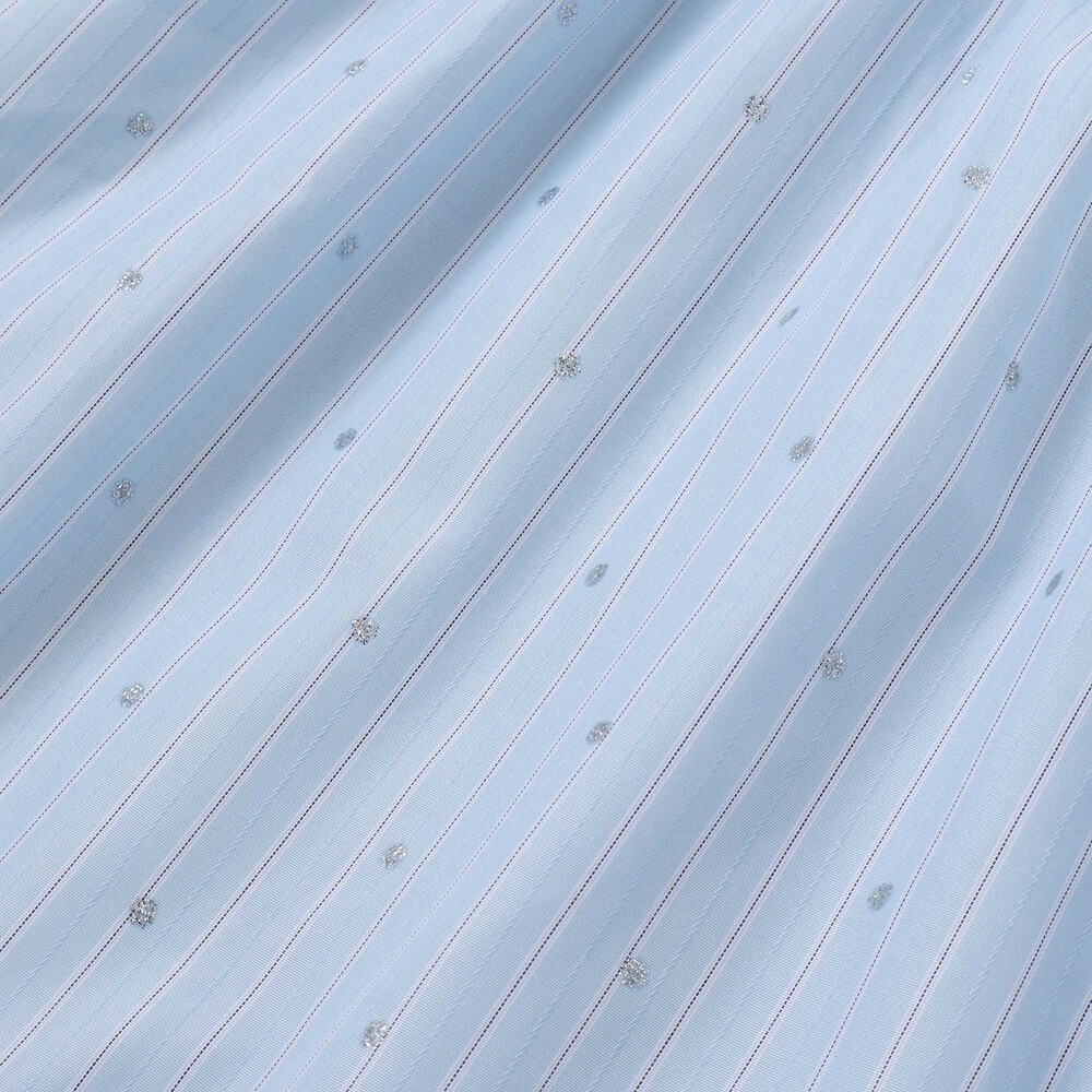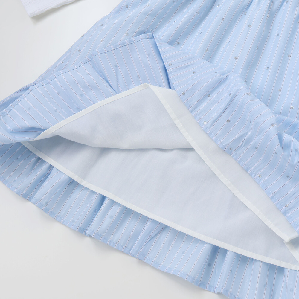 ホワイト×ブルー系:ホワイトに映えるブルーのスカート。きらりと輝くラメのストライプが上品な華やかさをプラス