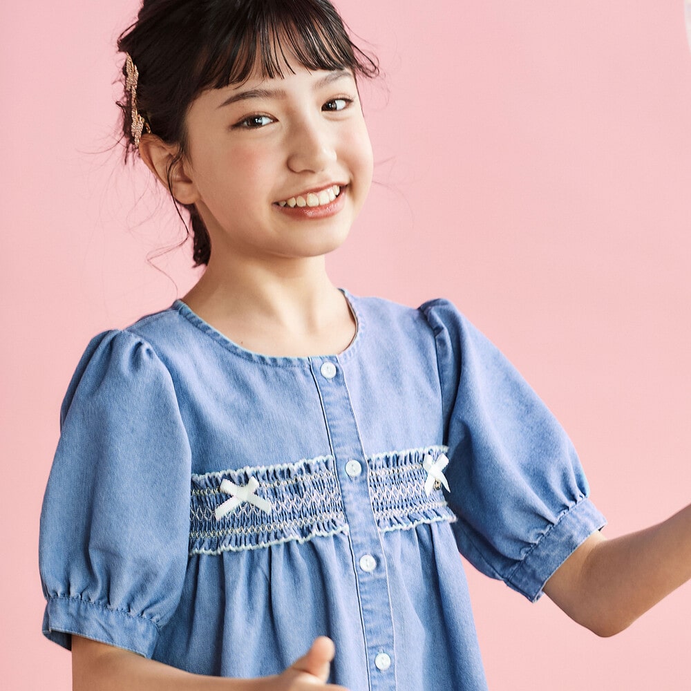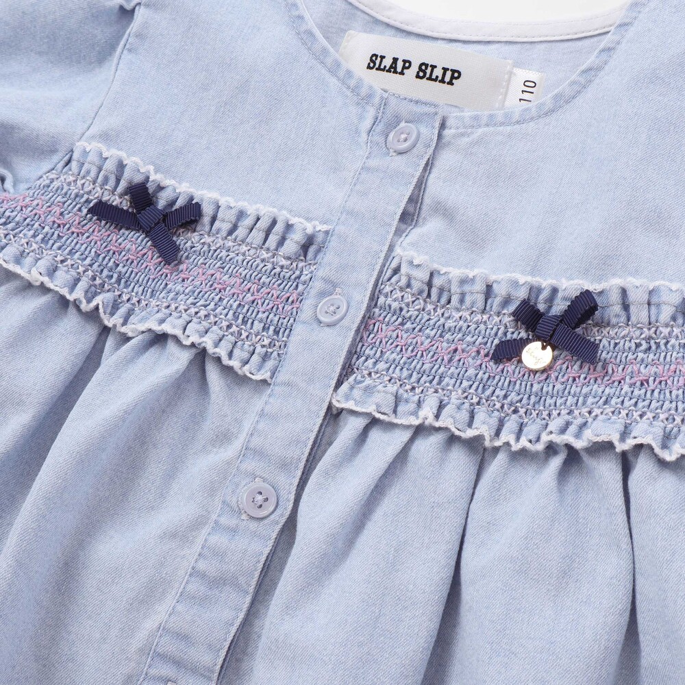 胸元には細やかなスモッキング刺しゅうをほどこし、その上にちょこんとリボンをオン。