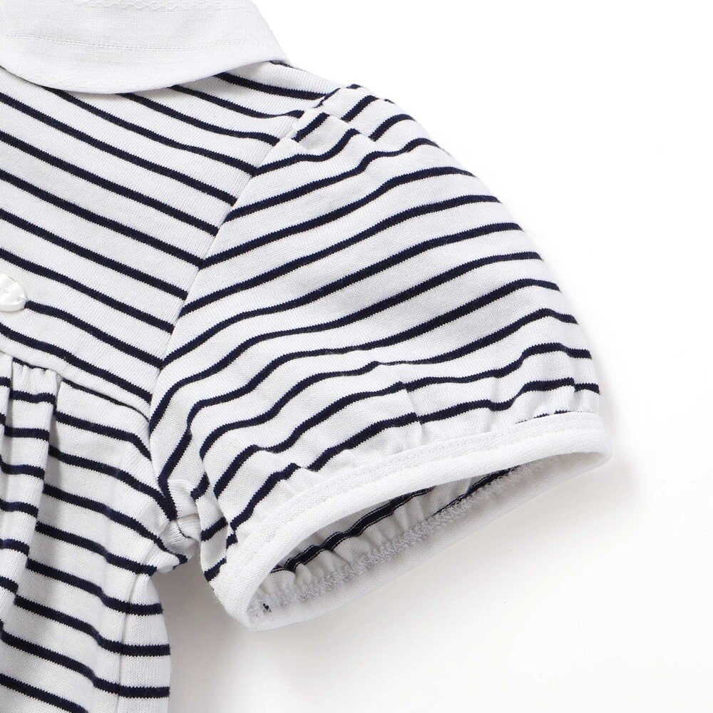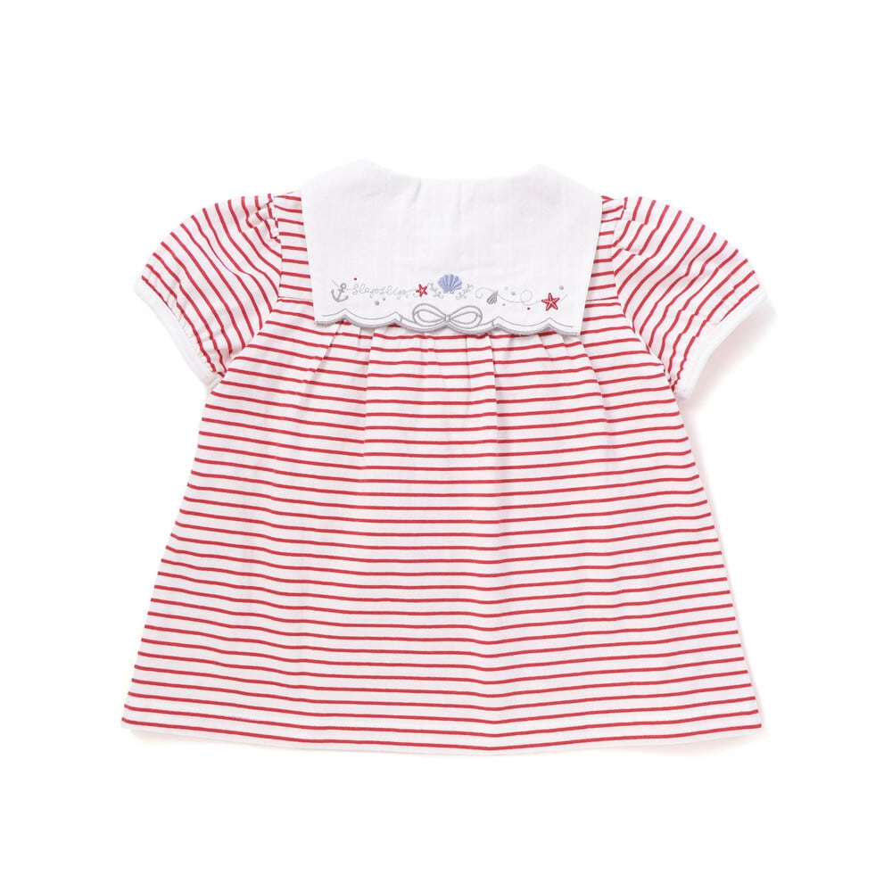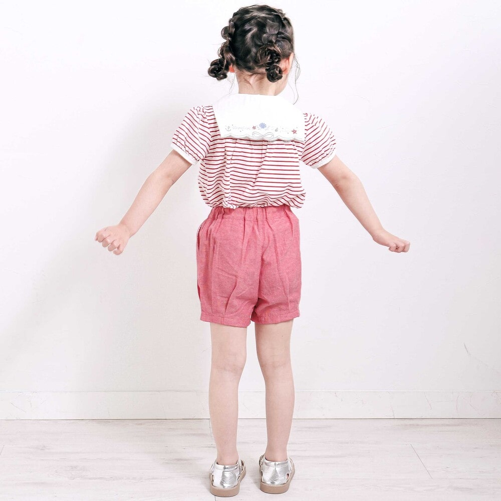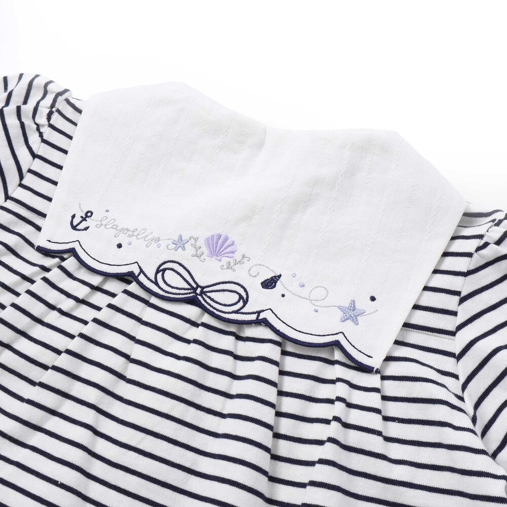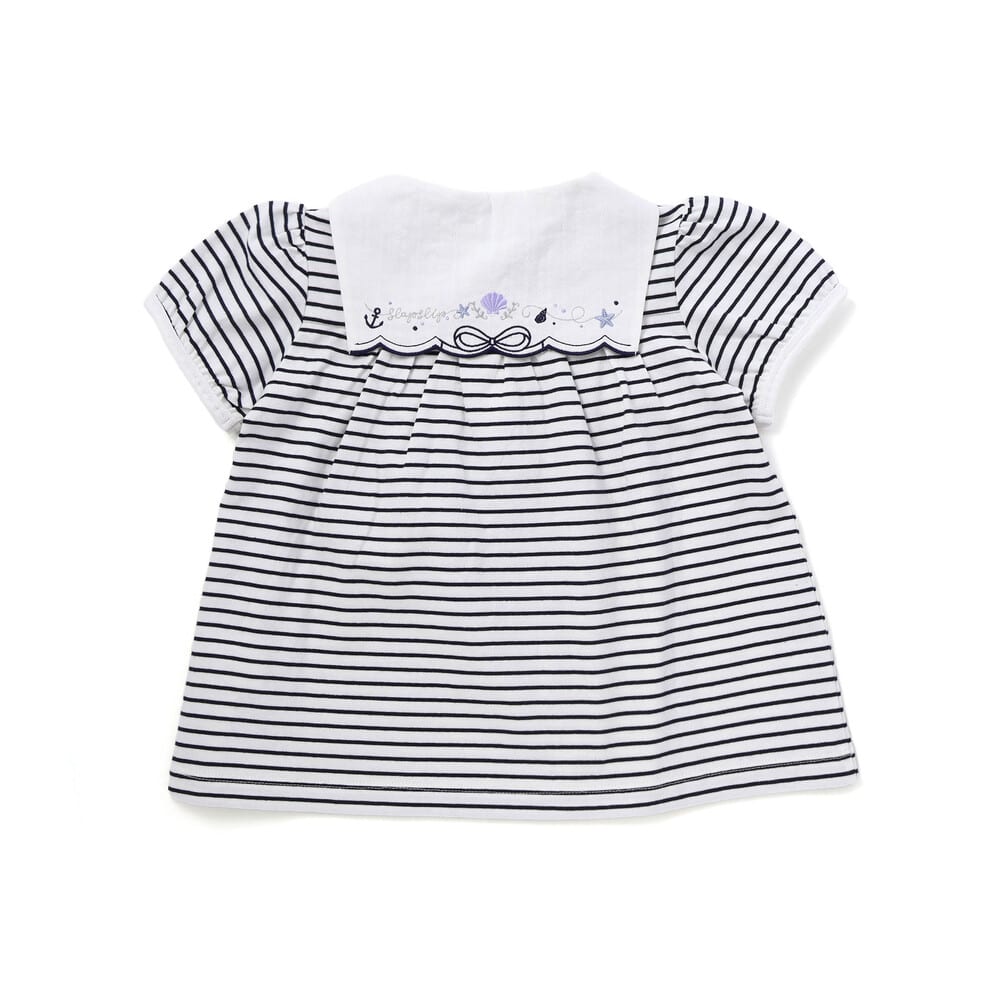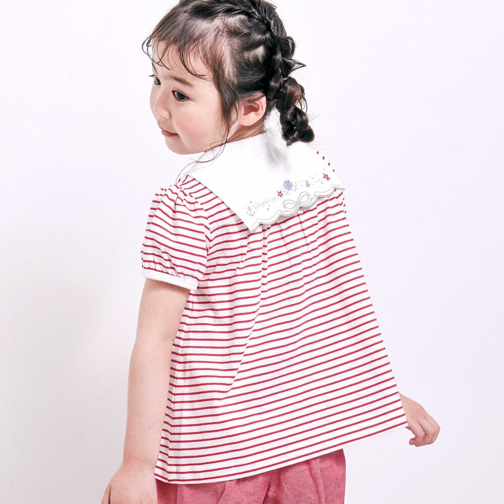 ボーダー柄のTシャツはパフ袖デザインで可愛らしく、襟は後ろがスカラップになり、イカリや貝殻の刺しゅうがさりげないアクセントに。