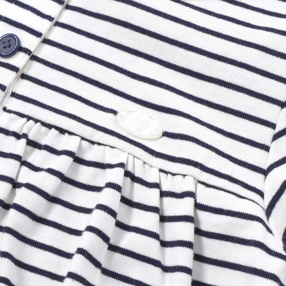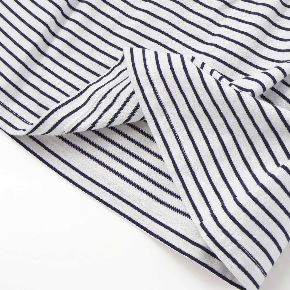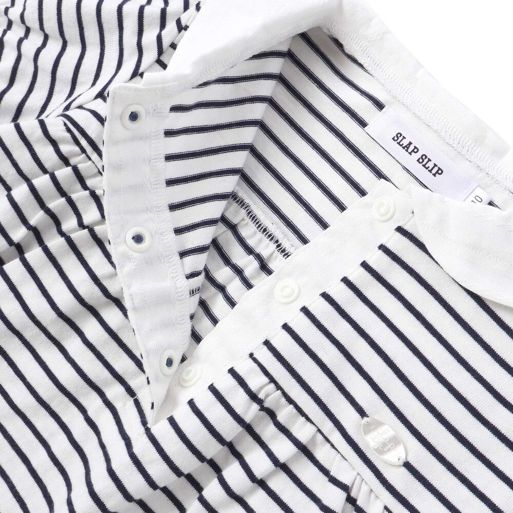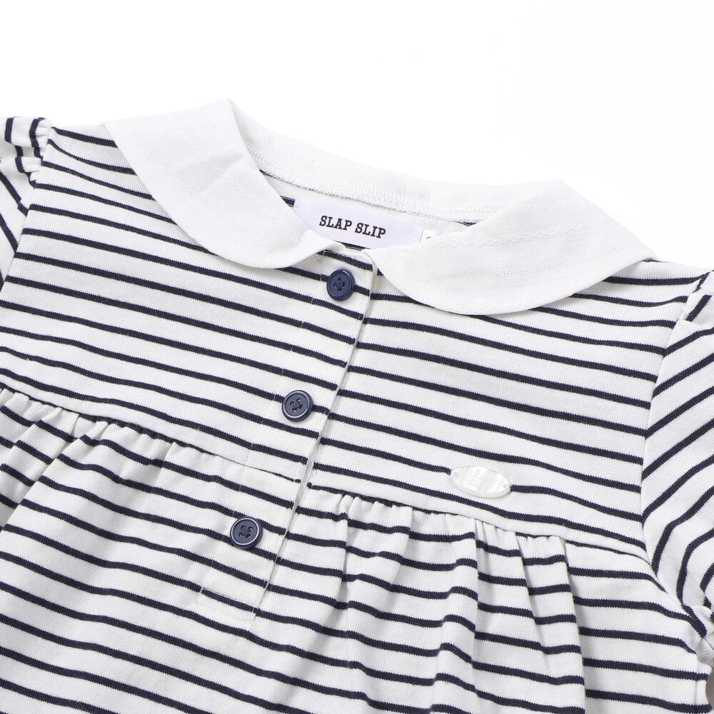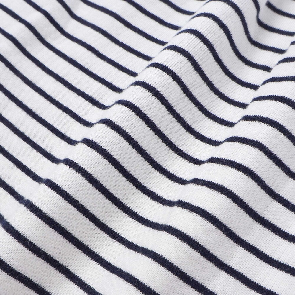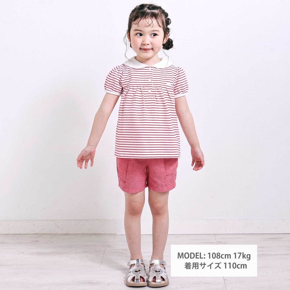 ボーダー柄のTシャツはパフ袖デザインで可愛らしく、襟は後ろがスカラップになり、イカリや貝殻の刺しゅうがさりげないアクセントに。