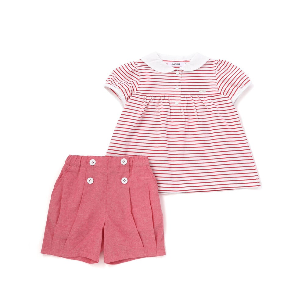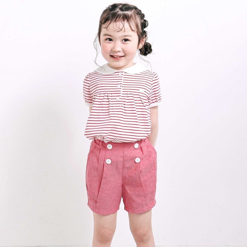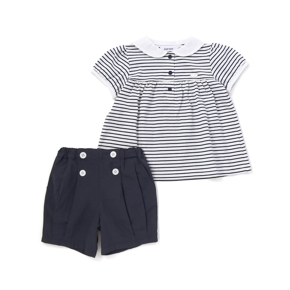 セーラーカラーが目を惹く半袖Tシャツと、飾りボタン付きパンツを組み合わせた、マリンテイストたっぷりの女の子用セットアップ。