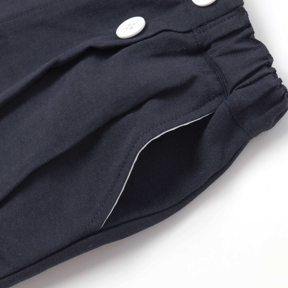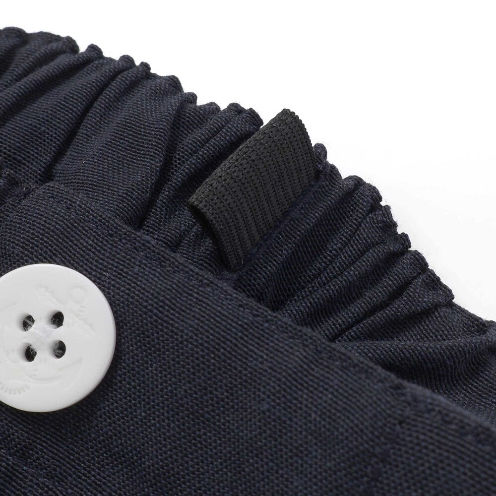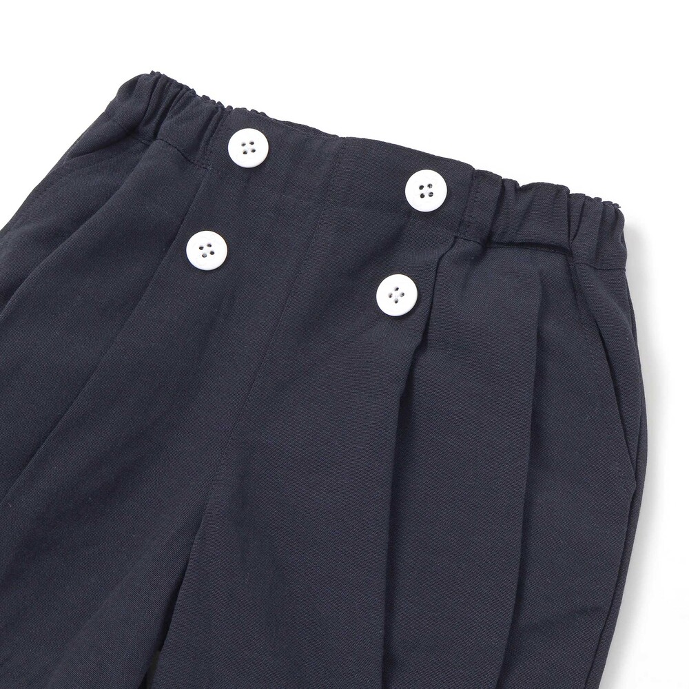 パンツはセーラー服のように並んだ4つの飾りボタンがポイントで、ウエストにタックを入れ、ふんわりと上品なシルエットに。