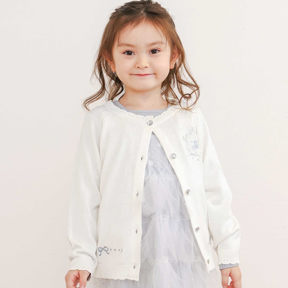 裾口や袖口のスカラップがキュートな女の子用の長袖カーディガン。