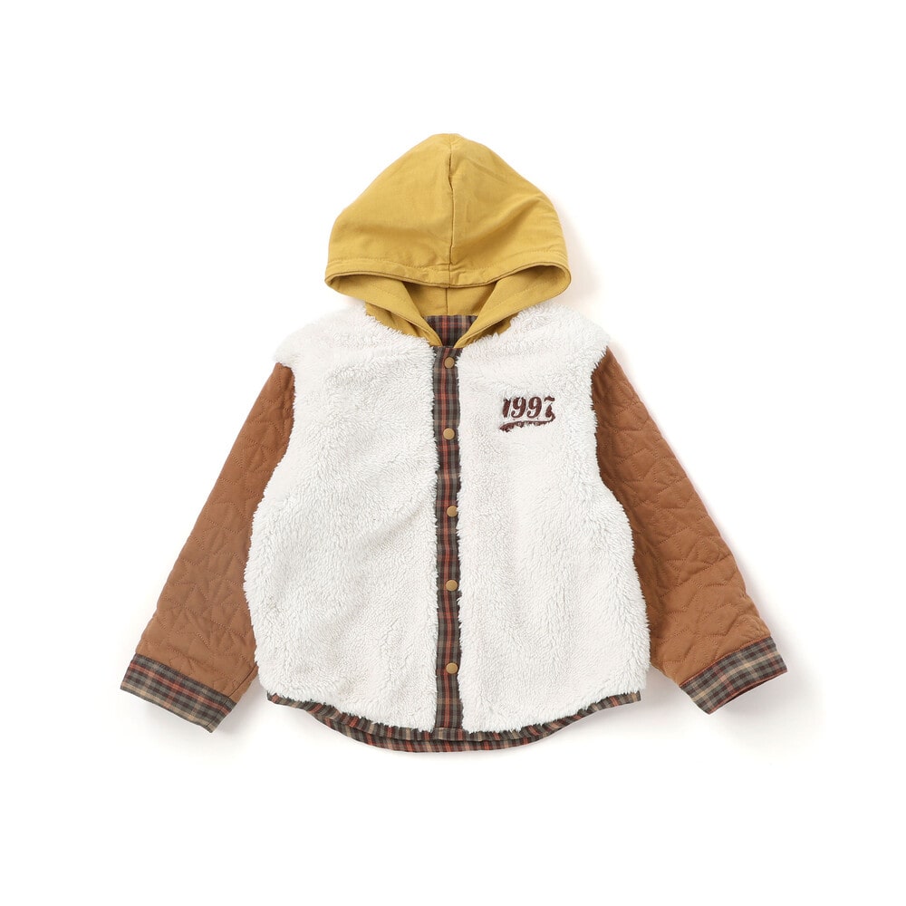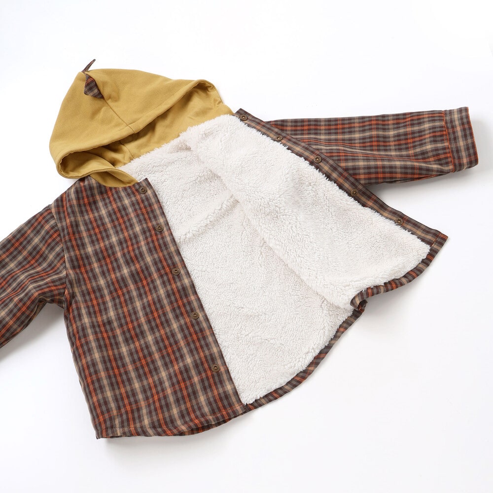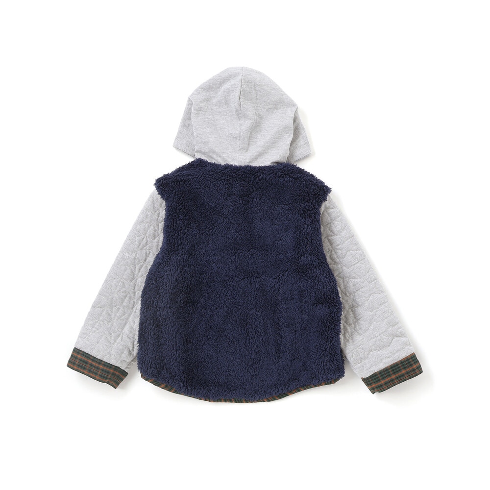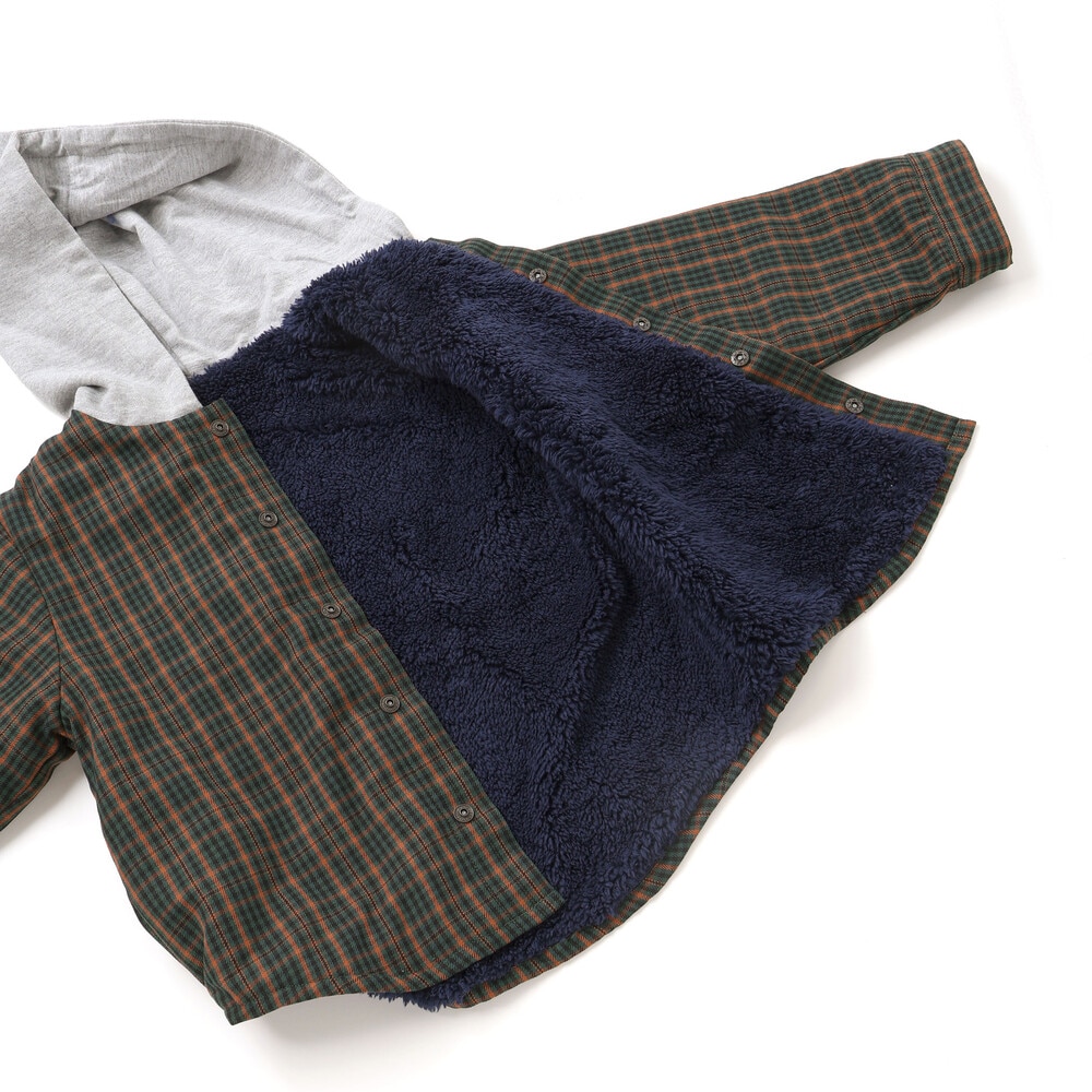 チェックとボア素材のリバーシブルで、気分に合わせて着こなしを楽しめる男の子用ジャケット。