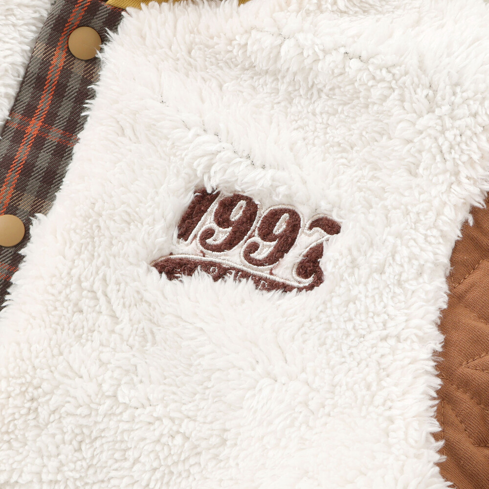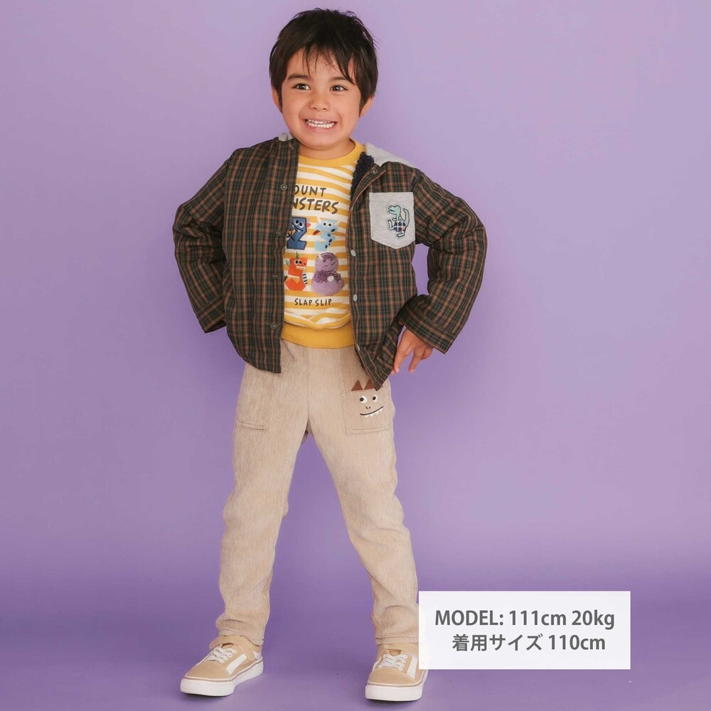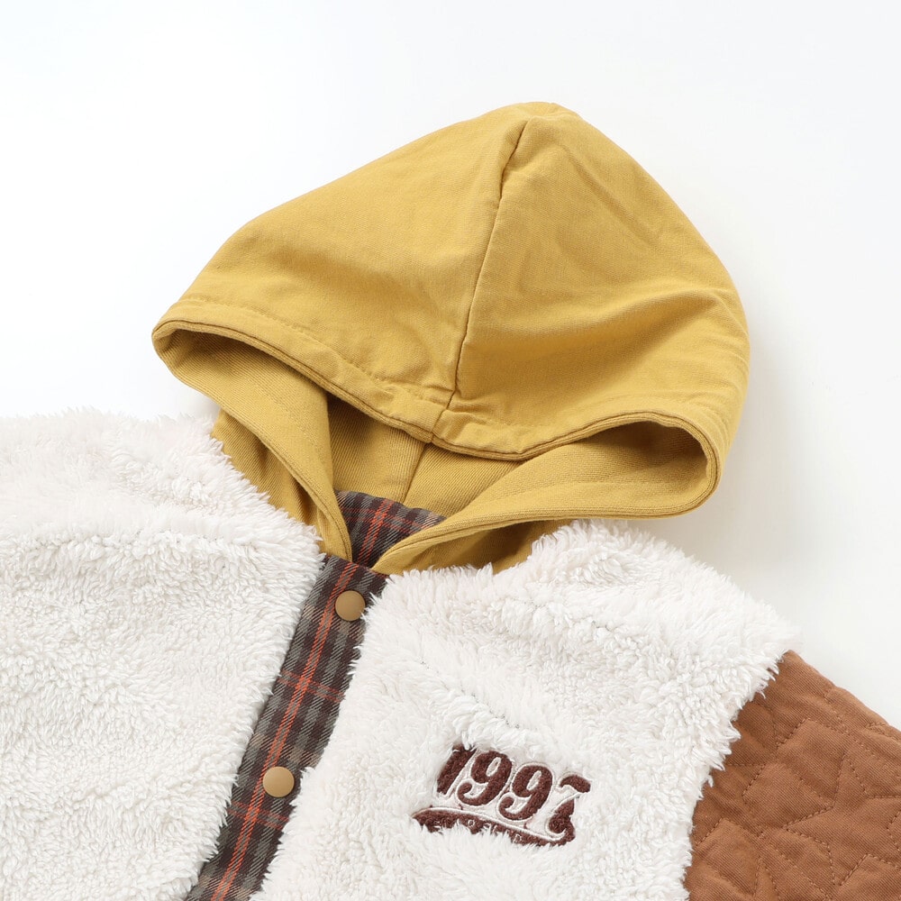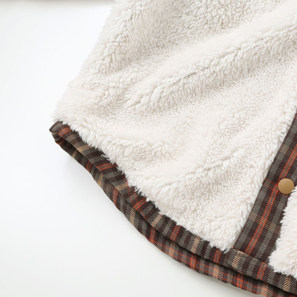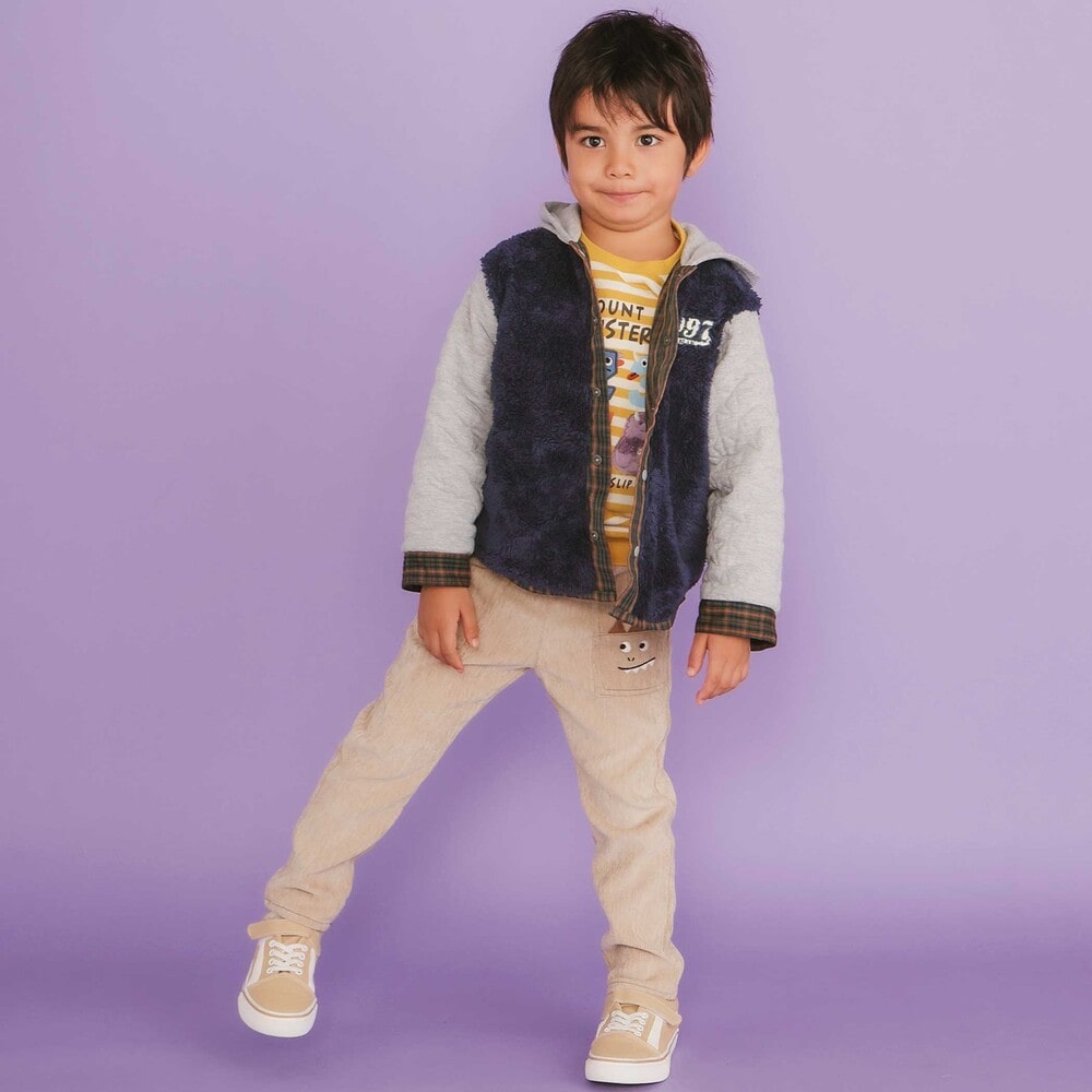 チェックとボア素材のリバーシブルで、気分に合わせて着こなしを楽しめる男の子用ジャケット。