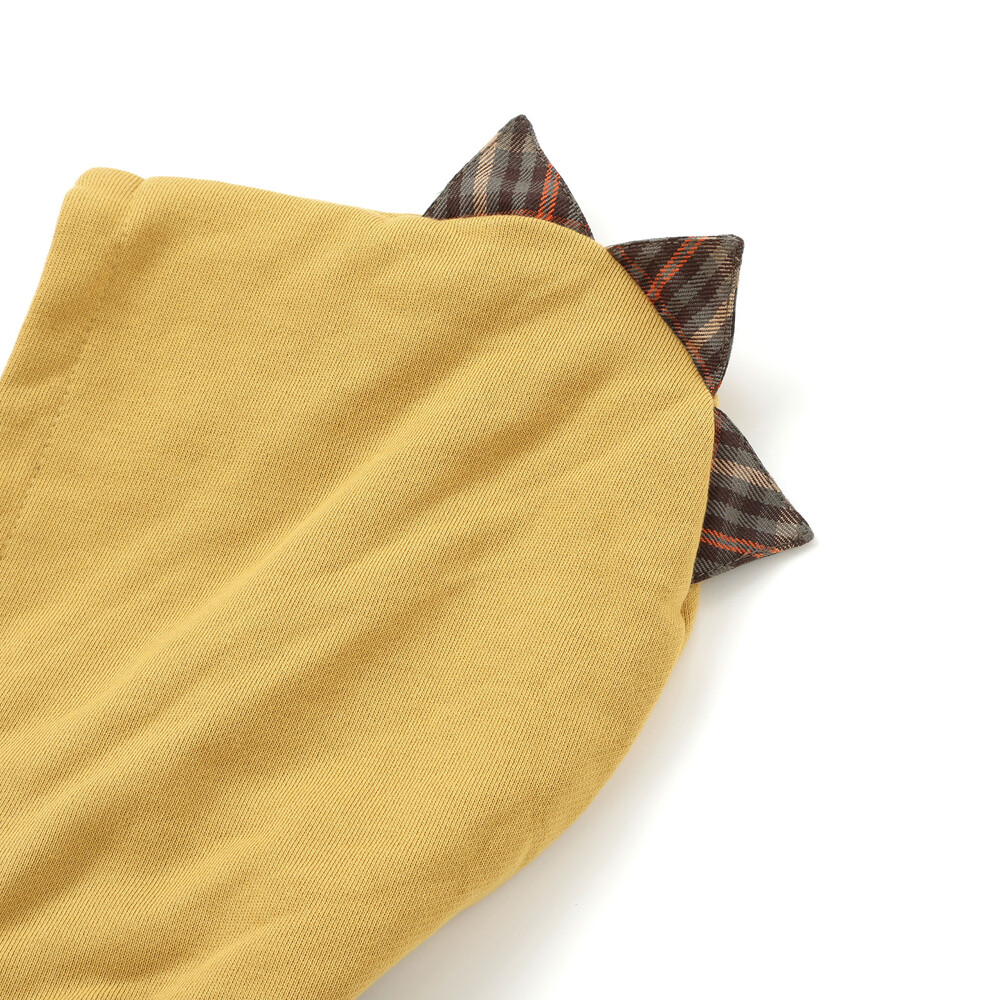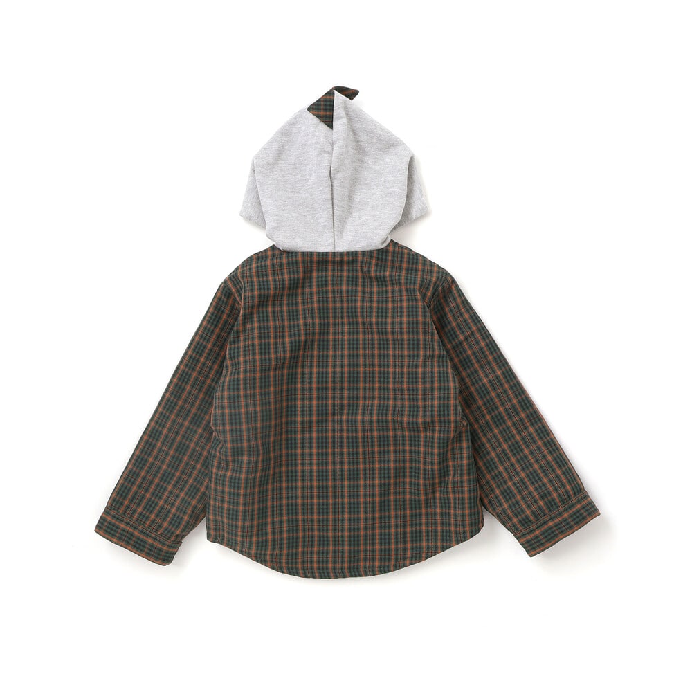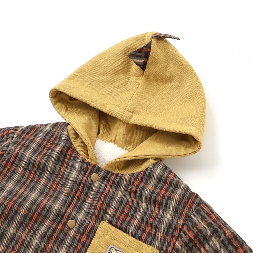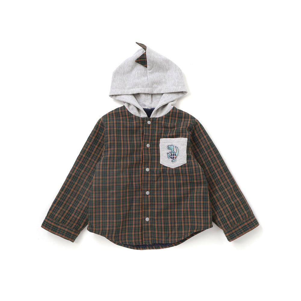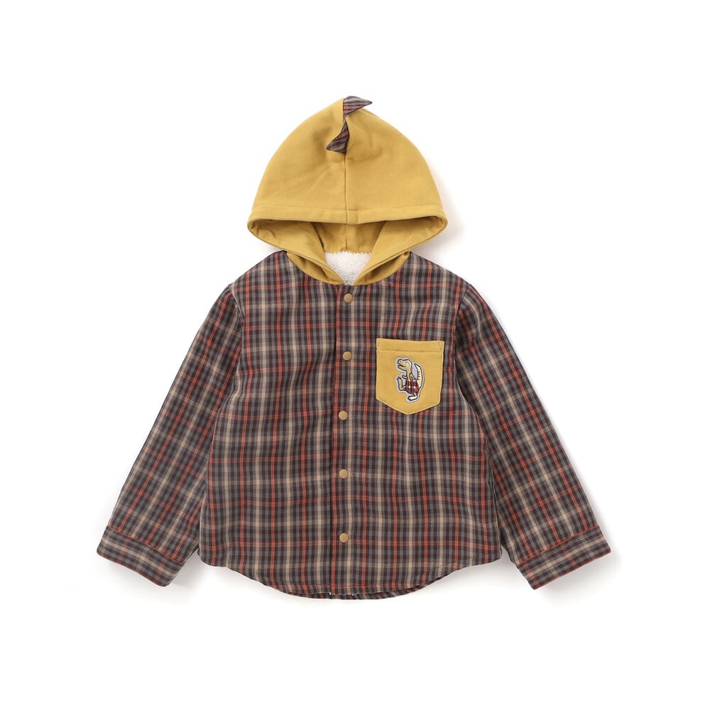 フードにはチェックの恐竜トサカ付きで、遊び心たっぷり。