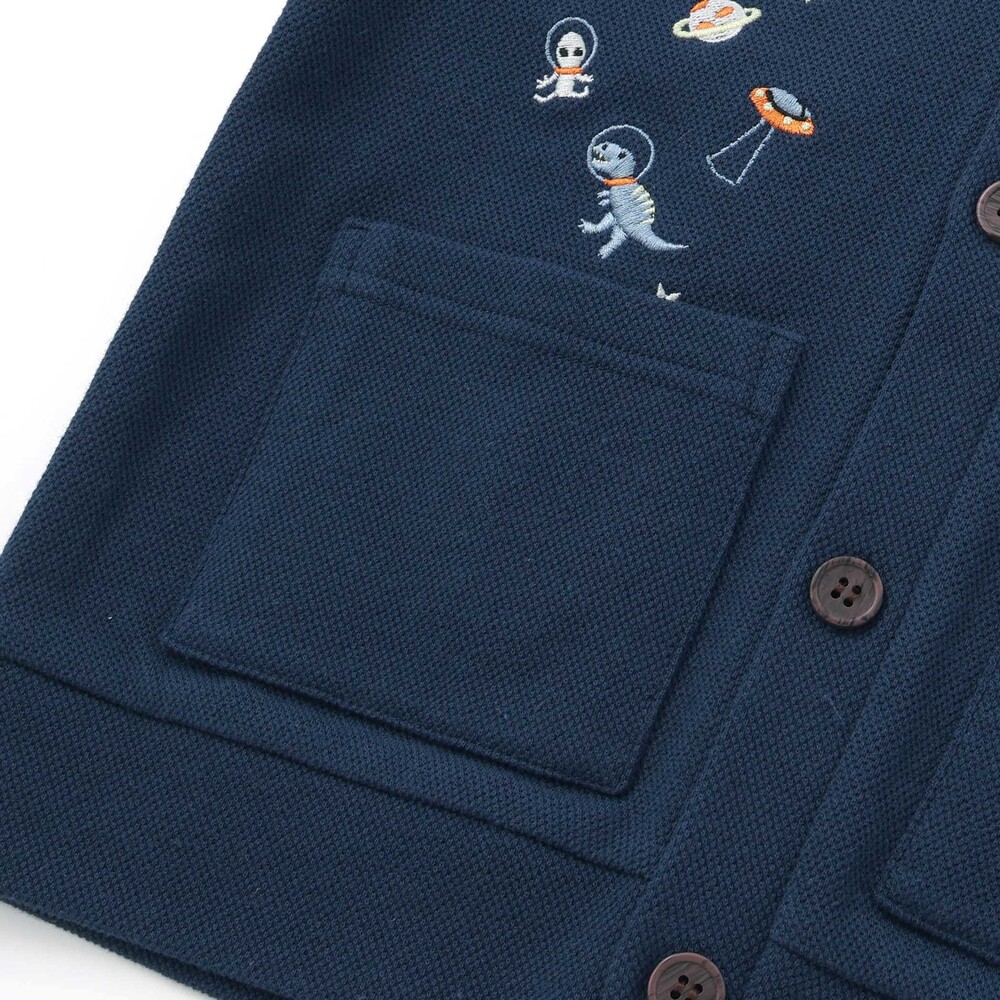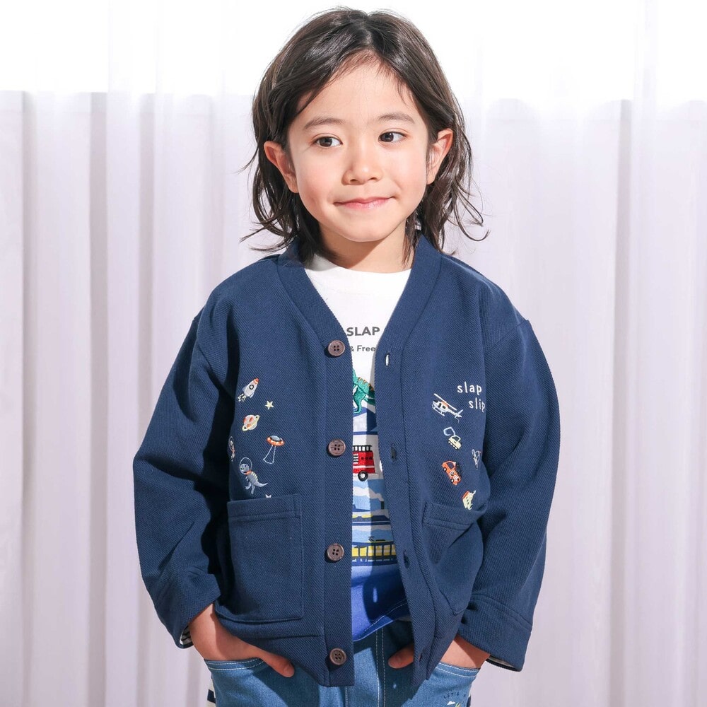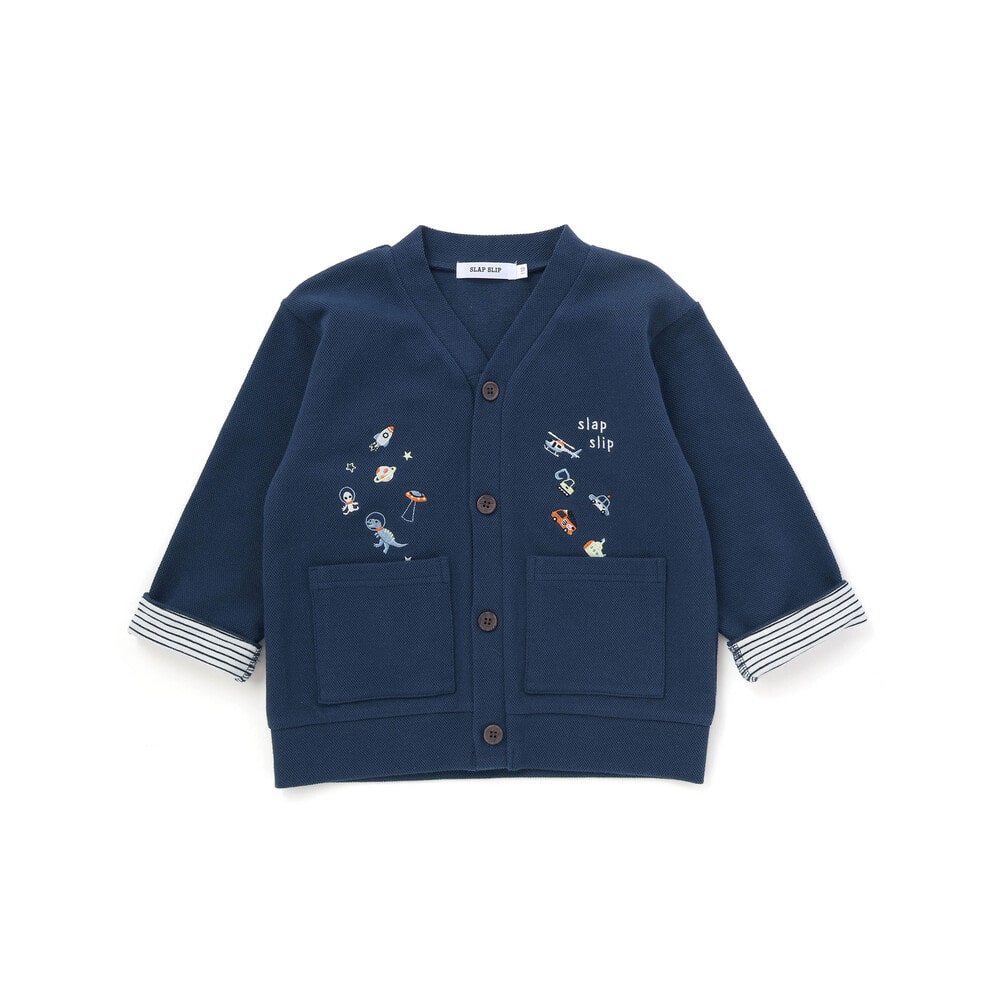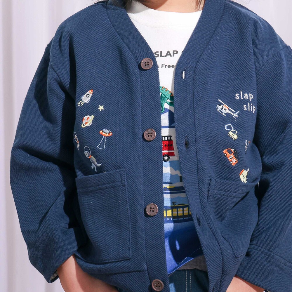 恐竜や宇宙船、くるまなど、男の子が大好きなモチーフの刺しゅうをたっぷり散りばめた、遊び心あふれるVネックカーディガン。