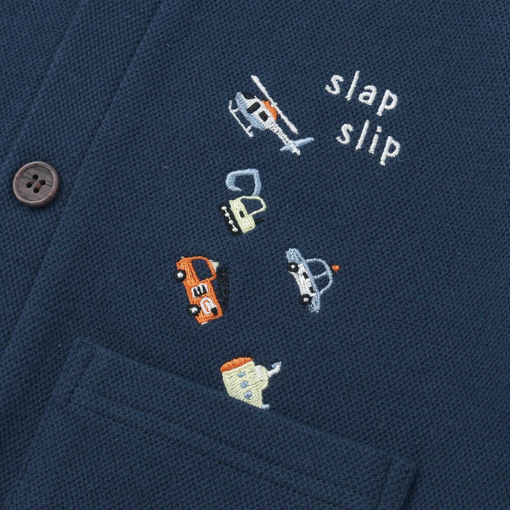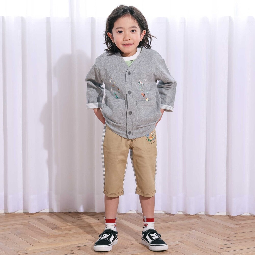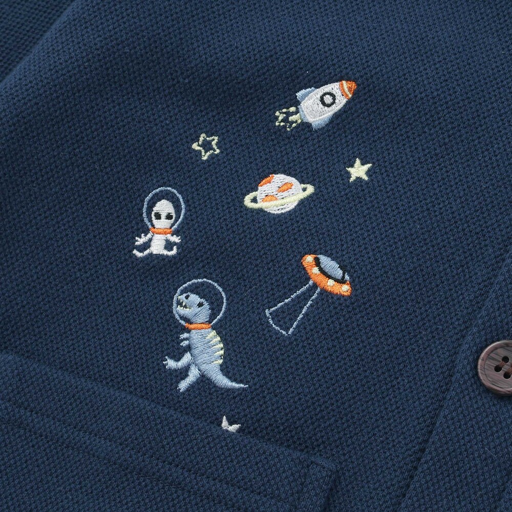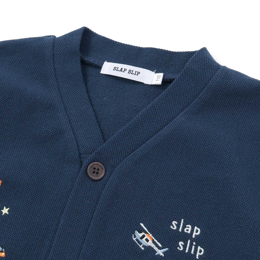 恐竜や宇宙船、くるまなど、男の子が大好きなモチーフの刺しゅうをたっぷり散りばめた、遊び心あふれるVネックカーディガン。