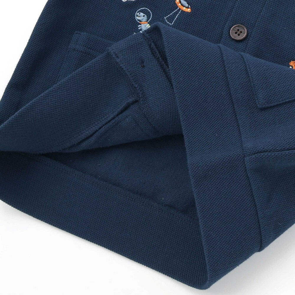 フロントのポケットから恐竜や宇宙船、くるまがひょっこり飛び出しているように見える刺しゅうデザインが、思わず『かっこいい!』と言いたくなる、遊び心あふれるポイントです。