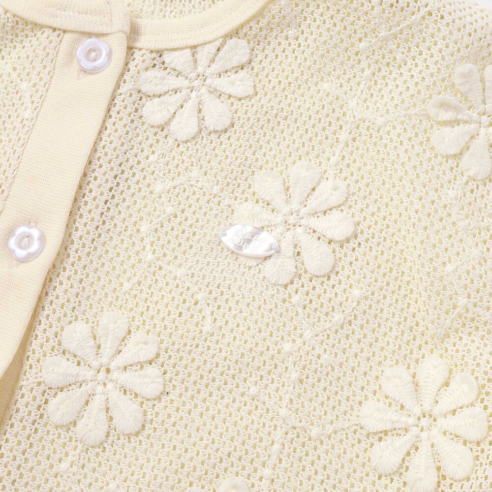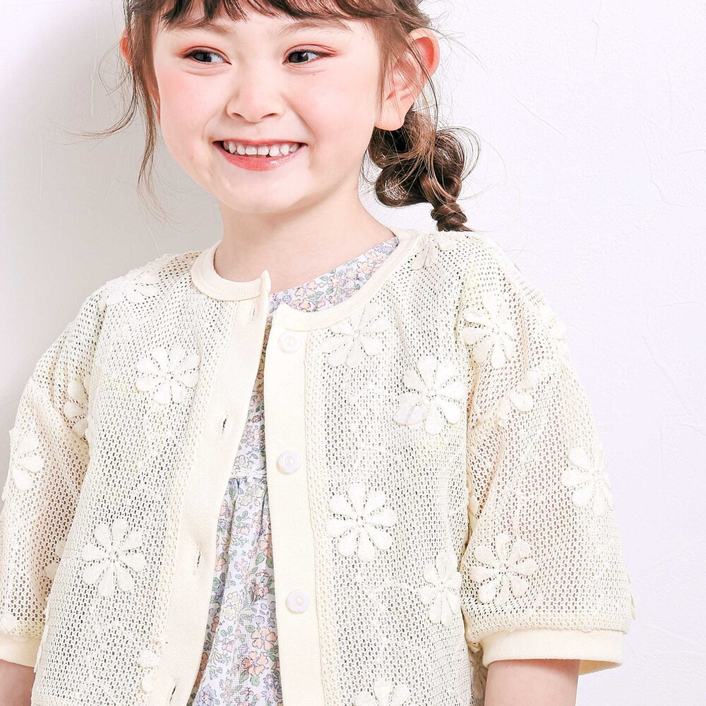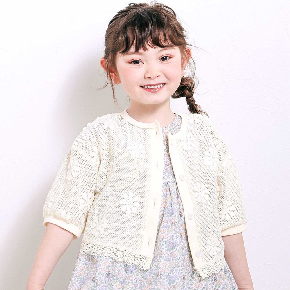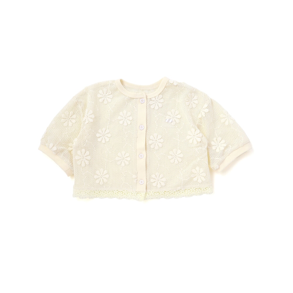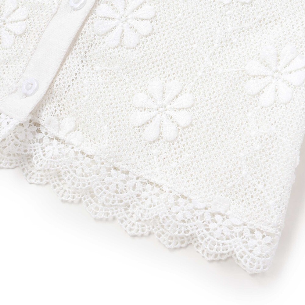 花モチーフを散りばめたニットレースが、やさしく華やかな雰囲気を演出してくれる女の子用カーディガン。