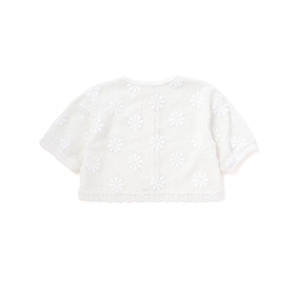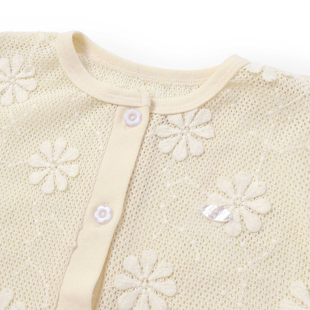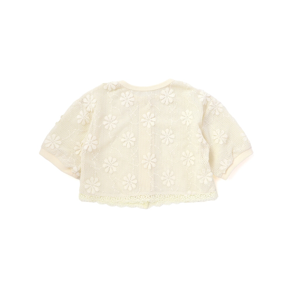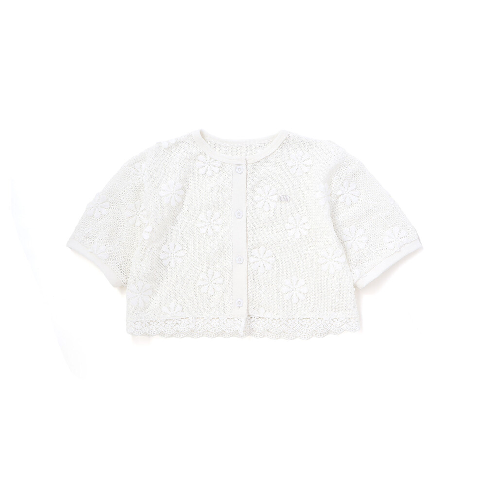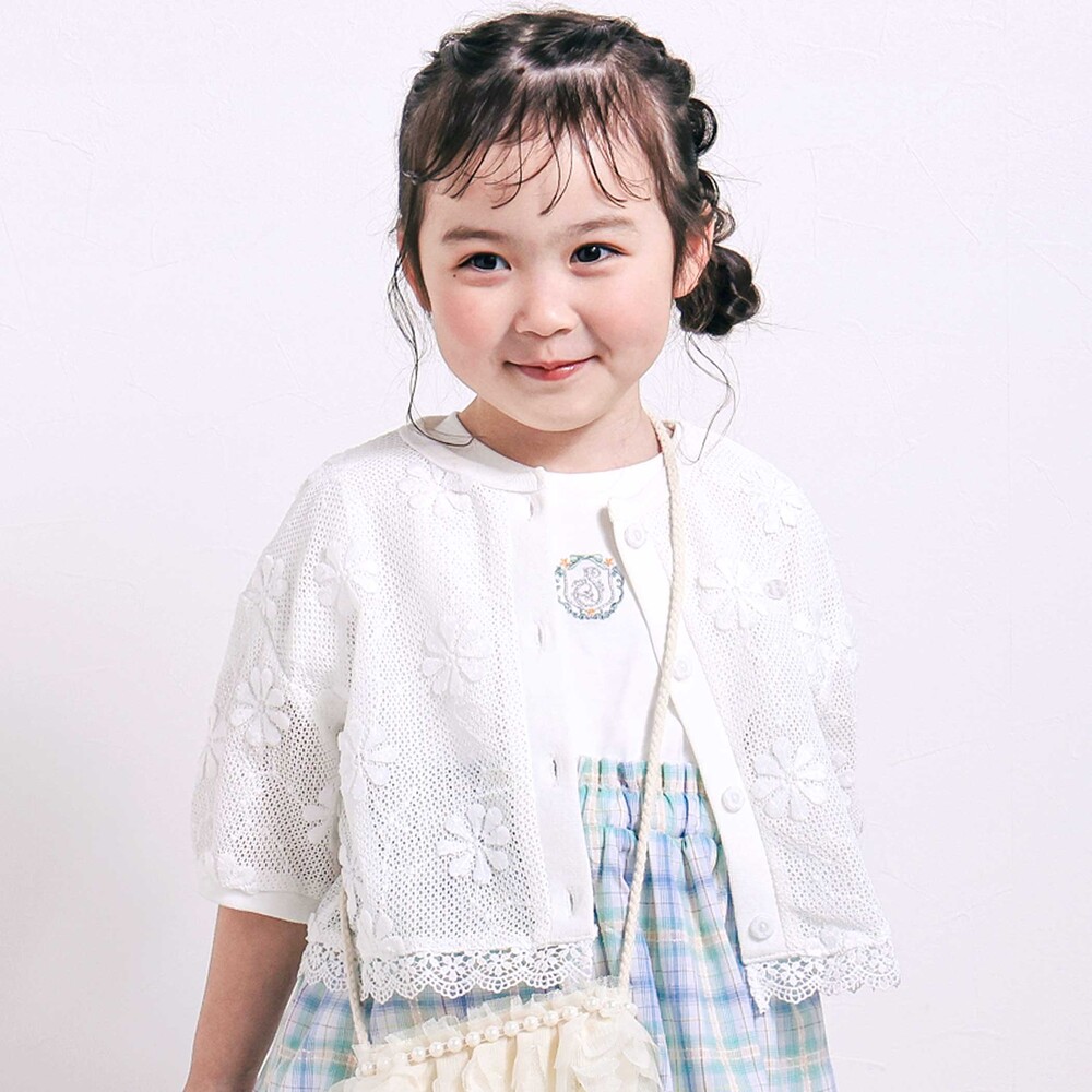 花モチーフを散りばめたニットレースが、やさしく華やかな雰囲気を演出してくれる女の子用カーディガン。